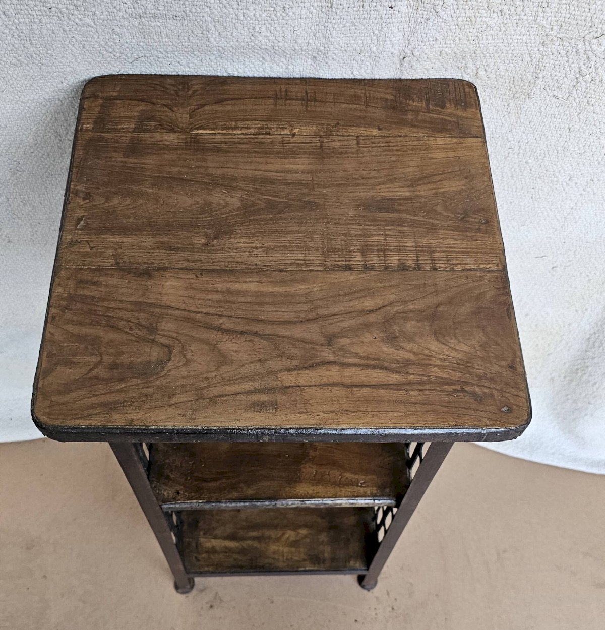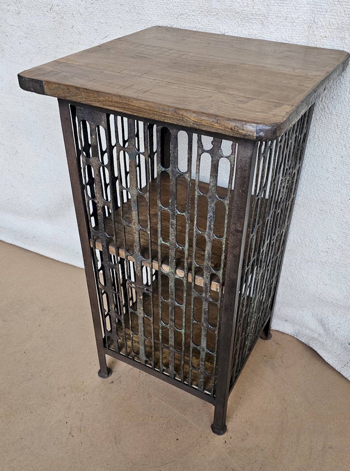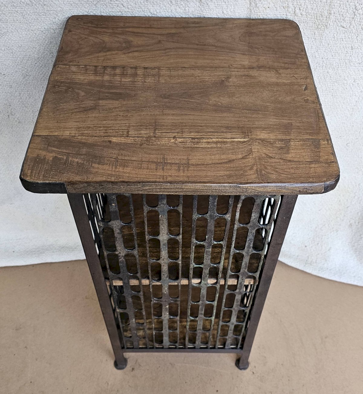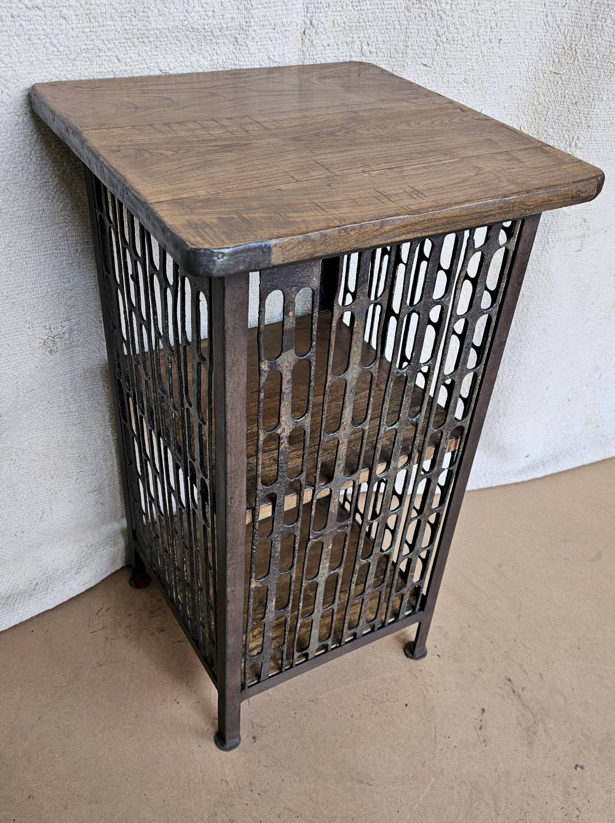 Chevet - guéridon en fer forgé et teck / beau travail ancien de maillage de forge / 37 x 37 x 66 cm - 15 kg / hauteurs intérieures de haut en bas: 24-26 cm
