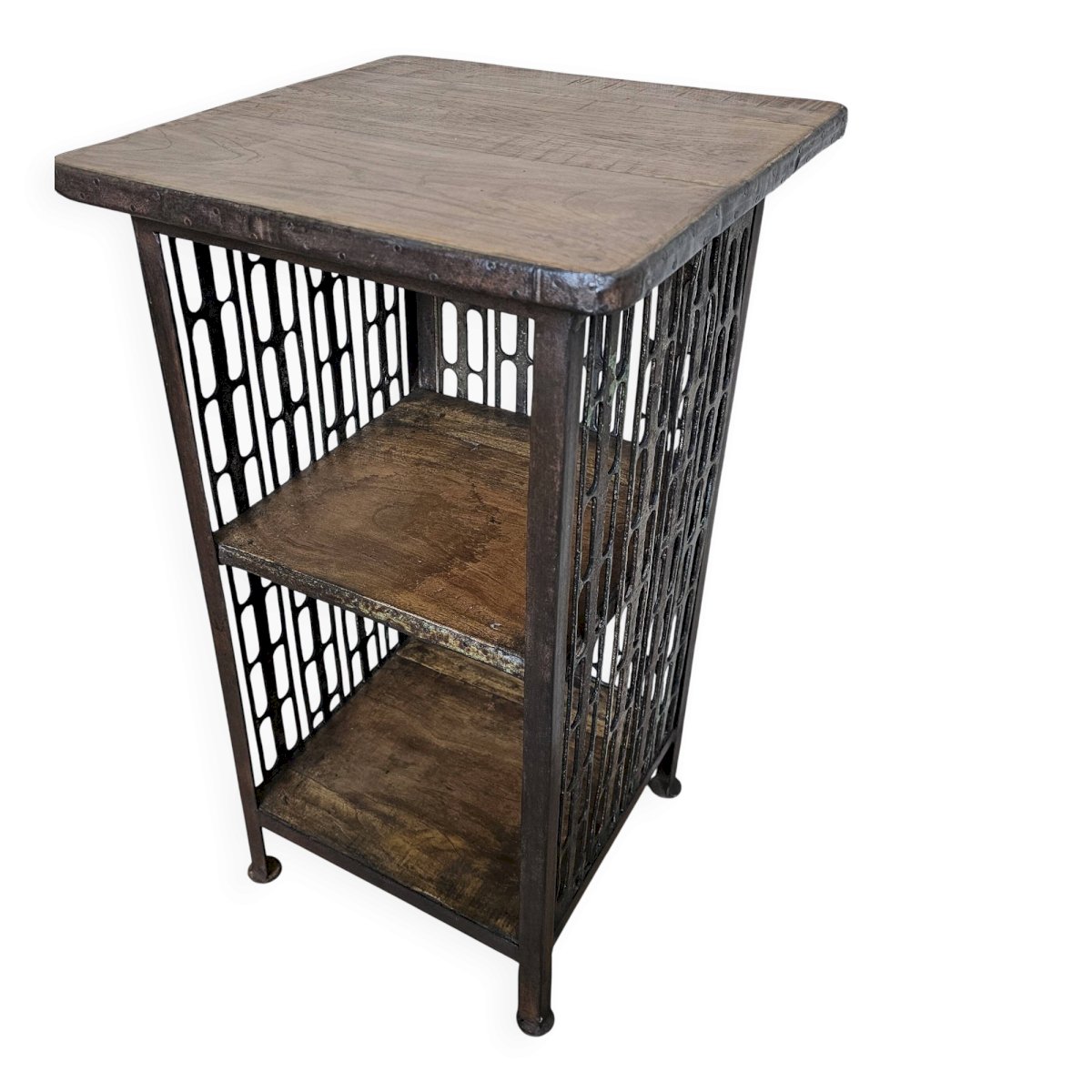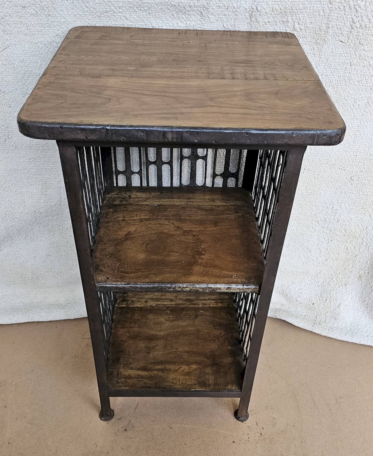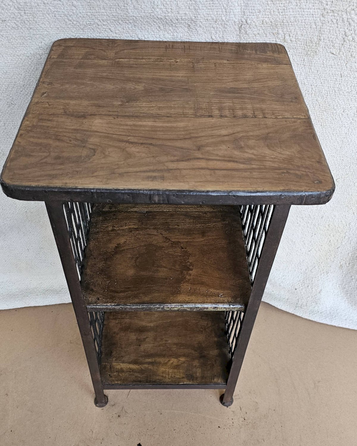 Chevet - guéridon en fer forgé et teck / beau travail ancien de maillage de forge / 37 x 37 x 66 cm - 15 kg / hauteurs intérieures de haut en bas: 24-26 cm