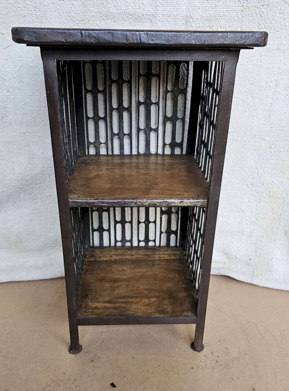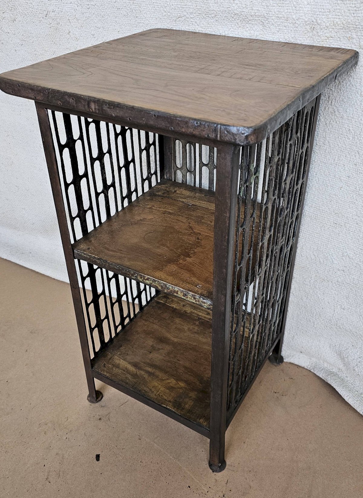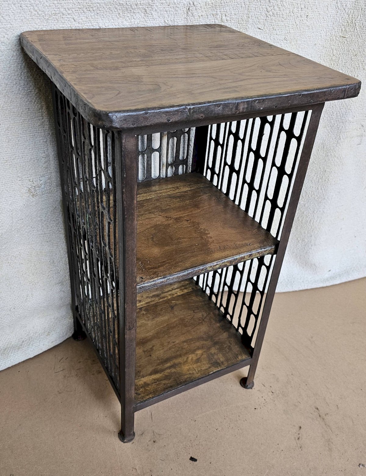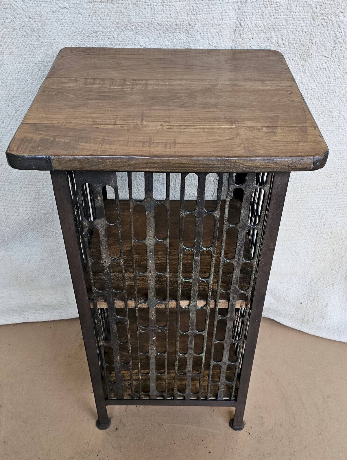 Chevet - guéridon en fer forgé et teck / beau travail ancien de maillage de forge / 37 x 37 x 66 cm - 15 kg / hauteurs intérieures de haut en bas: 24-26 cm