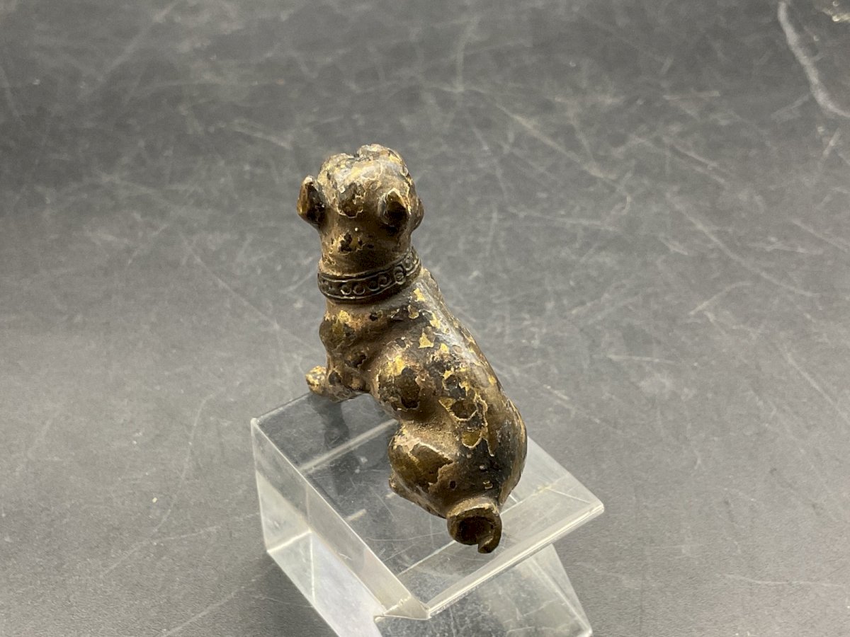 chien en bronze de Vienne   Austrian Wien cold painted bronze  Dog Longueur x largeur x hauteur : 4x1,5cm sur 3,5cm Poids: 42,5g Authenticité:Original Type:Objet de vitrine, Décoratif Origine:Autriche Sous-type:Sculpture Style:19eme Matière:plomb