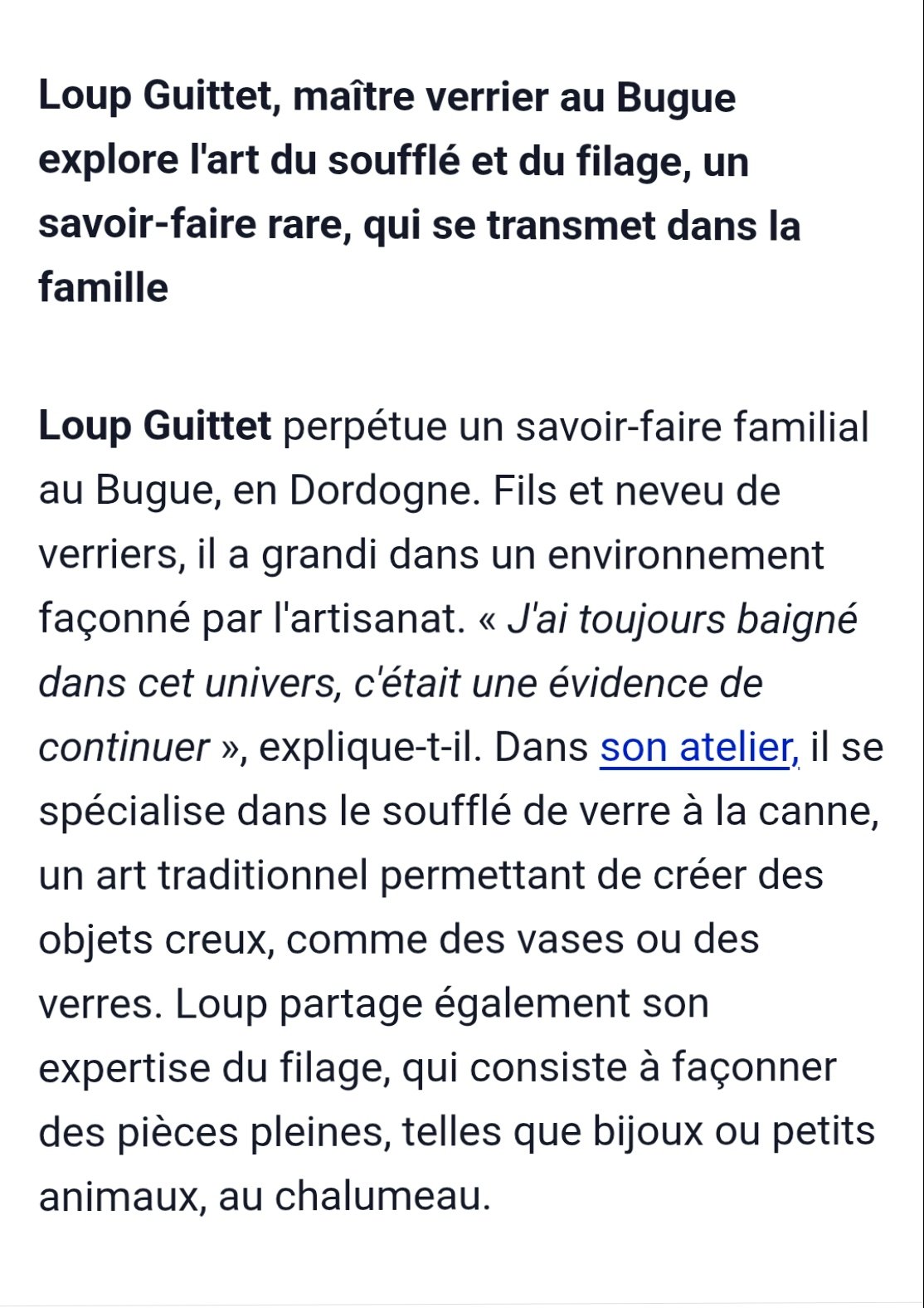​Artiste : Loup Guittet, maître verrier au Bugue (Dordogne), artisan en activité.