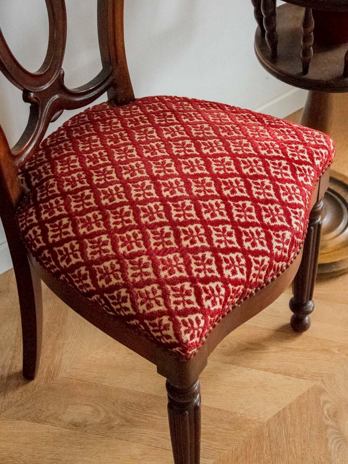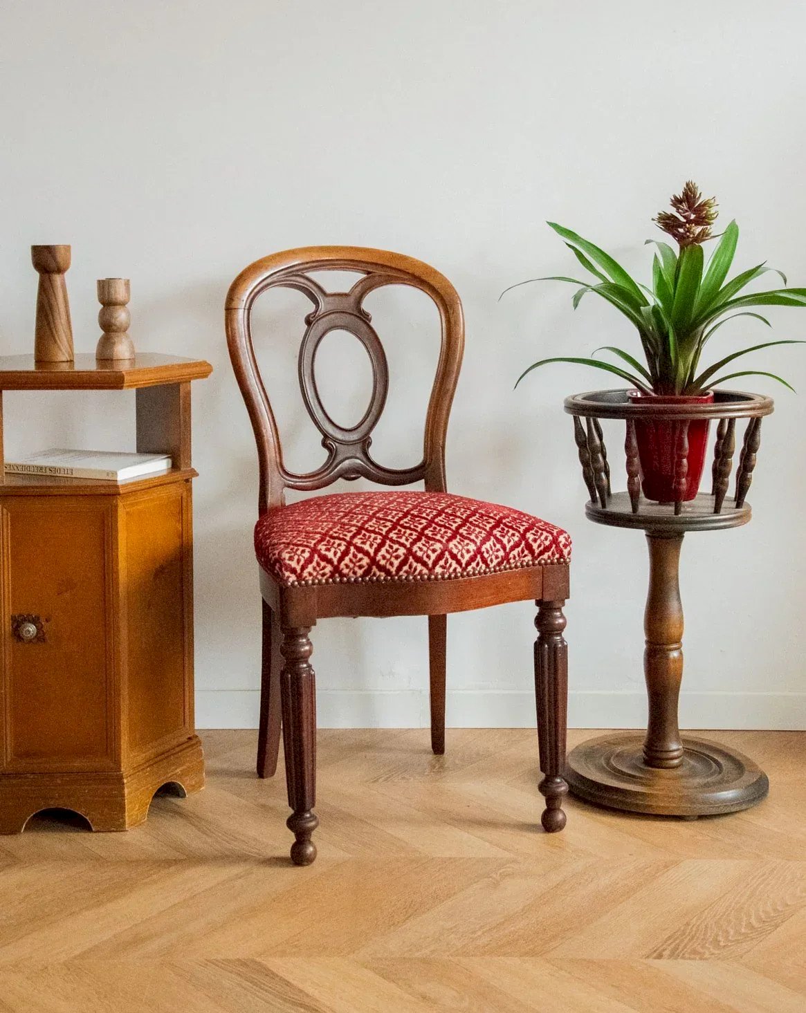 Adoptez cette chaise style campagne au charme Louis-Philippe, habillée d'une tapisserie d'origine rouge et beige et sculptée dans un bois foncé chaleureux. Son dossier arrondi et ses pieds en sabre finement travaillés dessinent une silhouette élégante tandis que l'assise, au format équilibré, offre un confort adapté à la salle à manger ou à un coin lecture. Pièce d'appoint poétique, elle apporte une ambiance authentique et raffinée à une entrée ou un intérieur classique. Longueur : 47 cm Largeur : 44 cm Hauteur : 87 cm Hauteur d'assise : 47 cm État:Occasion: Objet ayant été utilisé. Objet présentant quelques marques d'usure superficielle, ...Occasion: Objet ayant été utilisé. Objet présentant quelques marques d'usure superficielle, entièrement opérationnel et fonctionnant correctement. Il peut s'agir d'un modèle de démonstration ou d'un objet retourné en magasin après une courte période d'utilisation. les éventuelles imperfections. Couleur:Multicouleur Hauteur:Bois, Tissu Largeur:Chaises Marque:Debongout Type:Produit chiné Matériau:Bois, Tissu Style:Campagne