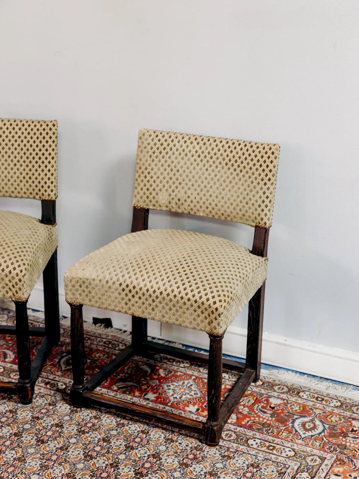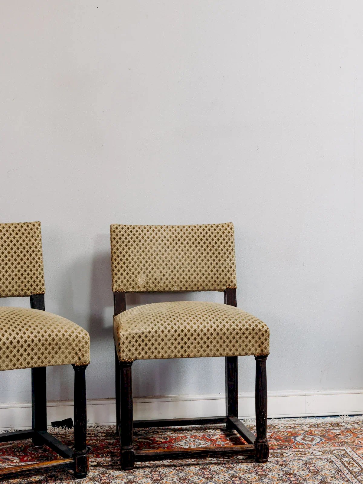 Adoptez une paire de chaises au style Art déco, animée par une structure en bois foncé aux lignes généreuses et un piétement traîneau élégant. L’assise et le dossier ont été recouverts d’un tissu vert quadrillé remis à neuf, offrant un confort soigné et une allure graphique qui dialogue avec la noblesse du bois. Les barres de liaison basses assurent une stabilité rassurante, tandis que leurs proportions généreuses conviennent aussi bien à une salle à manger qu’à un coin lecture, pour une ambiance rétro-chic chaleureuse. Vendues à l'unité, deux quantités sont disponibles. Longueur : 50 cm Largeur : 44 cm Hauteur : 81 cm Hauteur d'assise : 53 cm État:Occasion: Objet ayant été utilisé. Objet présentant quelques marques d'usure superficielle, ...Occasion: Objet ayant été utilisé. Objet présentant quelques marques d'usure superficielle, entièrement opérationnel et fonctionnant correctement. Il peut s'agir d'un modèle de démonstration ou d'un objet retourné en magasin après une courte période d'utilisation. les éventuelles imperfections. Couleur:Multicouleur Hauteur:Bois, Tissu Largeur:Chaises Marque:Debongout Type:Produit chiné Matériau:Bois, Tissu Style:Campagne