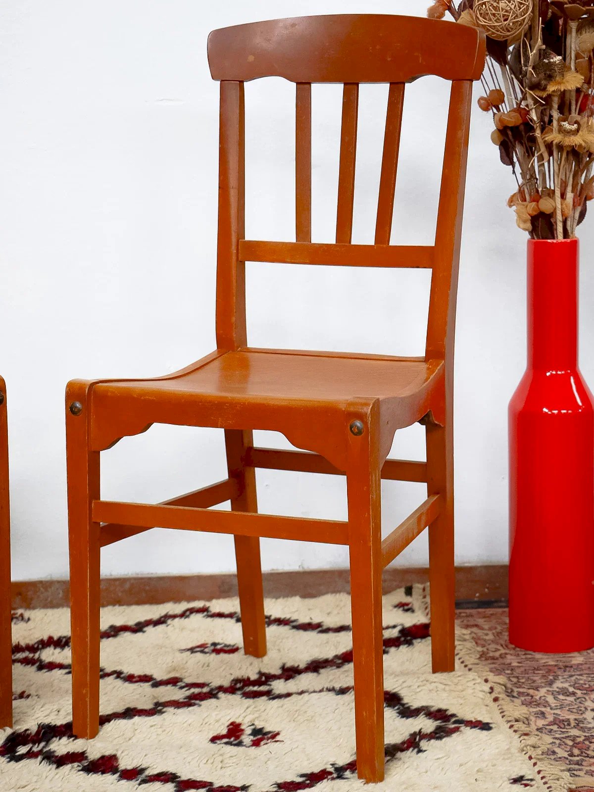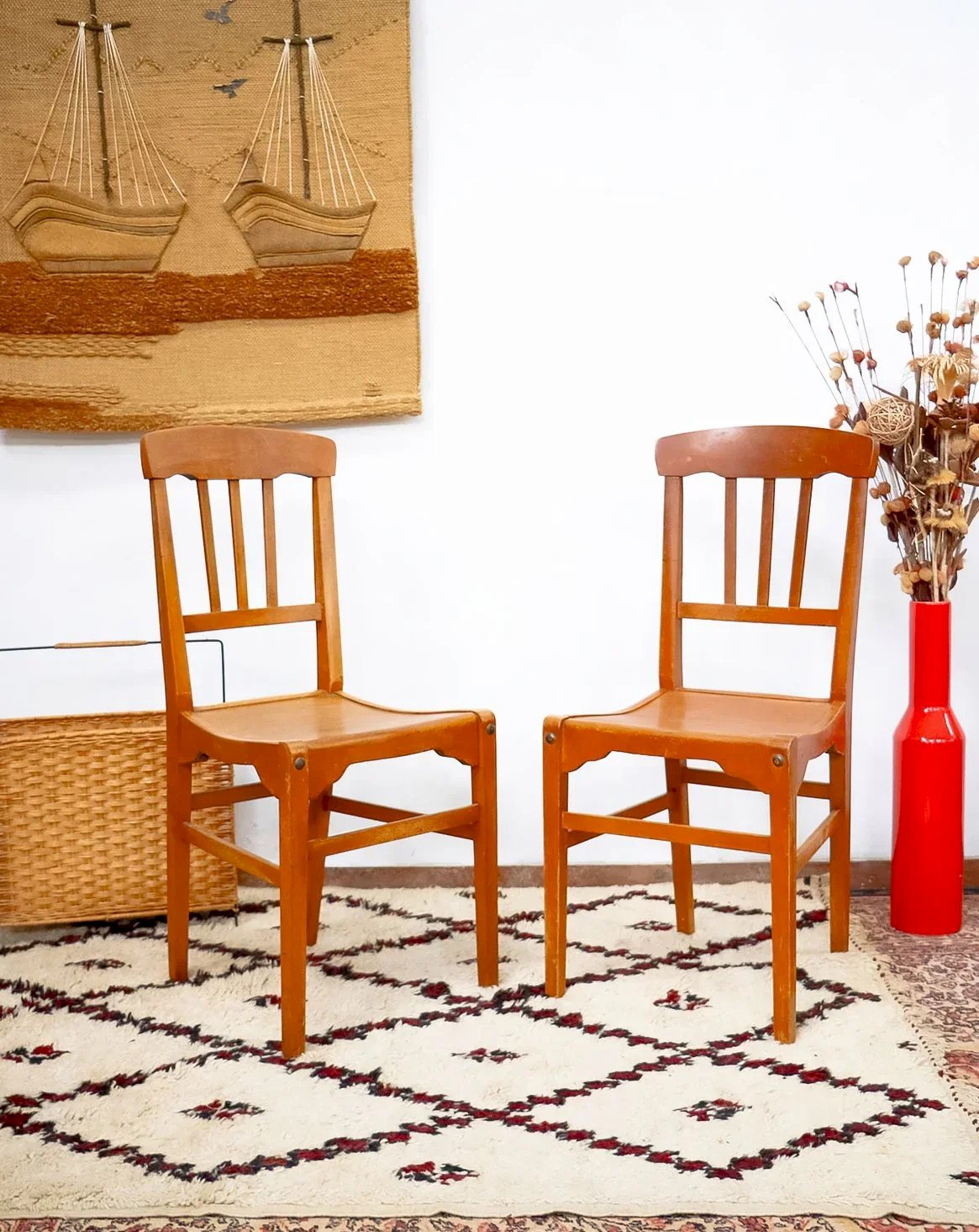 Découvrez la paire de chaises Stella, créations françaises des années 50 en hêtre massif au bois clair, dont la silhouette élancée traduit l'élégance sobre de l'époque. L'assise gaufrée et la hauteur d'assise généreuse assurent un confort immédiat, adaptées à une table à manger ou à un coin bureau cosy. Leurs proportions équilibrées apportent une présence légère et chaleureuse à la pièce, idéale pour un intérieur contemporain ou classique. Patine légèrement passée. Largeur : 40,5 cm Largeur de l'assise : 36 cm Hauteur : 89,5 cm Hauteur d'assise : 45 cm Profondeur : 44 cm Profondeur de l'assise : 36 cm État:Occasion: Objet ayant été utilisé. Objet présentant quelques marques d'usure superficielle, ...Occasion: Objet ayant été utilisé. Objet présentant quelques marques d'usure superficielle, entièrement opérationnel et fonctionnant correctement. Il peut s'agir d'un modèle de démonstration ou d'un objet retourné en magasin après une courte période d'utilisation. les éventuelles imperfections. Couleur:Multicouleur Hauteur:Hêtre Largeur:Chaises Marque:Debongout Type:Produit chiné Matériau:Hêtre Style:Campagne