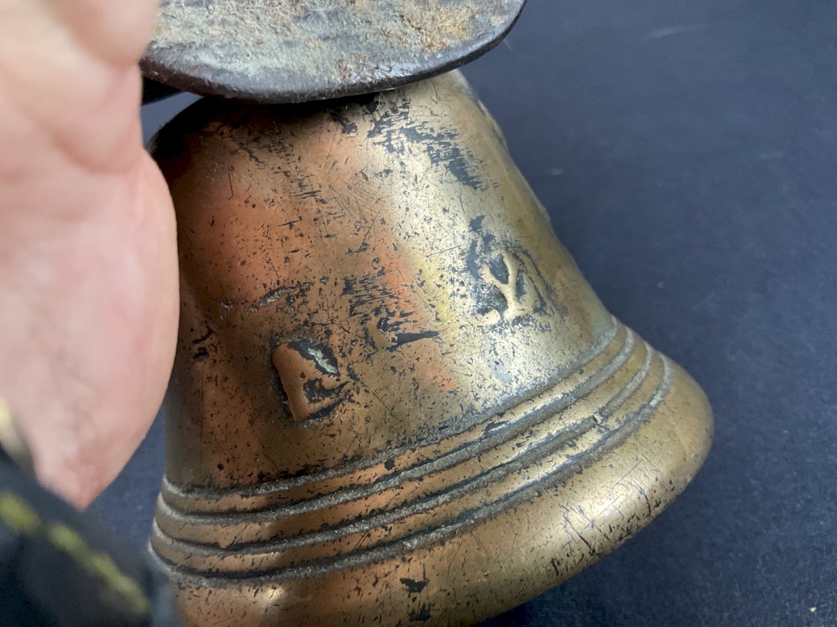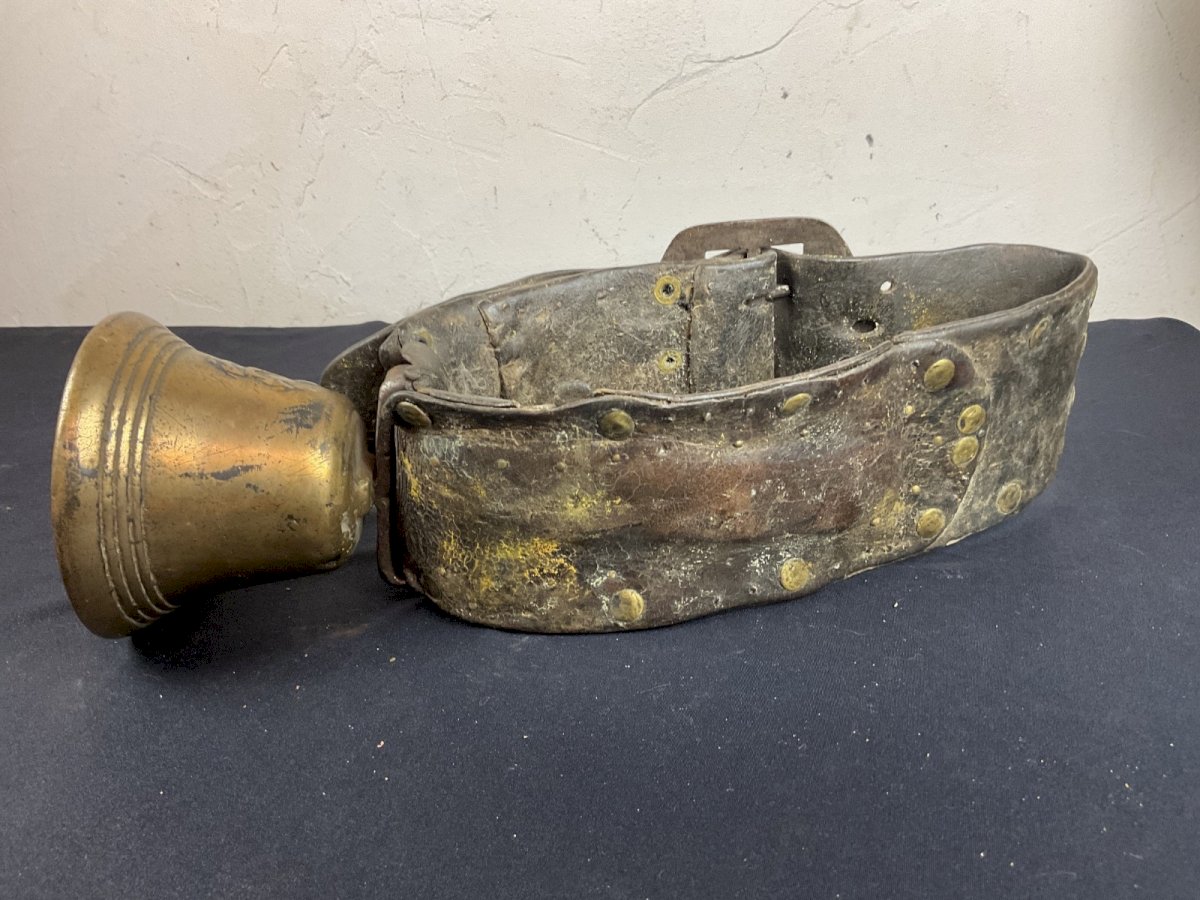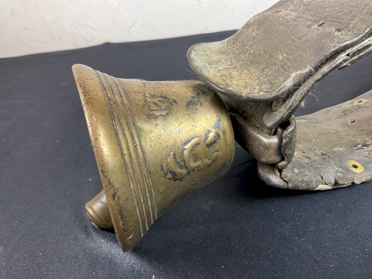 CLOCHE DE VACHE BRONZE & COLLIER CUIR , SONNAILLE ALPAGE Hauteur de cloche 9,5 cm Diamètre 10 cm Type:Objet d'art populaire Sous-type:cloche sonnailes Style:Antiquité Matière:Bronze
