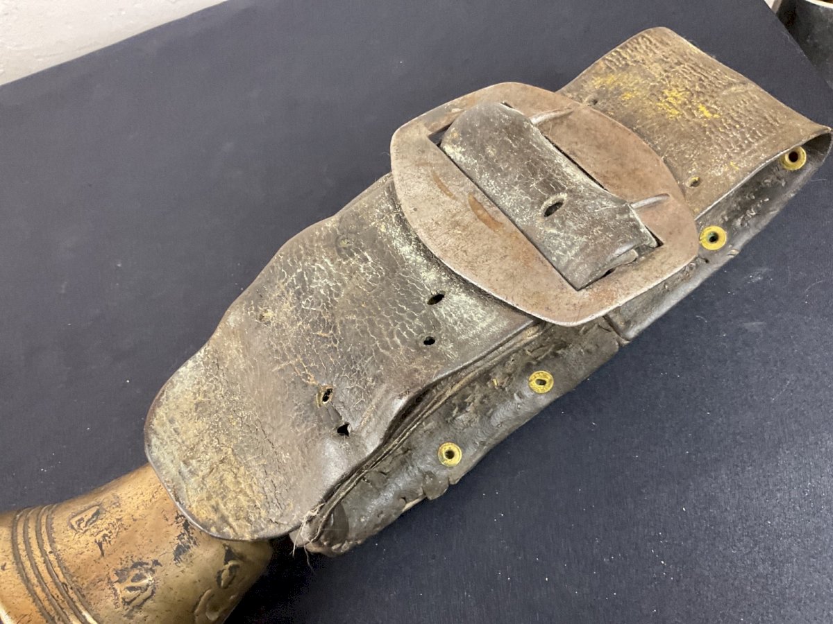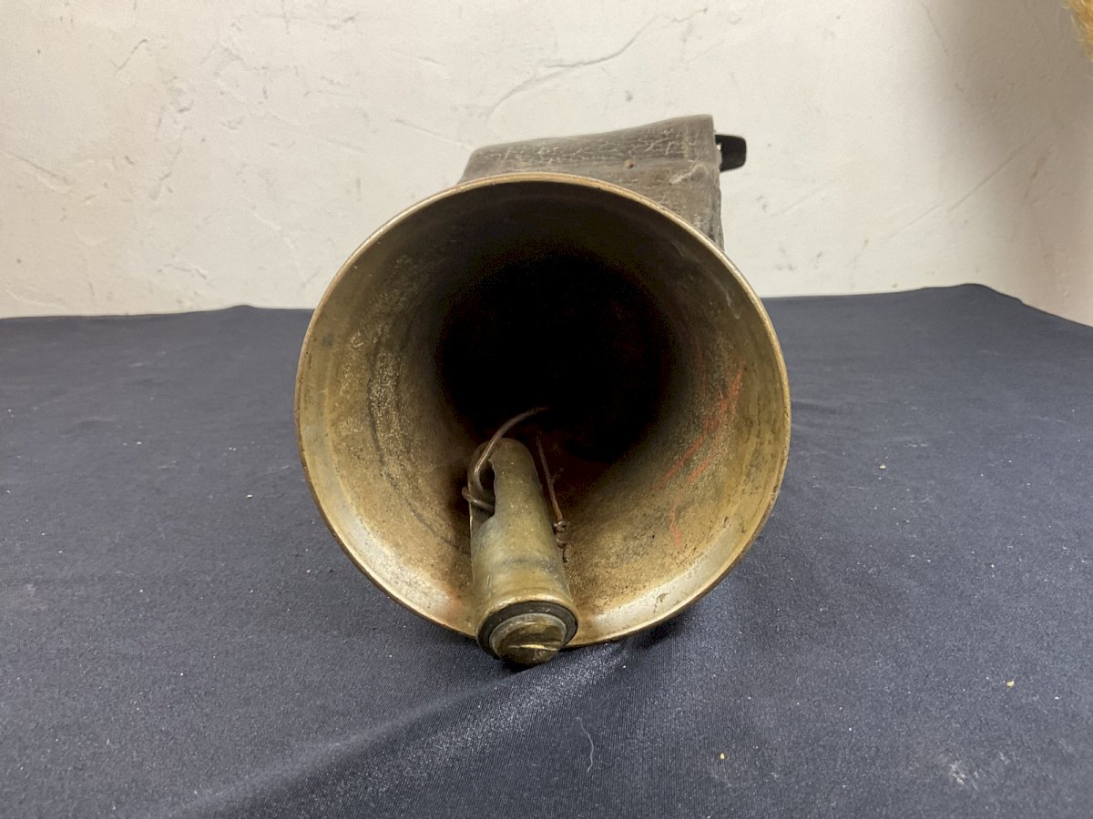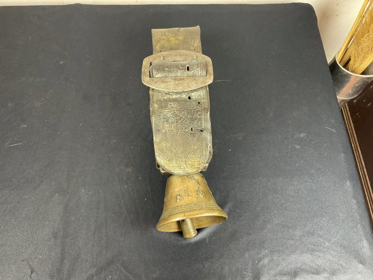 CLOCHE DE VACHE BRONZE & COLLIER CUIR , SONNAILLE ALPAGE Hauteur de cloche 9,5 cm Diamètre 10 cm Type:Objet d'art populaire Sous-type:cloche sonnailes Style:Antiquité Matière:Bronze