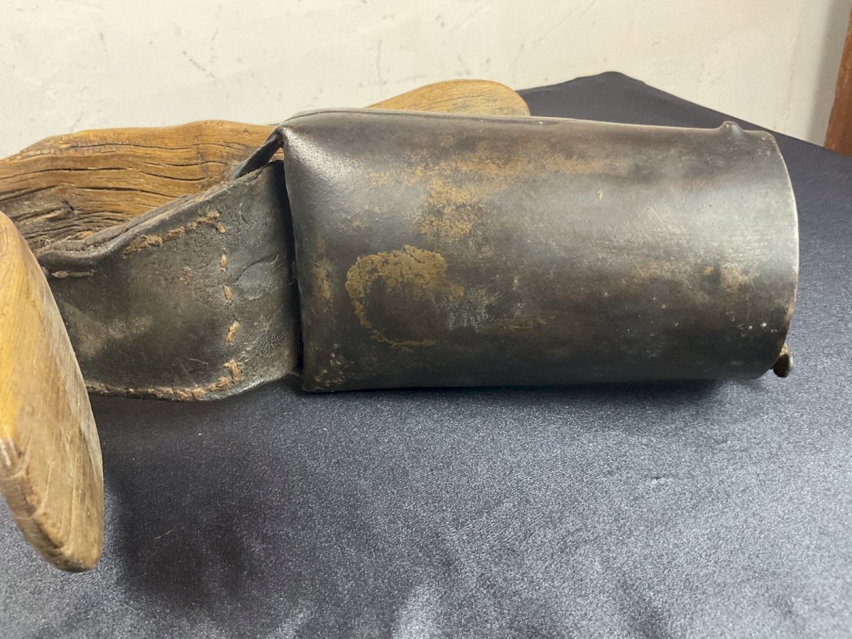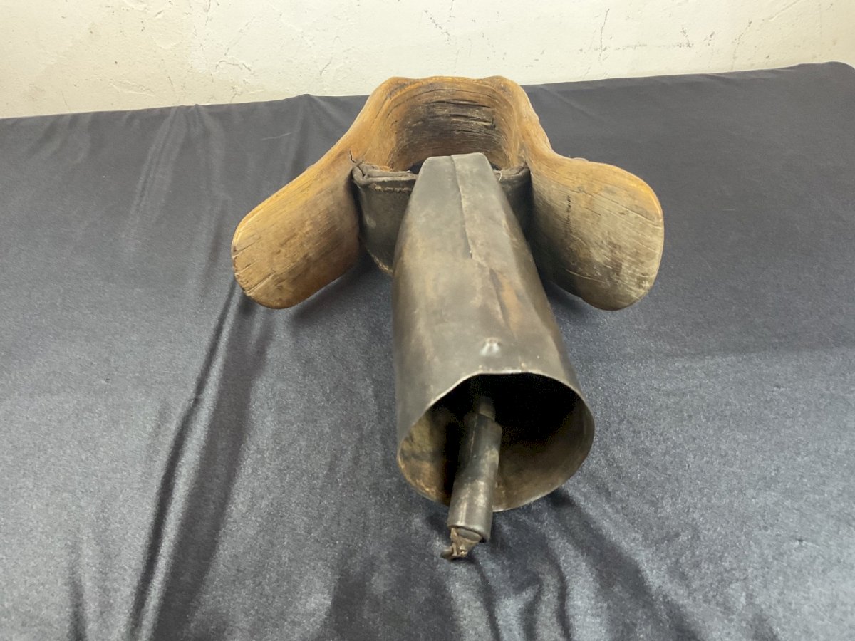 Cloche - Sonnaille de chèvre ancienne bois gravé Hauteur total : 34 cm Hauteur de la cloche : 17 cm Authenticité:Original Marque:LR Type:Objet d'art populaire Période:Design du XXème Origine:France Sous-type:Cloche Matière:Métal cuir bois Style:Non-spécifié
