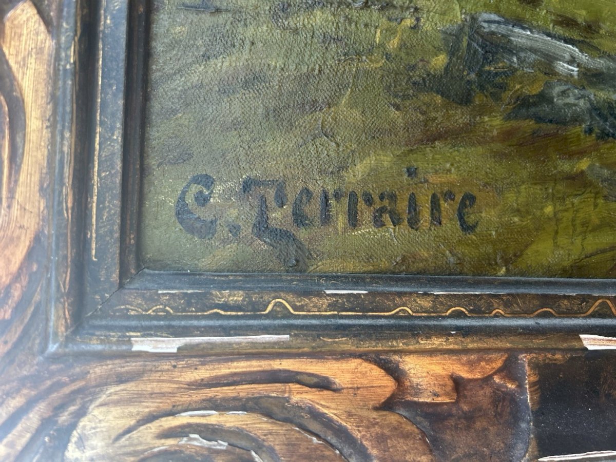 Superbe huile sur toile XIXeme de Clovis TERRAIRE représentant des vaches en alpage dans le Massif du Mont-Blanc avec vu du glacier de Taconnaz. Signé en bas à gauche Dimensions avec cadre 93,3 x73 cm Dimensions toile 81 x 60 cm Tableau situé au dos. Clovis Frédéric Léopold Terraire est le fils de Toussaint Frédéric Terraire et de Victorine Ladoux. En 1884, il épouse Marie Albertine Cnudde, artiste lyrique, le couple vit à Lyon. Il expose au Salon de Lyon ainsi qu'au Salon des artistes français, recevant une mention honorable en 1905, une médaille de troisième classe en 1908, et remportant le Prix Rosa-Bonheur en 1927[2]. Courant artistique:École française Pays d'origine:France Genre:Réalisme Caractéristiques:Signé, Encadré, Sur toile Thème:Paysage