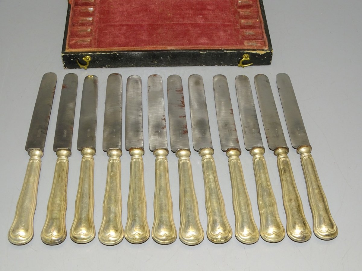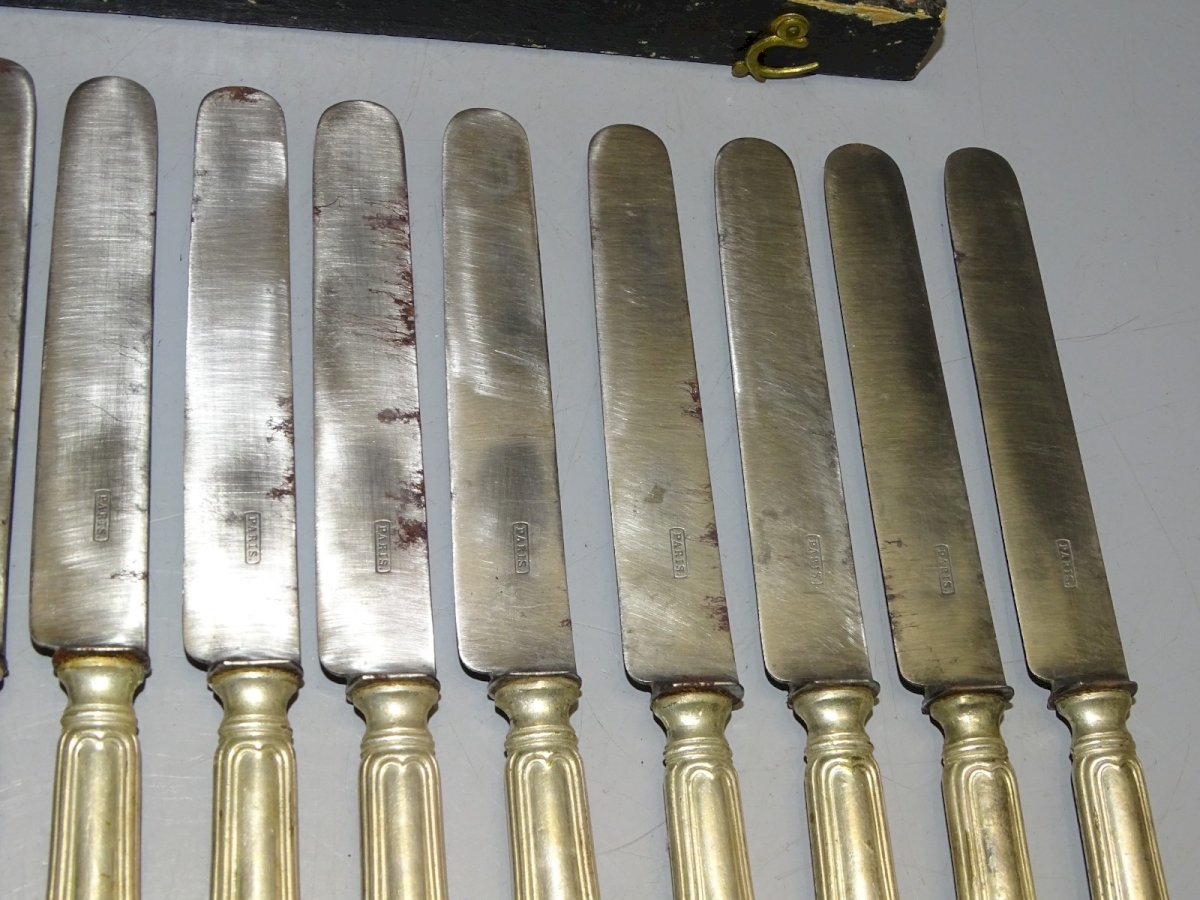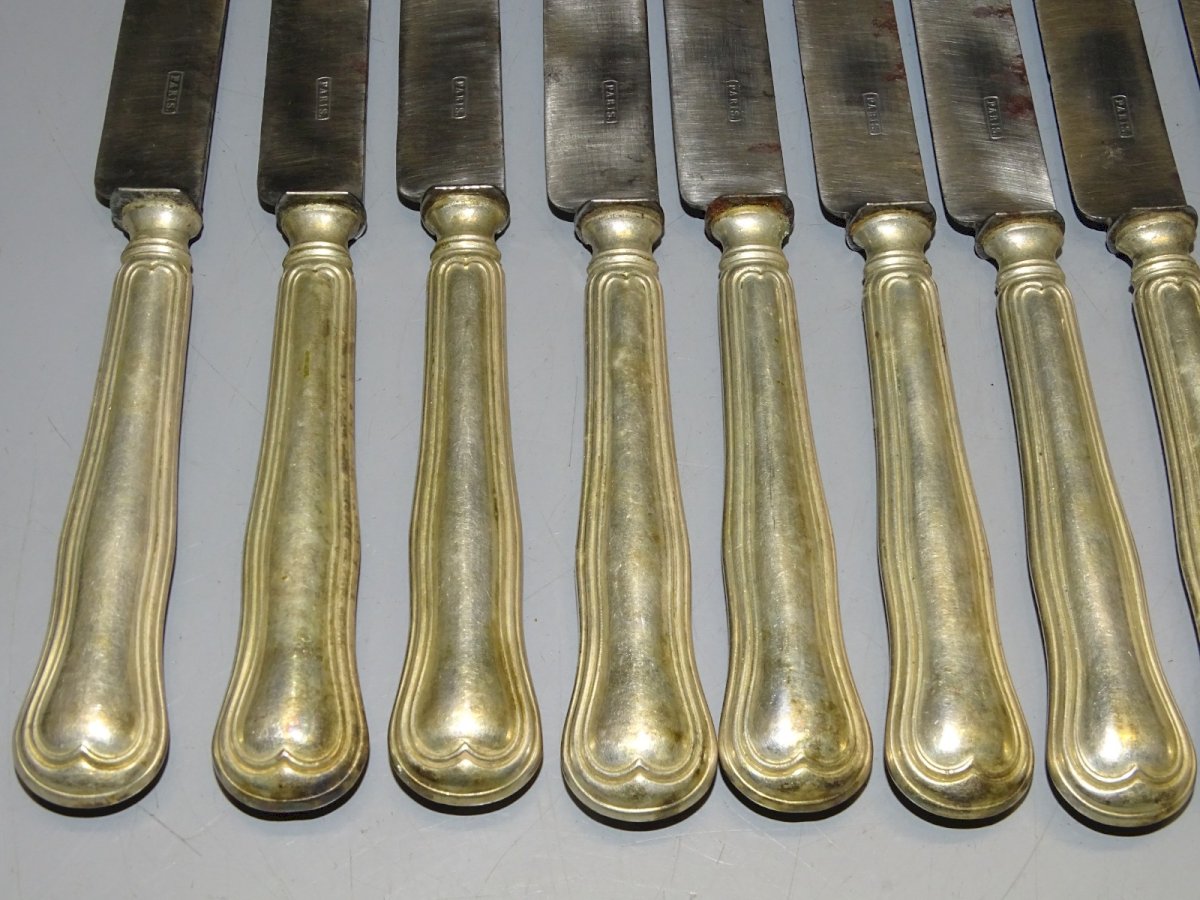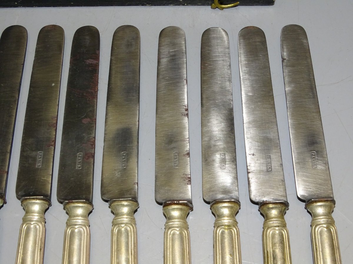 -COFFRET 12 COUTEAUX LAMES Gravées PARIS MANCHES Métal Argenté jus Grenier D