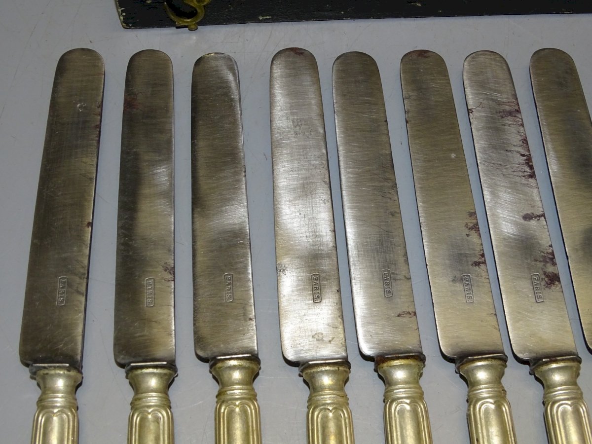 Coffret 12 petits couteaux manches métal argenté lames gravées PARIS - lames avec traces de rouille - coffret avec usures  ( voir photos ) - jus de trouvailles,  sortis de grenier  -  Réf.42141025/28  -  Coffret 22 x 12,2 cm Hauteur 3,6 cm - Couteaux Longueur 20,4 cm - Poids Total  730  g   -   EXPEDITION en Mondial Relay OU Colissimo possible sur demande   EMBALLAGE GARANTI très protecteur  MERCI de BIEN REGARDER TOUTES les PHOTOS car ELLES FONT PARTIE INTEGRANTE de la DESCRIPTION et PERMETTENT de VOIR l'OBJET AU MIEUX - Sous-type:Coffret Matière:Métal argenté