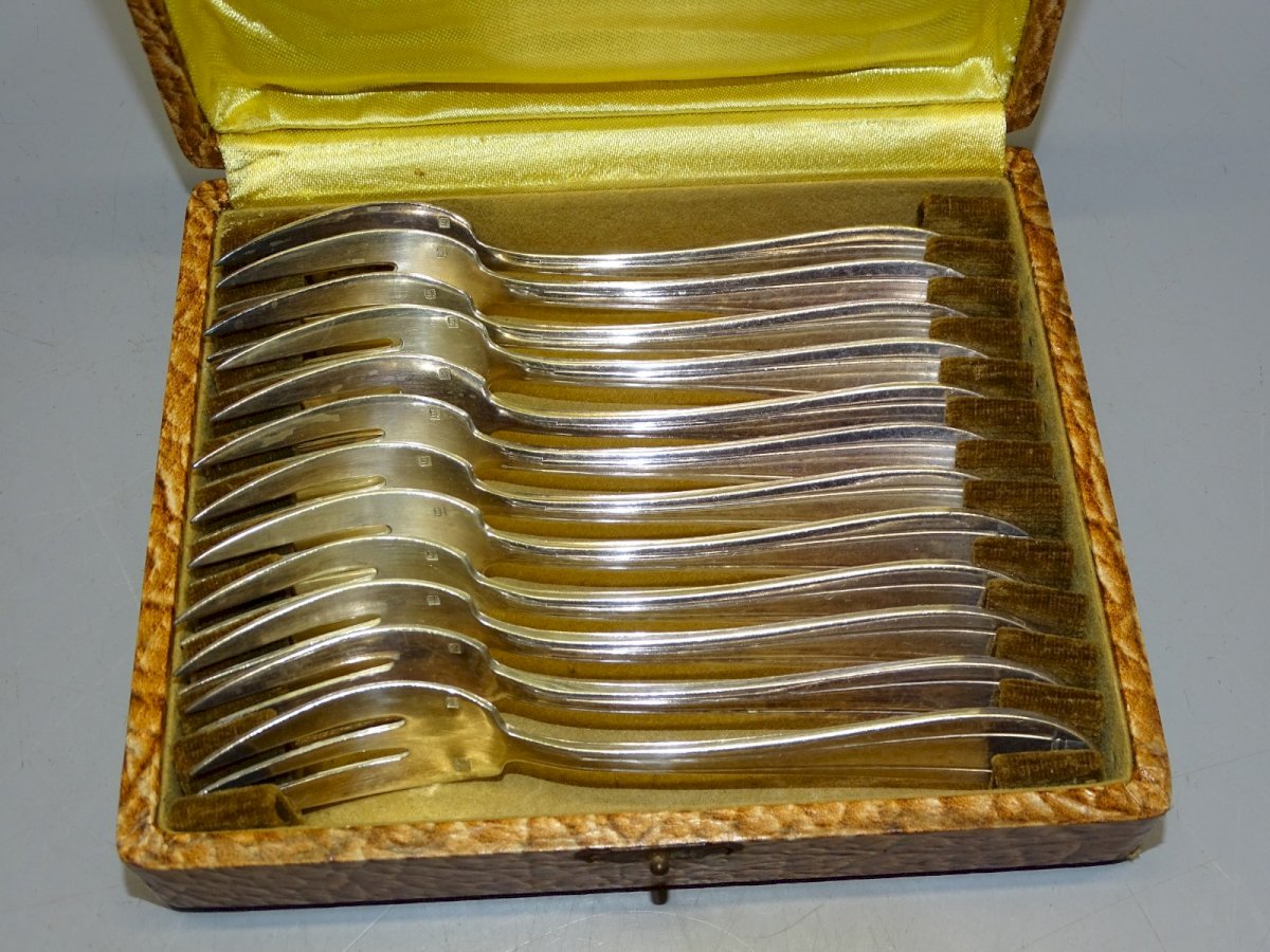 -COFFRET 12 PETITES FOURCHETTES A GATEAUX METAL ARGENTE COUVERTS DIXI 18g D