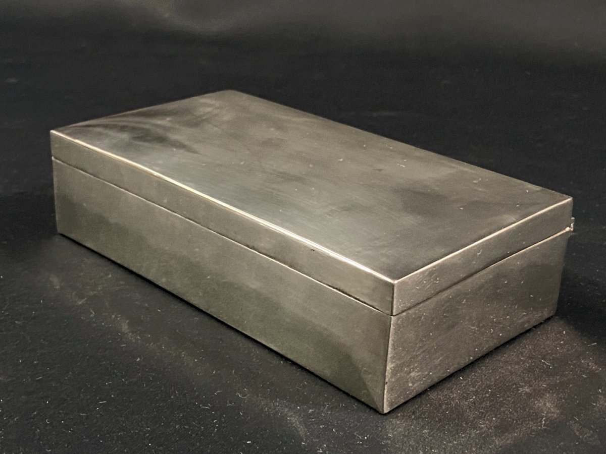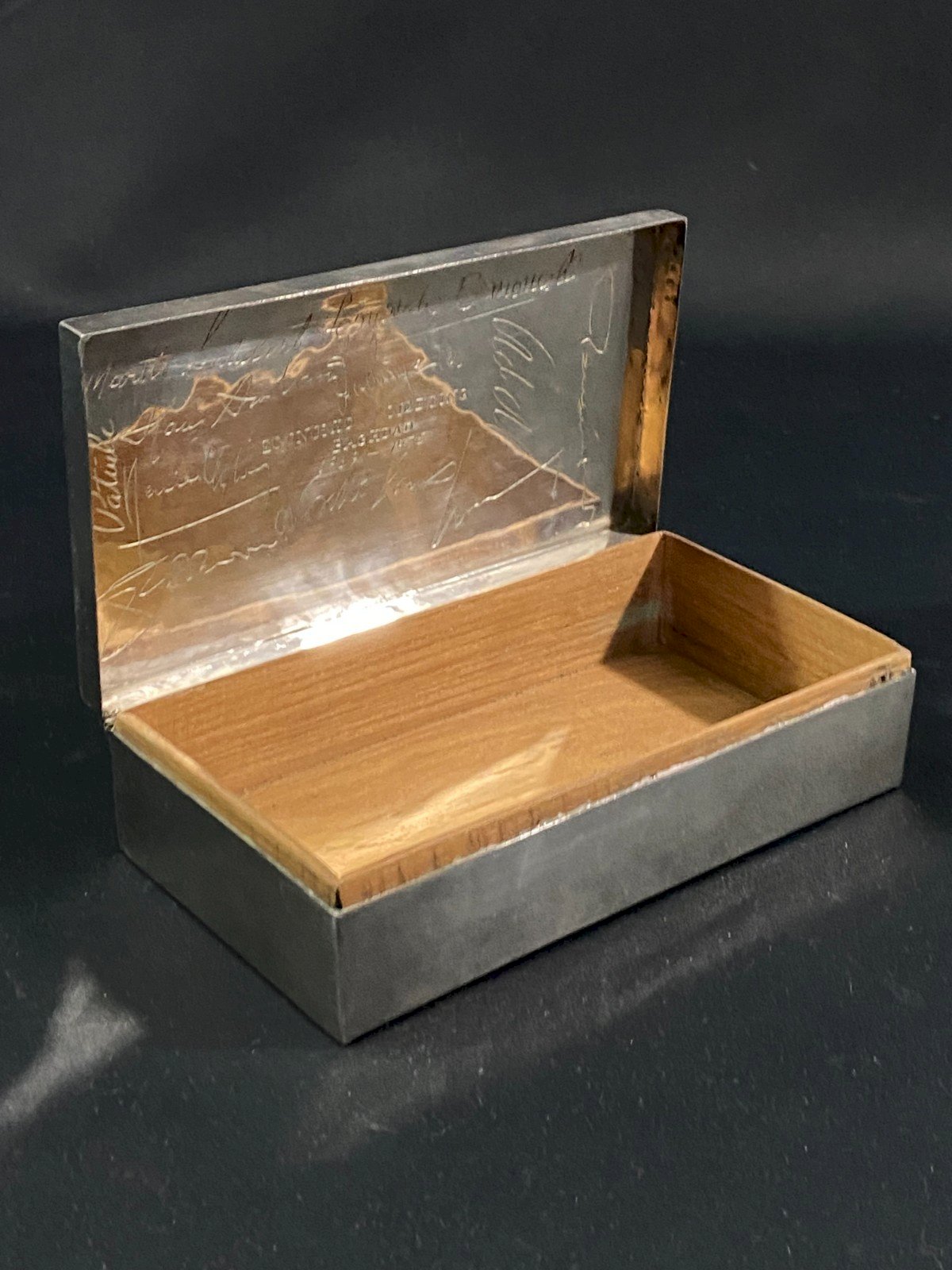 Coffret à cigares cigarettes en argent Irak  Intérieur portant plusieurs signatures gravées ainsi que la mention "Economic Meeting Baghdad 1969-1975" Incontestable élégance Vérification effectuée par très discret micro grattage en bordure intérieure du couvercle Dimensions max : 17,9 x 9,6 x Hauteur 4,7 cm Poids brut : 494 grammes Présence de fines rayures usuelles Envoi TRES soigné dans le monde entier Authenticité:Original Type:Objet de vitrine, Décoratif Période:Design du XXème Origine:Irak Pays de fabrication:Irak Sous-type:Coffret Matière:Argent massif Style:1970