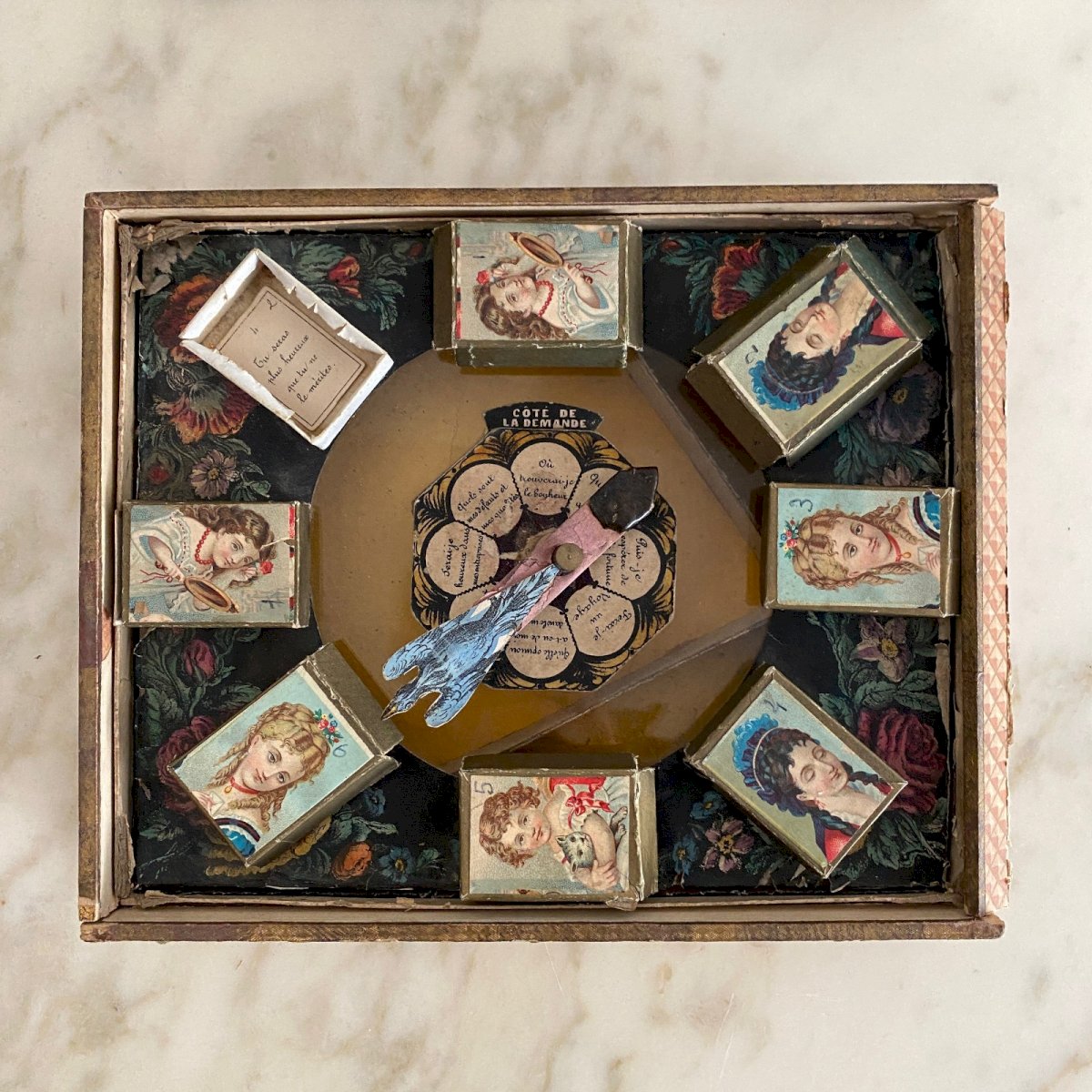 Coffret à jeu L'Oiseau Bleu XIXe oracles cartons lithographiés M3762 Voici un coffret à jeu du XIXe de très belle facture. Elle permettait de réaliser des oracles. Ce jeu est dans un état général convenable. Nous signalons des traces d'usure dues à l'usage, des petites marques. Nos photos vous permettent d'apprécier la qualité de l'objet. Pour l'état, merci de bien détailler les photos. N'hésitez pas à zoomer . Les photos font partie intégrante de la description. Dimensions : Hauteur : 6 cm Largeur : 27,1 cm Profondeur : 22,2 cm A :  7FFH47CAWJ P :  1648046   Je reste à votre disposition pour toute question. État:OccasionObjet ayant été utilisé. les éventuelles imperfections. Type:Jeux de Société Pays d'origine:France