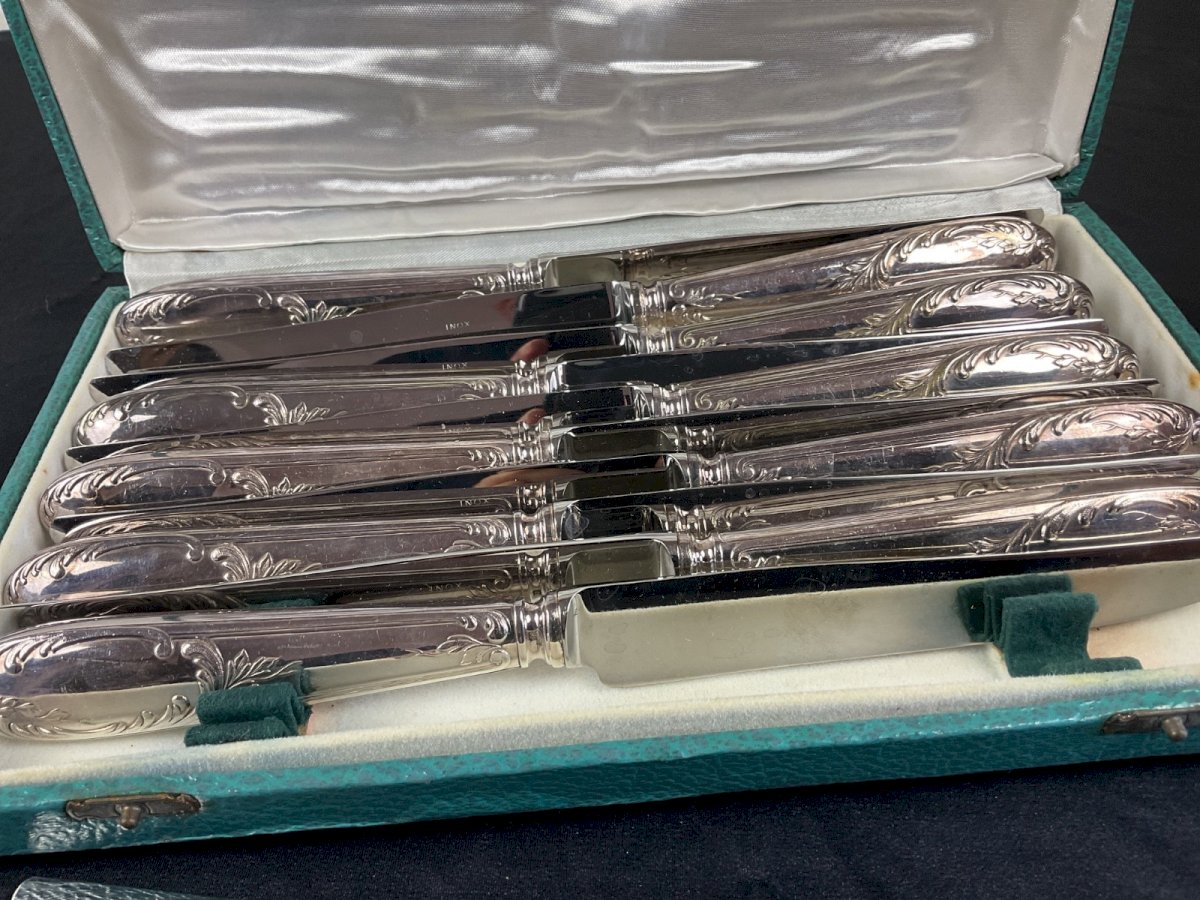 coffret de 12 couteaux de table lame inox orfèvre Longueur 25,5 cm Authenticité:Original Type:Arts de la table, Cuisine Origine:France Sous-type:Couteau Matière:Métal argenté