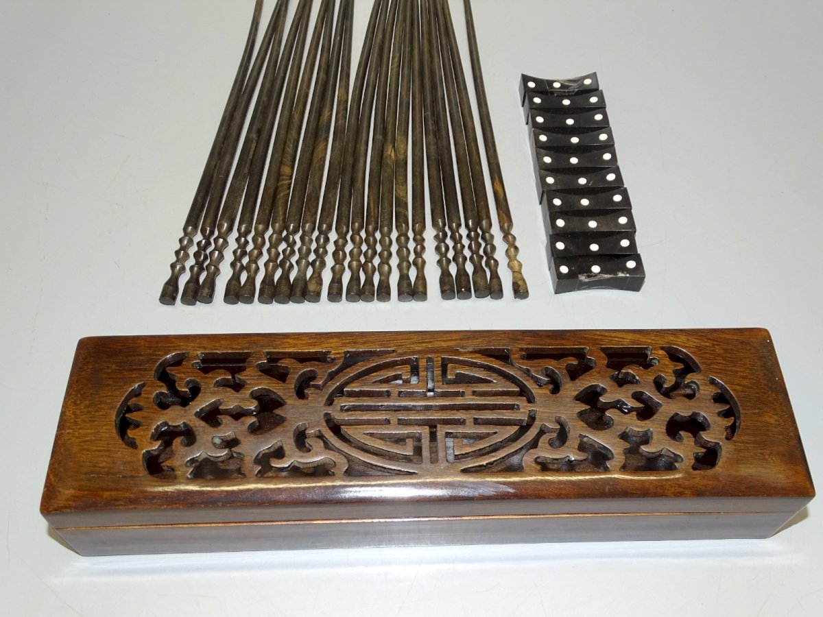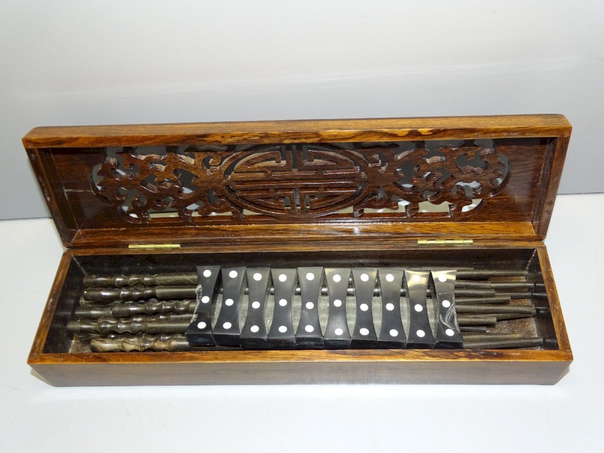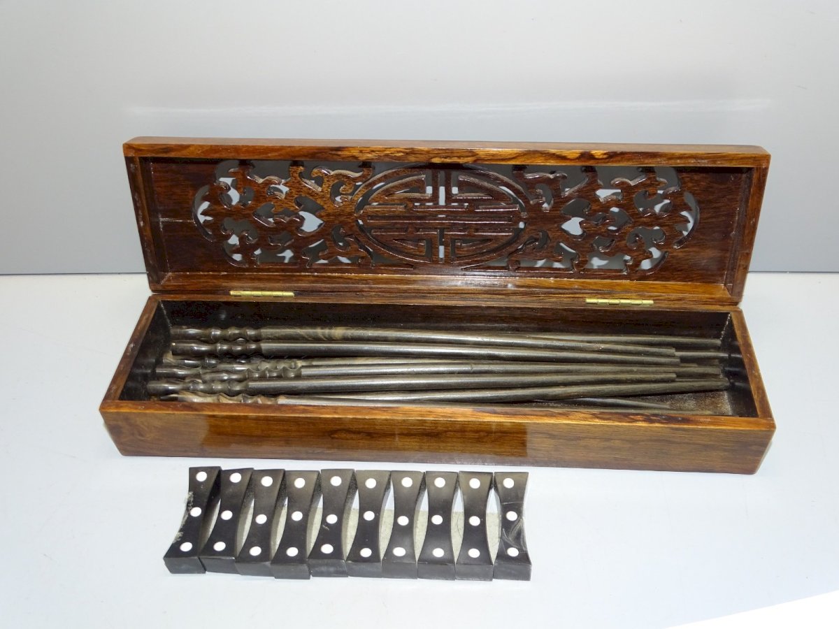 Joli coffret bois avec couvercle ajouré contenant  20 baguettes et 10 supports baguettes - certaines baguettes sont légèrement voilées  -   (photos) - pur jus de trouvailles, sorties de grenier, en bon état -  Réf. 1V250703/185 coffret 27,6 x 7,3 cm Hauteur 5 cm - Poids 0,535 kg     Pour me contacter mon adresse mail : EXPEDITION POSSIBLE EN MONDIAL RELAY ou COLISSIMO sur demande TRES BON EMBALLAGE GARANTI     MERCI de BIEN REGARDER TOUTES les PHOTOS car ELLES FONT PARTIE INTEGRANTE de la DESCRIPTION et PERMETTENT de VOIR l'OBJET AU MIEUX  avec SES PETITS DEFAUTS EVENTUELS - État:Occasion: Objet ayant été utilisé. Objet présentant quelques marques d'usure superficielle, ...Occasion: Objet ayant été utilisé. Objet présentant quelques marques d'usure superficielle, entièrement opérationnel et fonctionnant correctement. Il peut s'agir d'un modèle de démonstration ou d'un objet retourné en magasin après une courte période d'utilisation. les éventuelles imperfections. Type:Baguettes chinoises Matériau:Bois Inclus dans le lot:Baguettes
