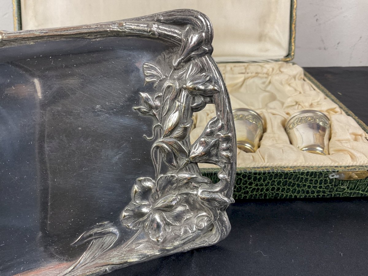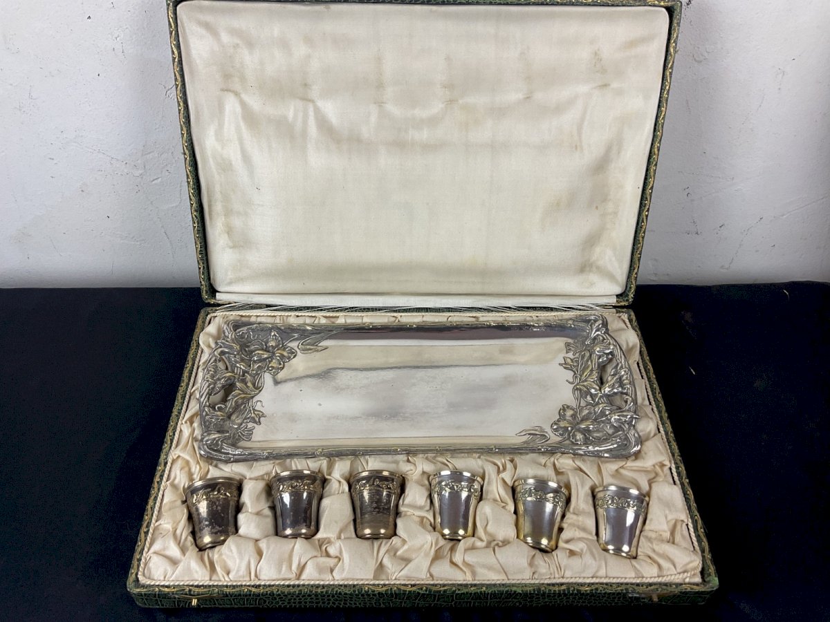 COFFRET SERVICE A LIQUEUR 6 Gobelets , plateau art nouveau metal argenté