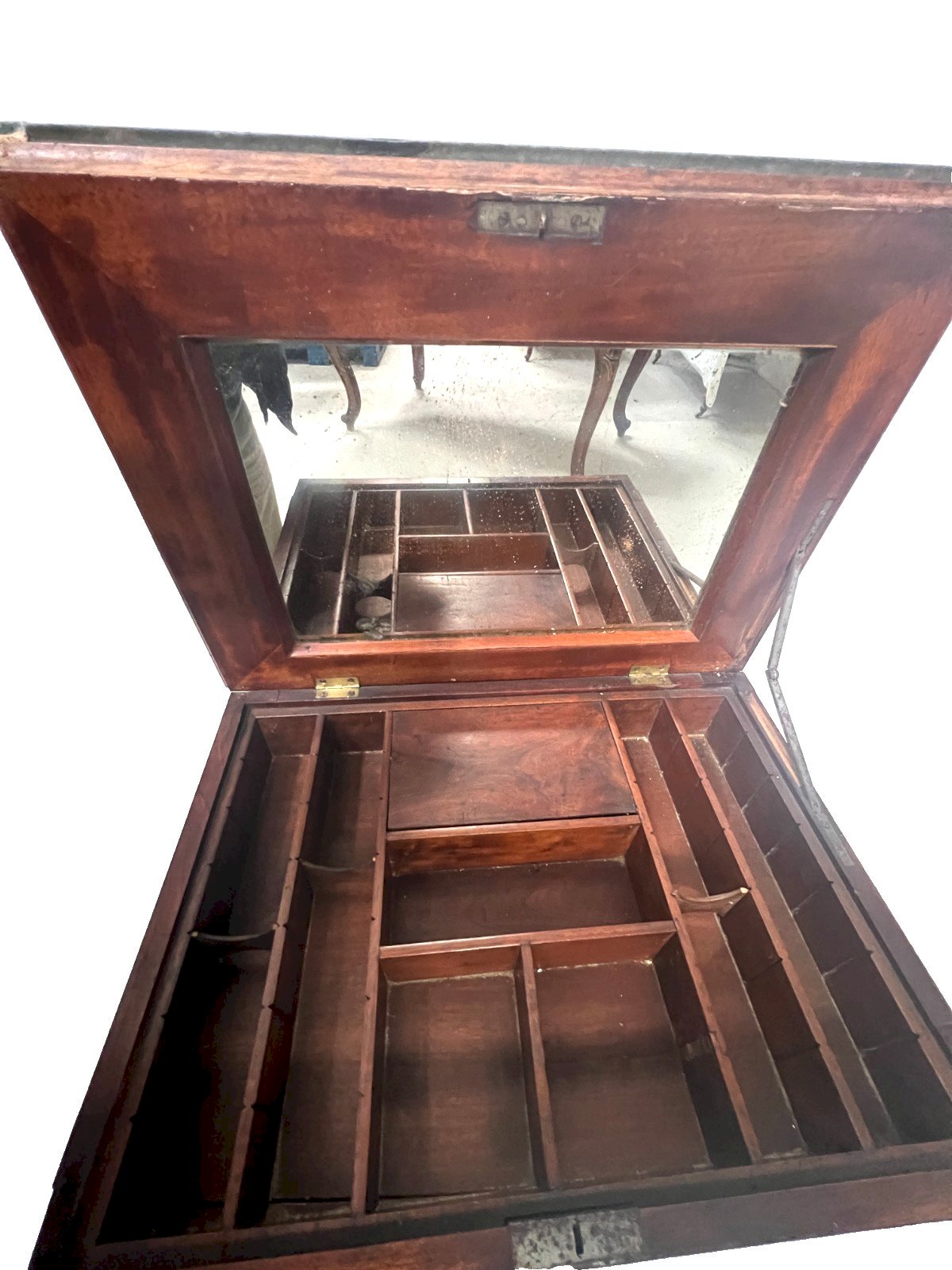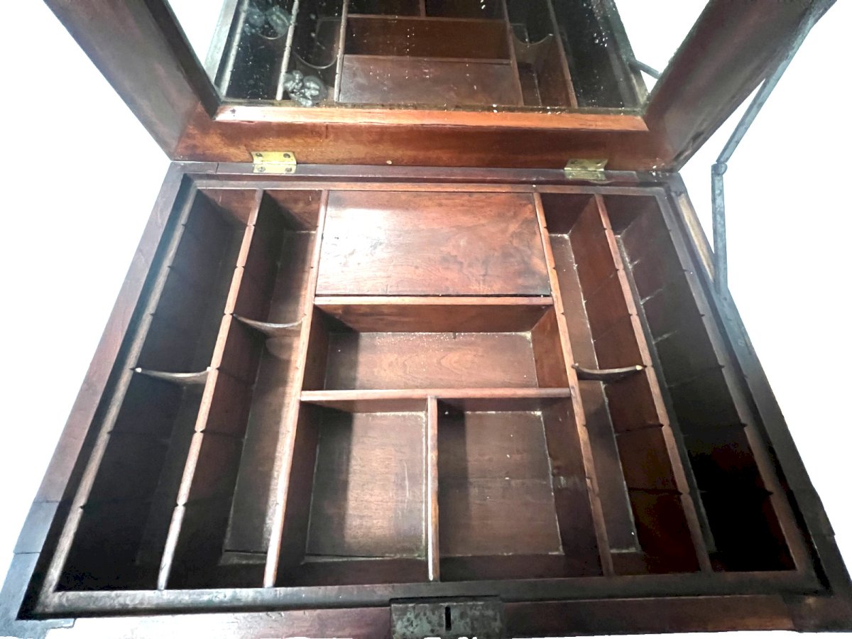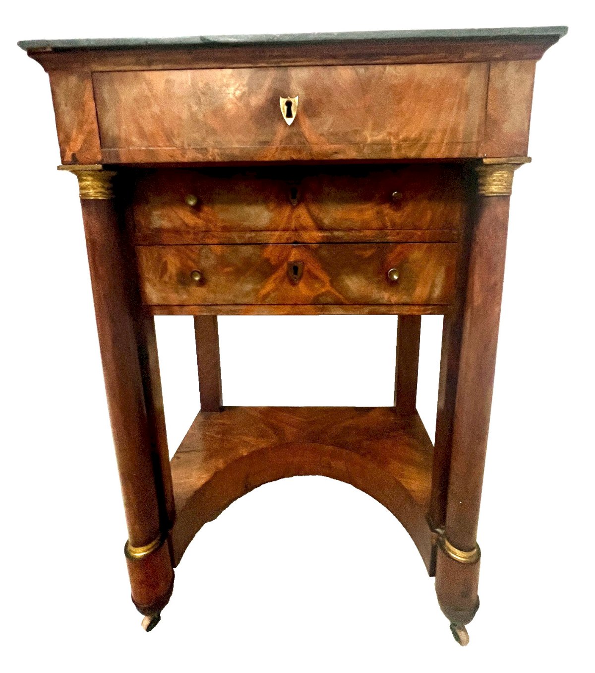 Coiffeuse d'époque Empire en acajou et placage  Deux montants a colonnes en façade  Entretoise basse en incurvée Deux tiroirs sous la ceinture Dessus de marbre en abattant  L'intérieur est a miroir et compartiments de rangement  Bon état général  Ancienne restauration sur le marbre voir les photos Epoque XIX siècle      Type:Coiffeuse Origine:France Hauteur:86 Matière:Acajou Longueur:55 Largeur:40