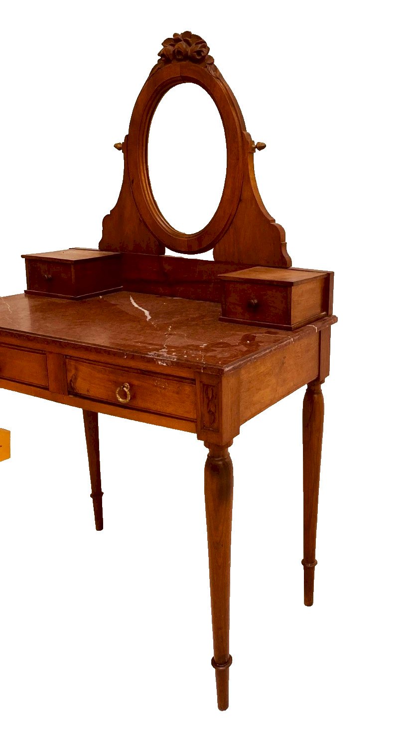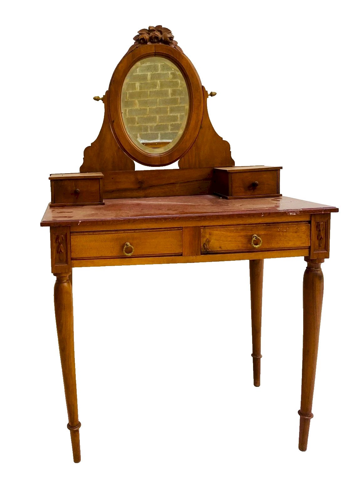 Coiffeuse de style Louis XVI en noyer Elle repose sur quatre pieds fuseaux Deux tiroirs en ceinture Et dessus en plateau de marbre rouge griotte Partie supérieure est a deux tiroirs et un miroir ovale Bon état général  Dimension H 136 x L 81 x 46 cm  Début du XX siècle  Période:Art Déco Origine:France Hauteur:136 Longueur:81 Largeur:46