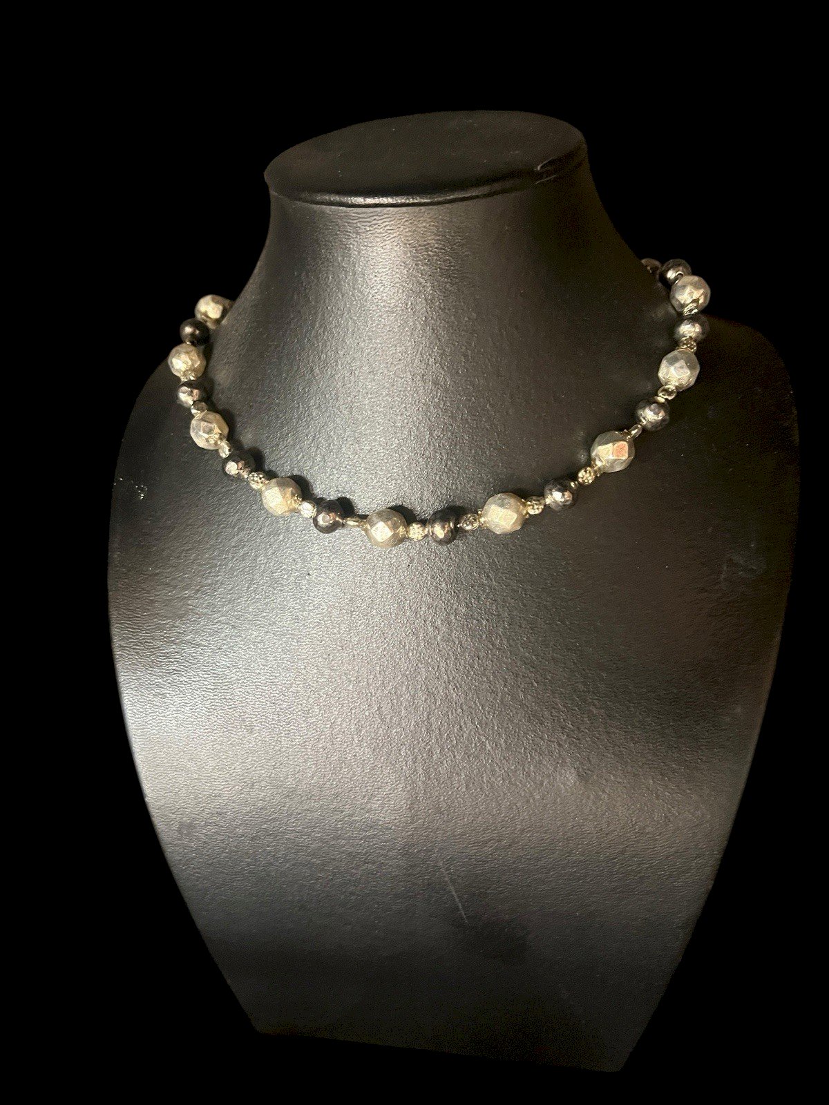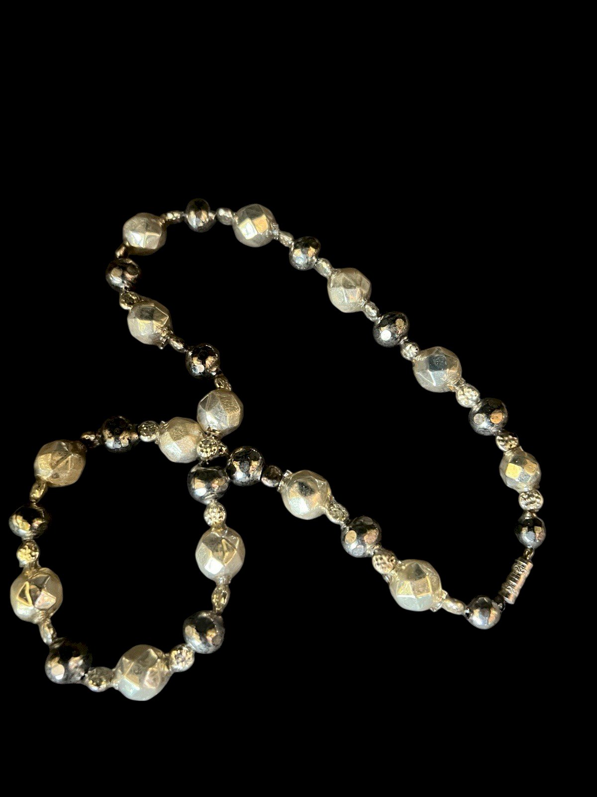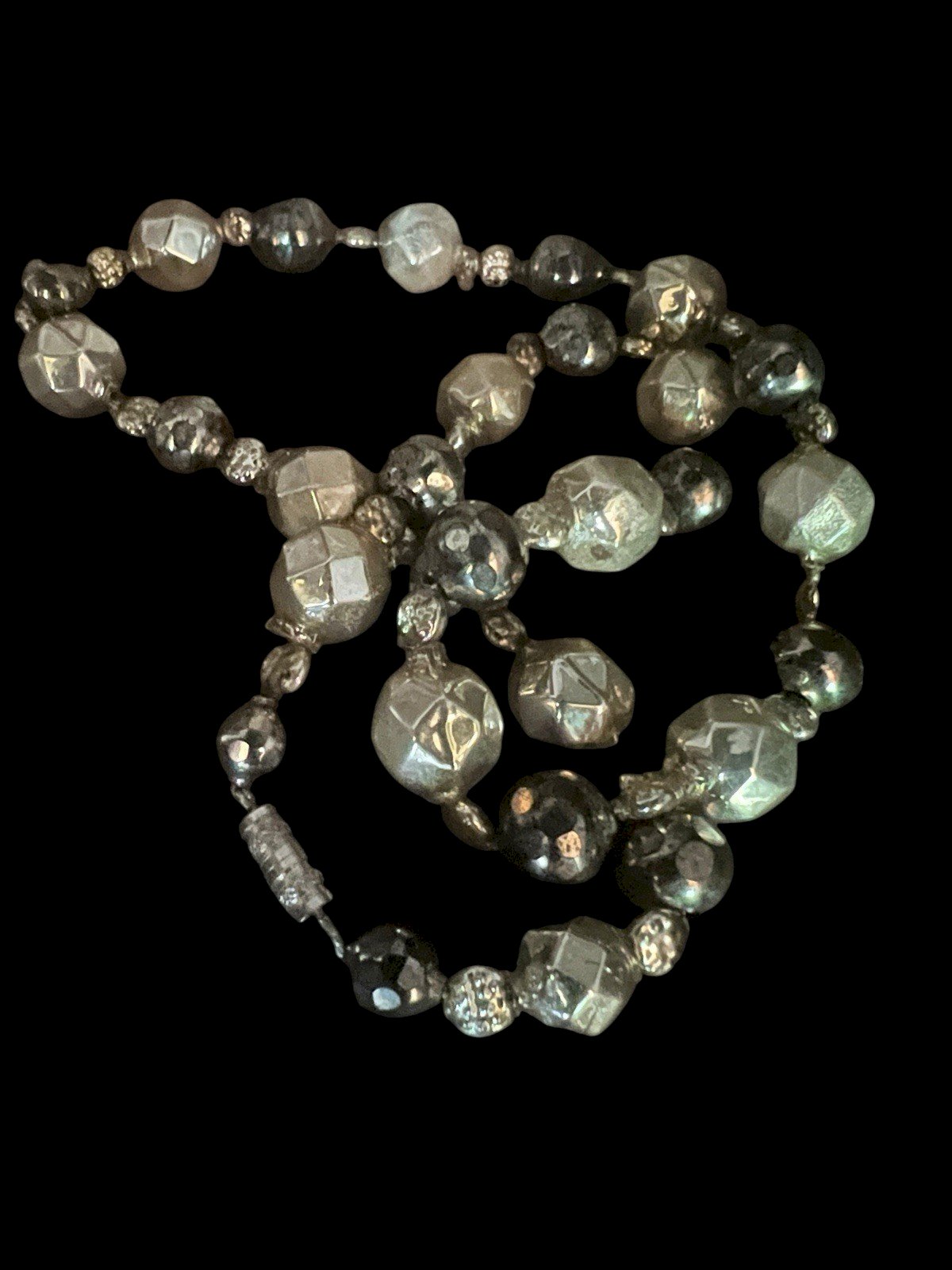 Collier Ancien Perles Verre Eglomisé - Facettées- 19 Eme - Victorian-collection. Superbe collier ancien (fin 19ᵉ siècle) composé de perles en verre facetté églomisé (≈10,8 mm), au bel éclat argenté profond, rehaussées de petites perles qui lui donnent tout son charme. Ce que collier est monté à partir de trois différents types de perles - définition des Perles en verre églomisé ✨ Ces perles uniques sont réalisées selon la technique du verre églomisé, un savoir-faire ancien qui consiste à appliquer une fine feuille d’or ou d’argent au revers du verre. Ce procédé crée de magnifiques jeux de lumière et une brillance subtile qui donnent à chaque perle une profondeur et un éclat incomparables. Idéales pour vos créations raffinées ou pour apporter une touche précieuse à un bijou ou un accessoire. Montage postérieur solide, longueur env. 50,5cm, poids 13,32grs Un bijou extrêmement léger, lumineux et raffiné, idéal pour sublimer une tenue ou enrichir une collection de bijoux anciens. Fragile et solide à la fois État:Occasion: Objet ayant été porté. ...Occasion: Objet ayant été porté. les éventuelles imperfections. Pays d'origine:France Pierre dominante:Perle Marque:Antique XIXe Siècle Type:Collier de perle Couleur dominante:Argenté Matière:Verre Métal:Verre Longueur:41-45 cm Thème:Perles