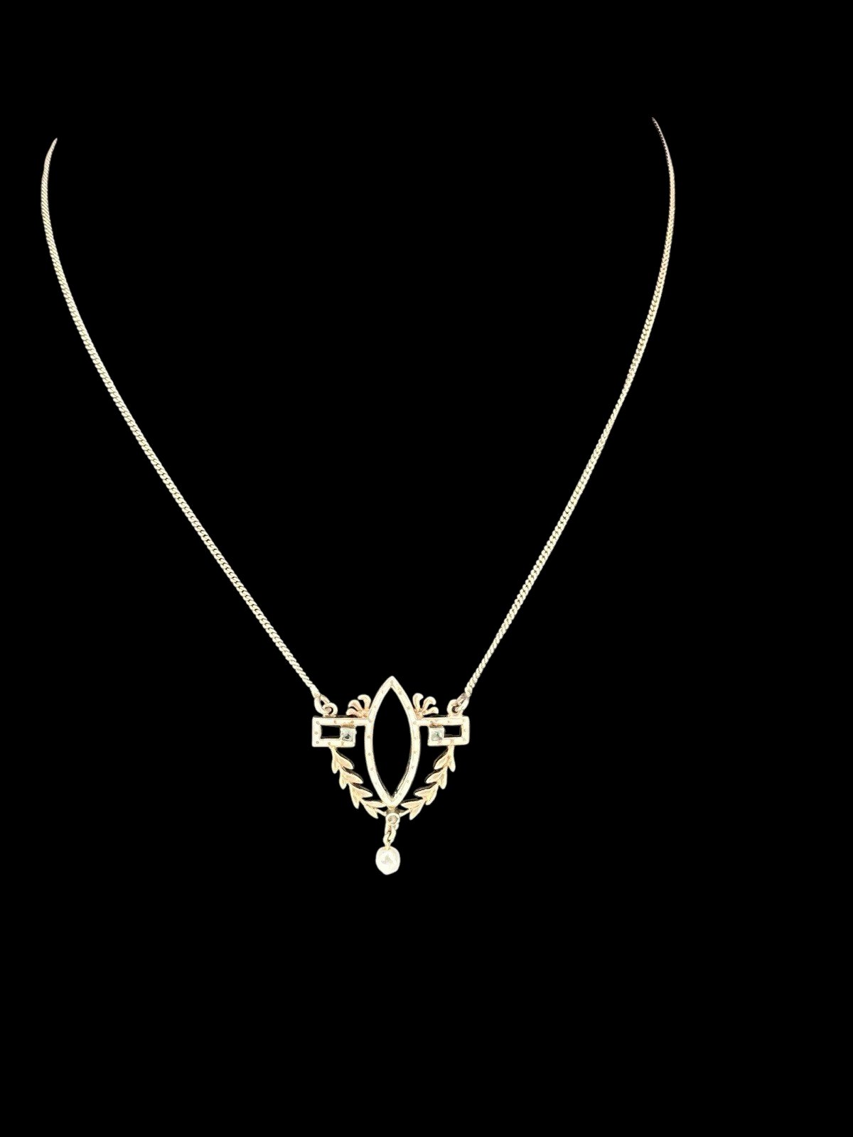 Collier Ancien Argent Massif Vermeil Émail. Collier avec pendentif ancien en argent émaillé et perle – fin XIXᵉ / début XXᵉ siècle Élégant pendentif ancien en argent massif légèrement vermeillé, au décor ajouré de style Art nouveau. La composition symétrique est centrée sur une forme ogivale (navette) bordée d’émail clair, encadrée de petits éléments géométriques sertis de pierres claires (probablement strass anciens ou pâtes de verre). La partie inférieure est décorée d’un motif végétal stylisé formant une guirlande de feuilles, et se termine par une petite perle nacrée pendante, apportant mouvement et délicatesse à l’ensemble. Le pendentif est poinçonné sur l’un de ses anneaux, attestant l’argent massif. La chaîne est également poinçonnée mais porte un poinçon différent, ce qui laisse penser qu’elle est probablement postérieure au pendentif. À signaler : petits manques d’émail visibles en partie haute et basse de la navette centrale, cohérents avec l’ancienneté du bijou. Dimensions : • Hauteur du pendentif avec la perle : environ 3,6 cm • Largeur : environ 2,8 cm • Longueur du collier : environ 23,5 cm Merci de bien lire la description et de vérifier les dimensions avant achat. Les photos font partie intégrante du descriptif et permettent d’apprécier l’état de l’objet. Bijoux anciens ou vintage ayant été portés : de légères traces d’usage peuvent être présentes. Envoi soigné et bien protégé après paiement. État:Occasion: Objet ayant été porté. ...Occasion: Objet ayant été porté. les éventuelles imperfections. Pierre dominante:Strass Type:Collier Pendentif Pureté métal:925 parties pour 1000 Métal de base:Argent fin, 925 parties pour 1000 Couleur pierre dominante:Argenté Métal:Argent massif Pierre secondaire:Strass