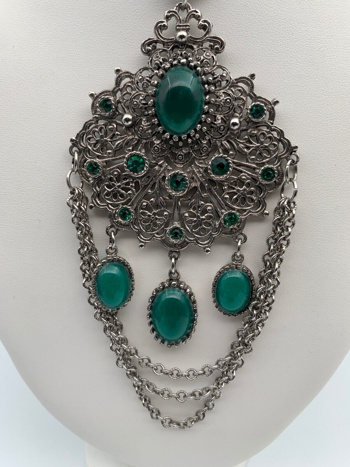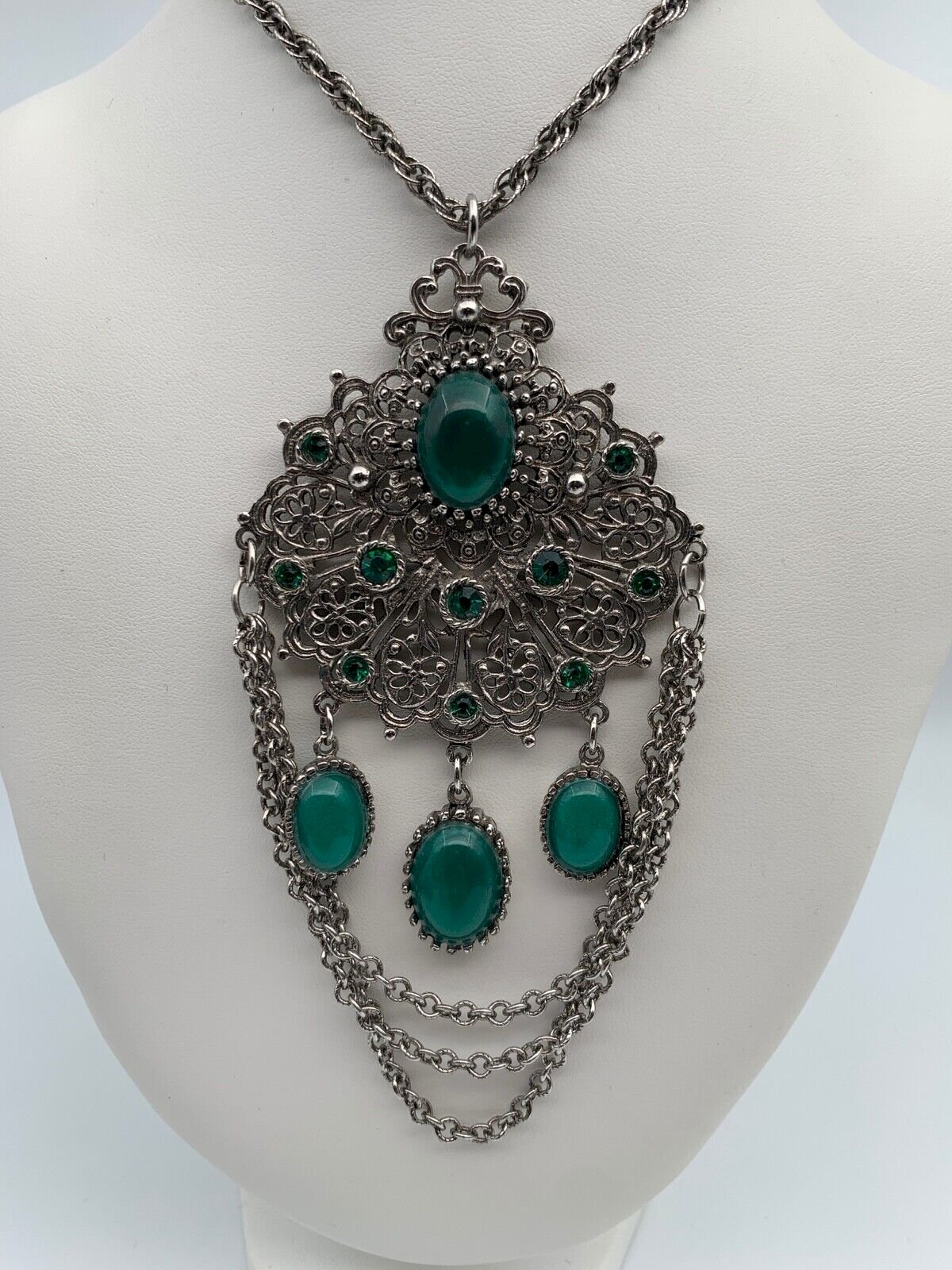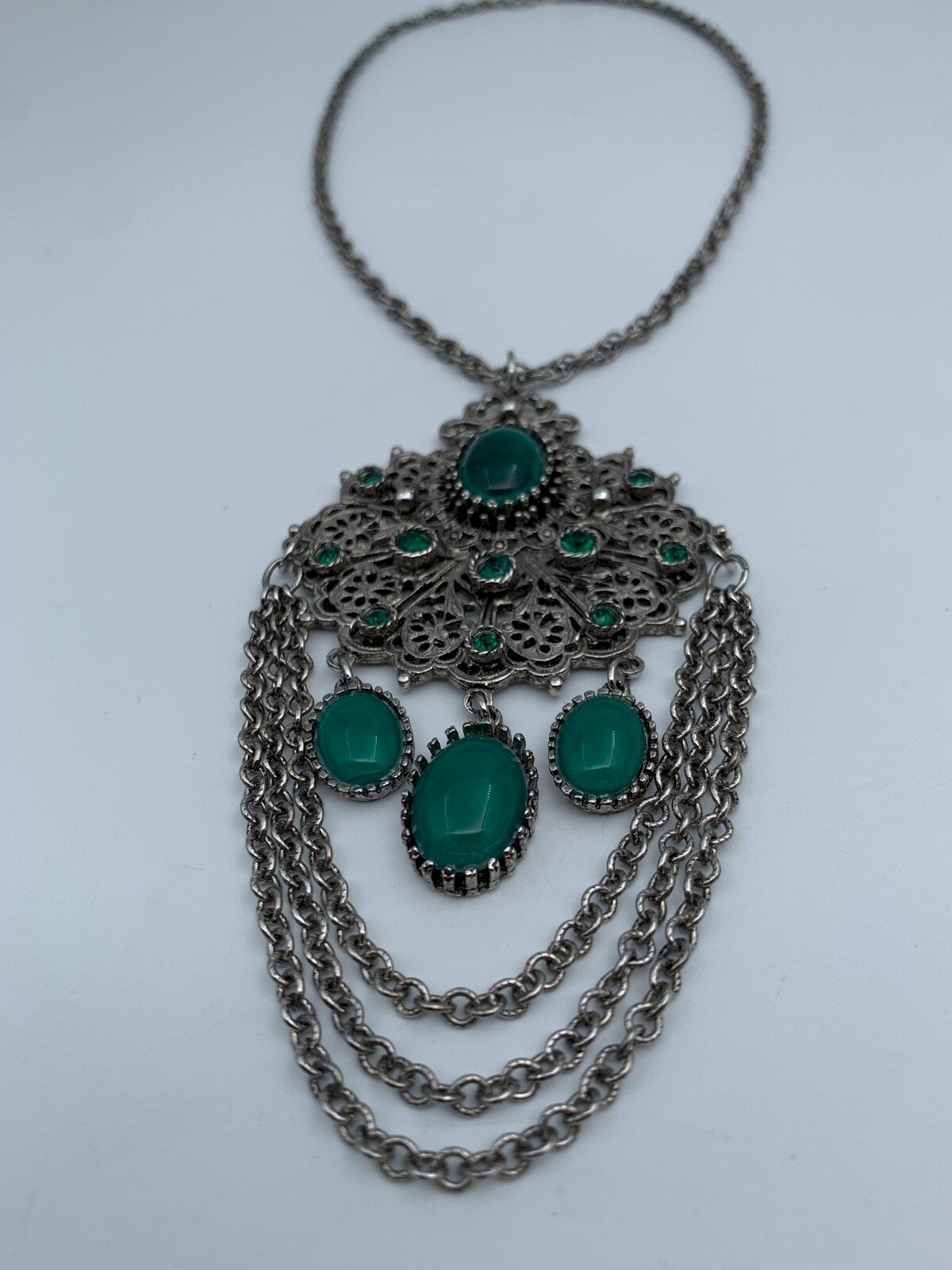 COLLIER FANATAISIE STYLE ORIENTALE ALLIAGE GRIS OXYDES VERTS 66 GRAMMES - Collier tendance - Longueur totale : 40 cm - Épaisseur : 1 cm - Largeur : 6.4 cm  - Poids de l'ensemble : 66 grammes  - Nombre de perles : 14 oxydes - Poinçons : pas de poinçon - Matière : alliage et verre - État : (pour l'état merci de bien détailler les photos) : occasion en bon état.                                                                                                               Usures naturelles de l'occasion. Veuillez bien regarder les photos elles font partie intégrante de la description.   N’hésitez pas à consulter ma boutique  je propose une large gamme  de colliers  et bijoux  Tous mes bijoux sont soit anciens, soit d’occasion plus ou moins récents.  A ce titre, ils ont des marques du temps et d’usage   que j’essaye de signaler au mieux en mettant plusieurs photos  et en décrivant l’objet.  Je vous demande donc par avance de bien  lire le descriptif  et  regarder les photos  qui font partie de la description.  N’hésitez pas à consulter ma boutique et tous mes objets en vente ! Je reste à votre disposition pour toutes questions. État:Occasion: Objet ayant été porté. ...Occasion: Objet ayant été porté. les éventuelles imperfections. Couleur dominante:GRIS VERT Type:Collier avec pendentif Forme du pendentif:OVALE Pierre dominante:VERRE