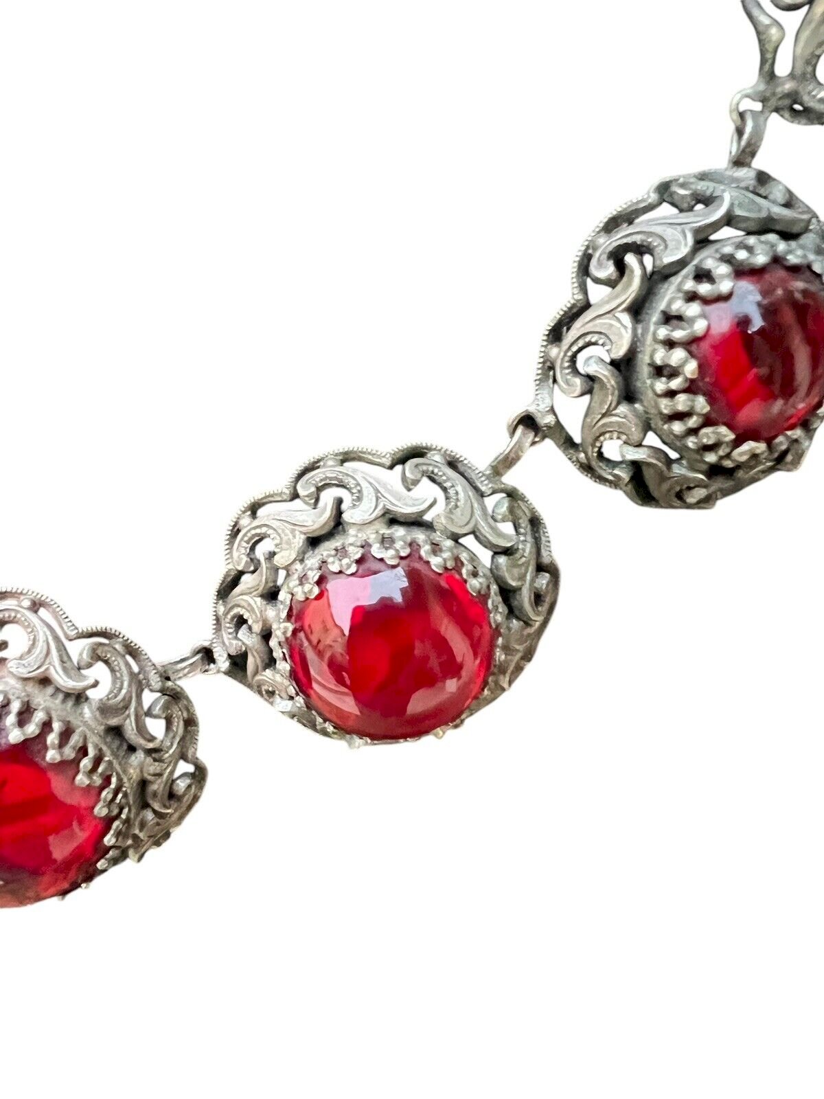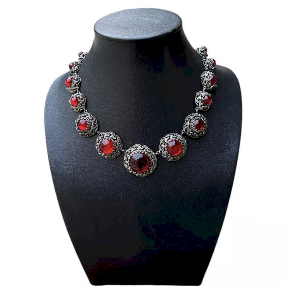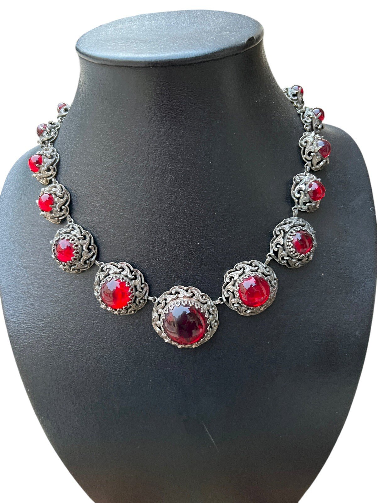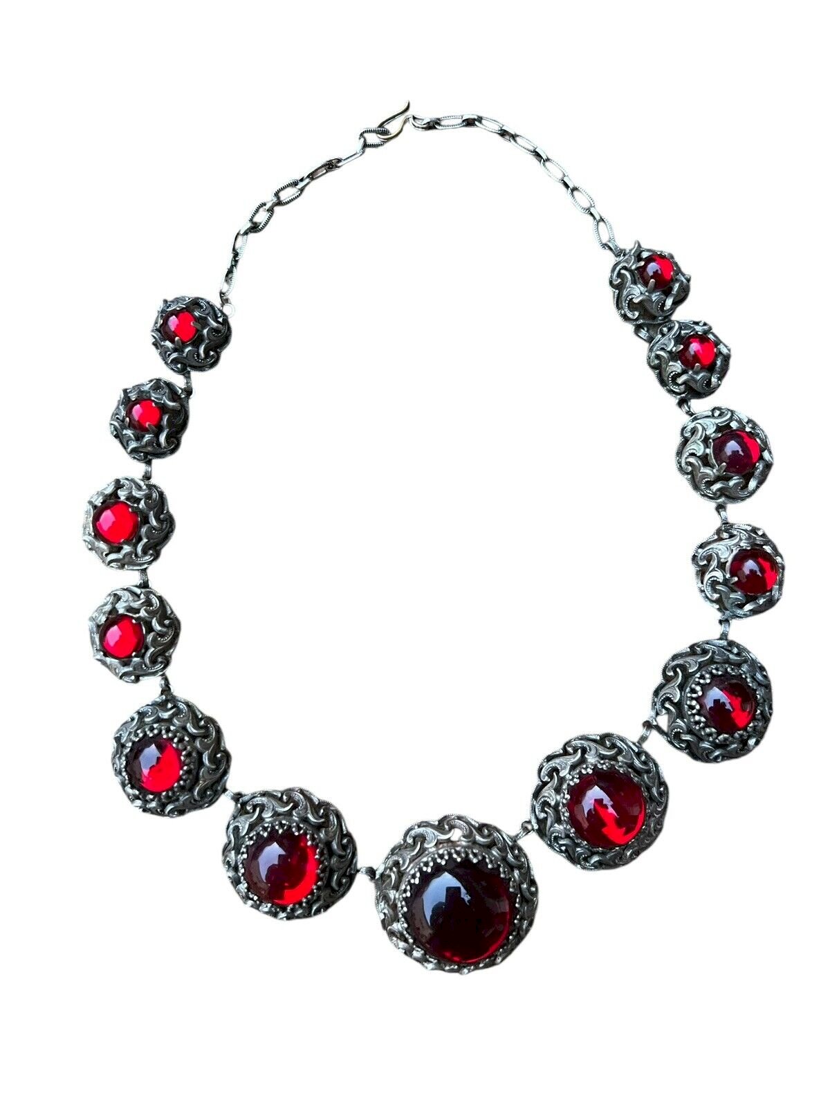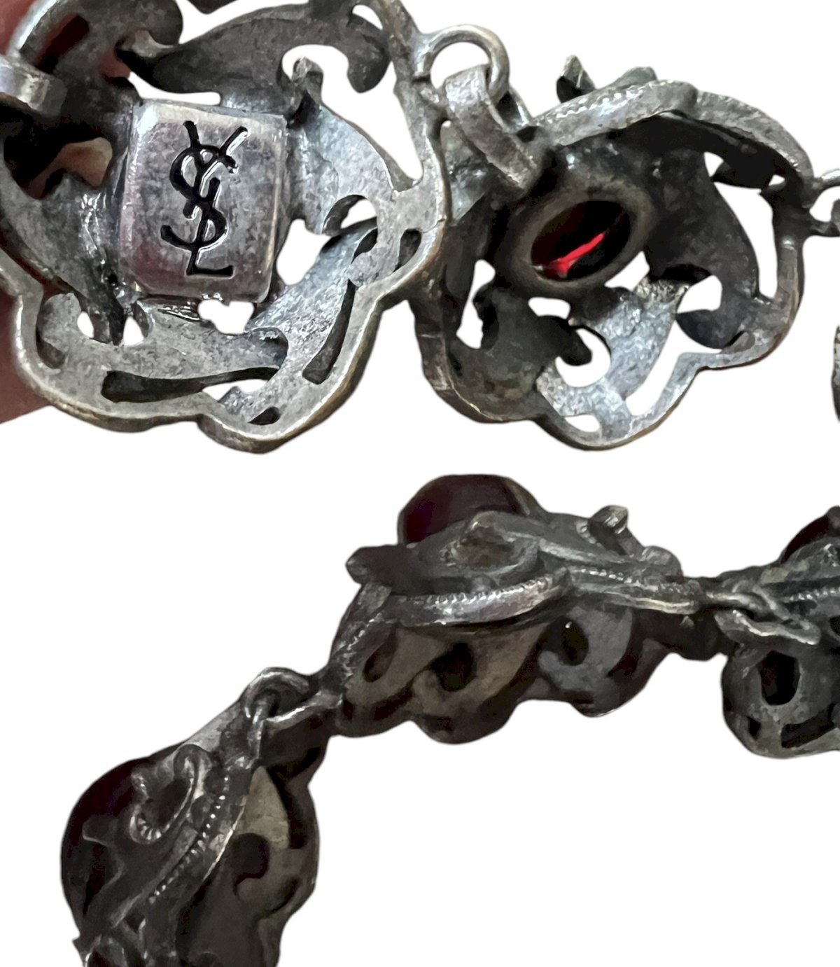 Collier vintage Yves Saint-Laurent Haute couture Statement Necklace French Brand. Longueur du collier, environ 47 cm, Dimension du motif le plus large environ 3,6 cm de diamètre Poids environ 80,2 g, le collier est en métal argenté, orné de gros cabochon en verre . Il manque un peu de doré sur le cabochon central. Visible sur une photo sinon bon état Ancien patine ancienne État:Occasion: Objet ayant été porté. ...Occasion: Objet ayant été porté. les éventuelles imperfections. Pierre dominante:Cabochon verre Type:Collier de pierre Marque:Yves Saint Laurent Couleur dominante:Rouge Matière:Verre Thème:Luxe