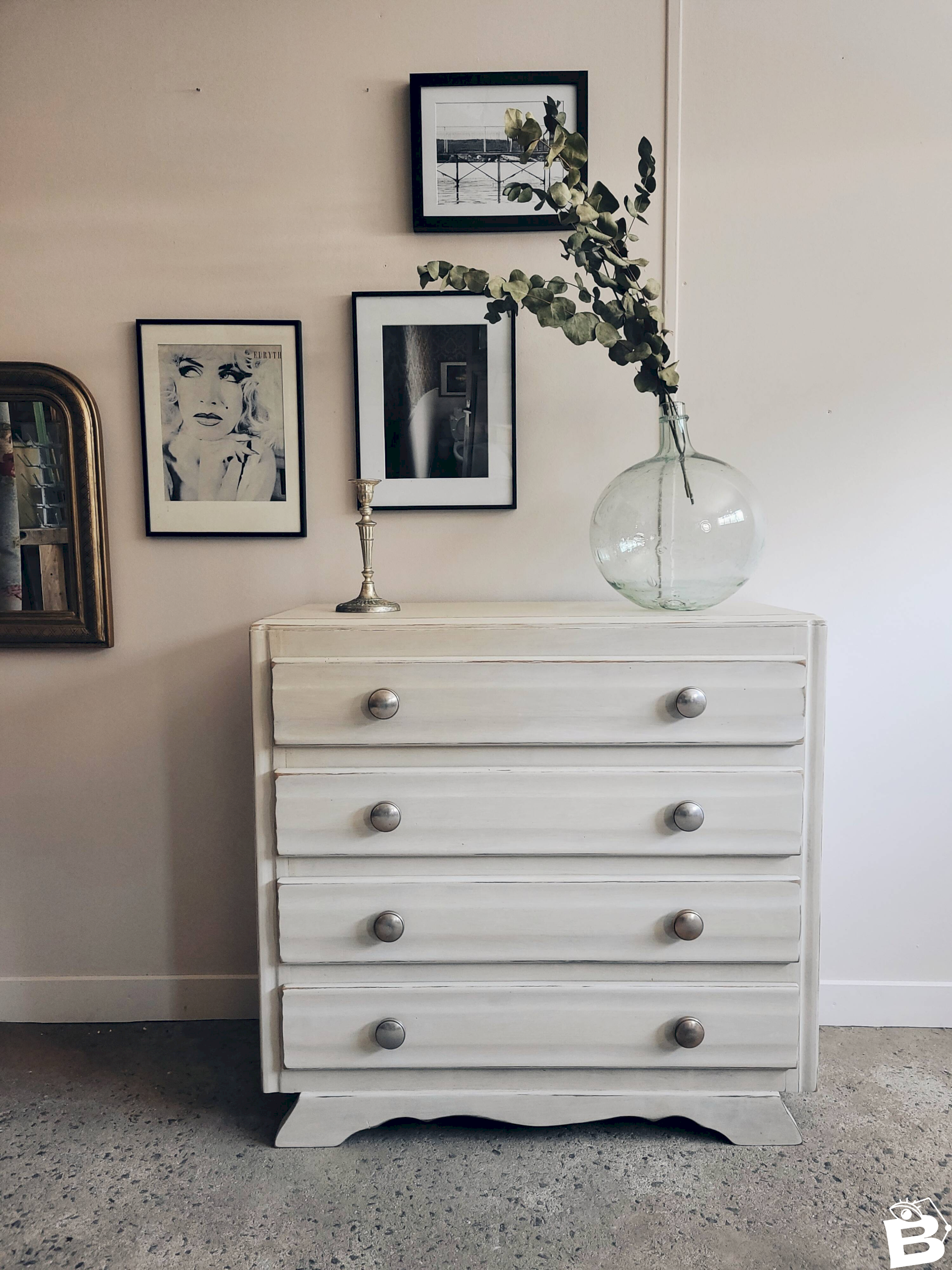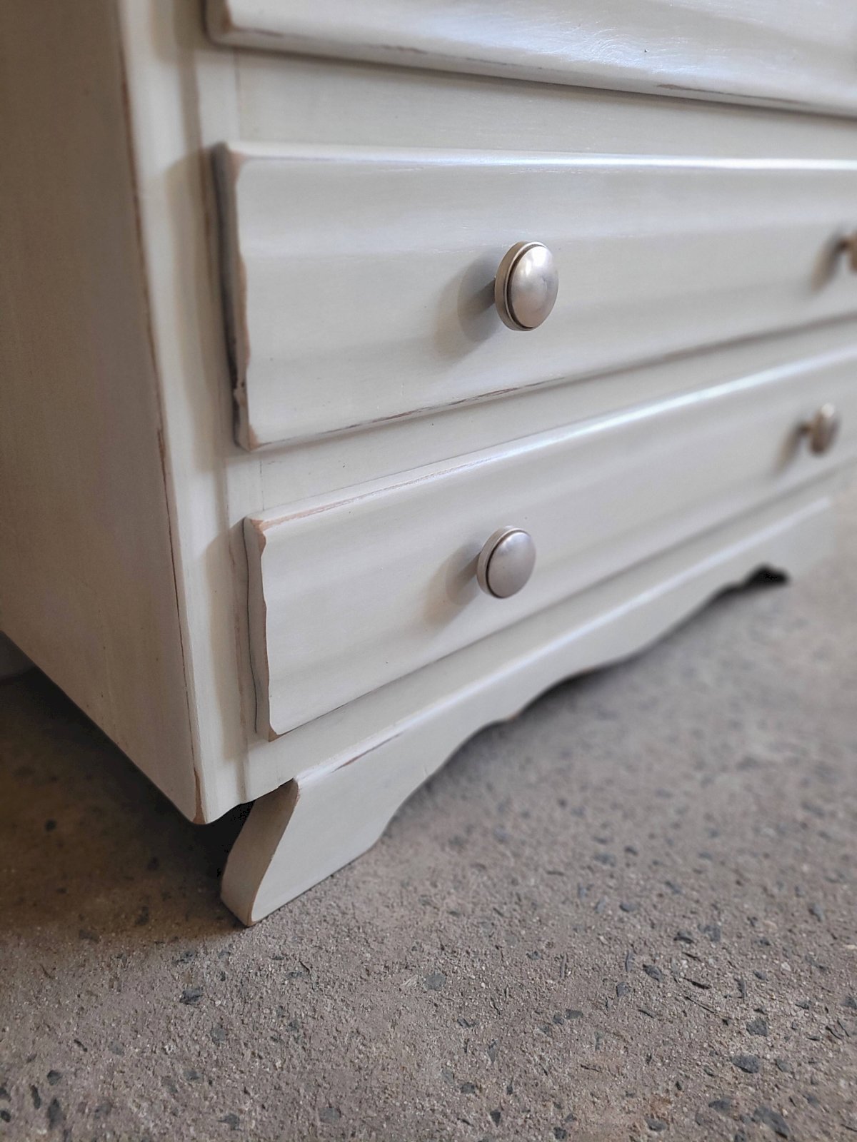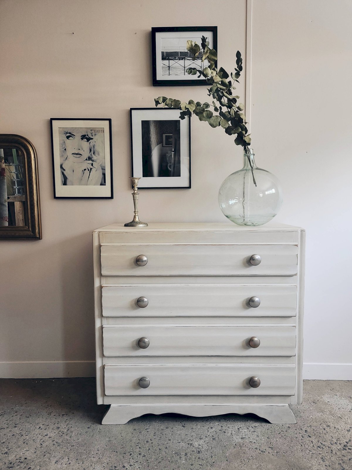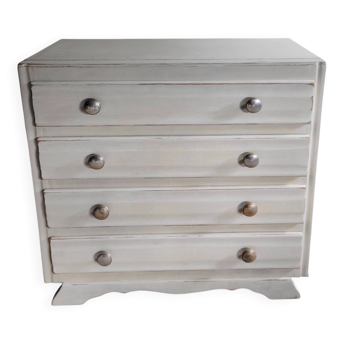 Commode art déco patinée blanche.Jolie commode style Art Déco.