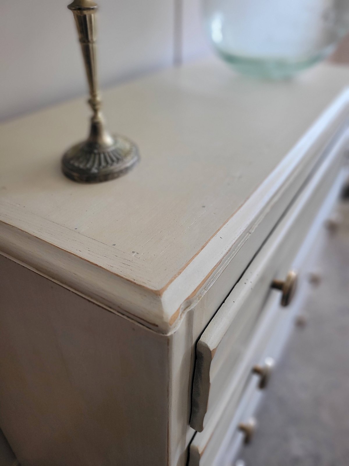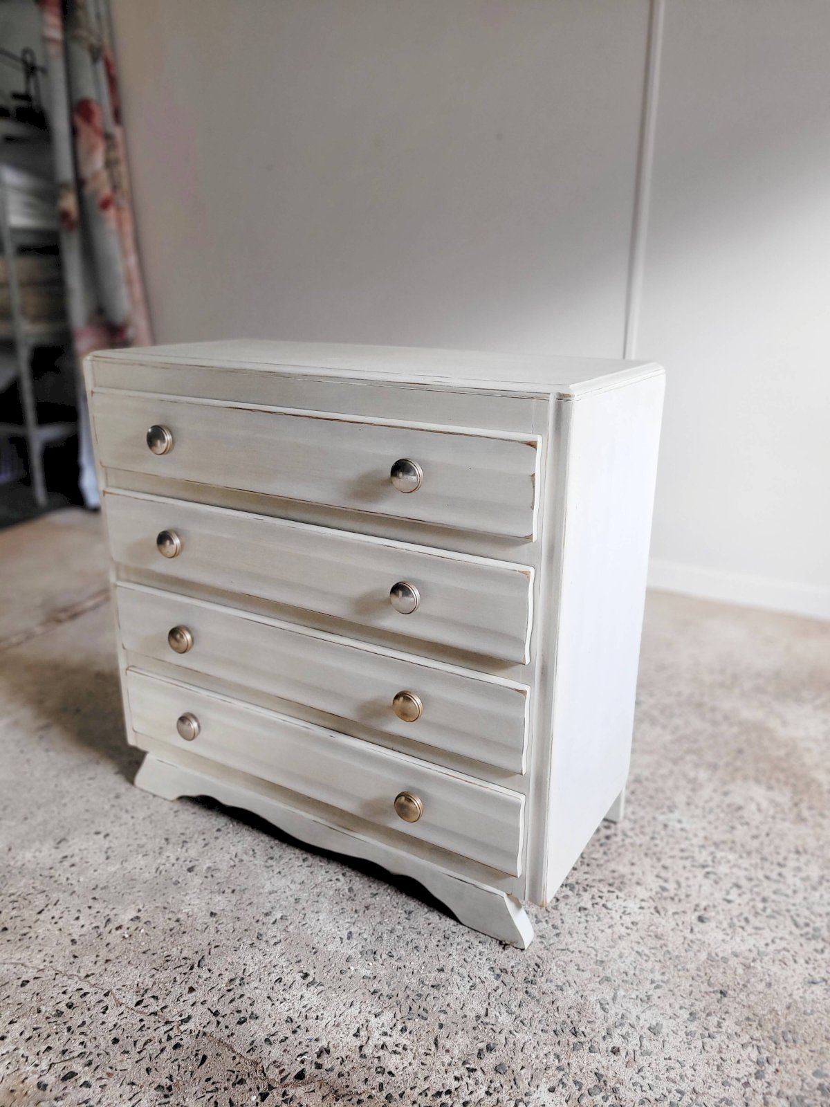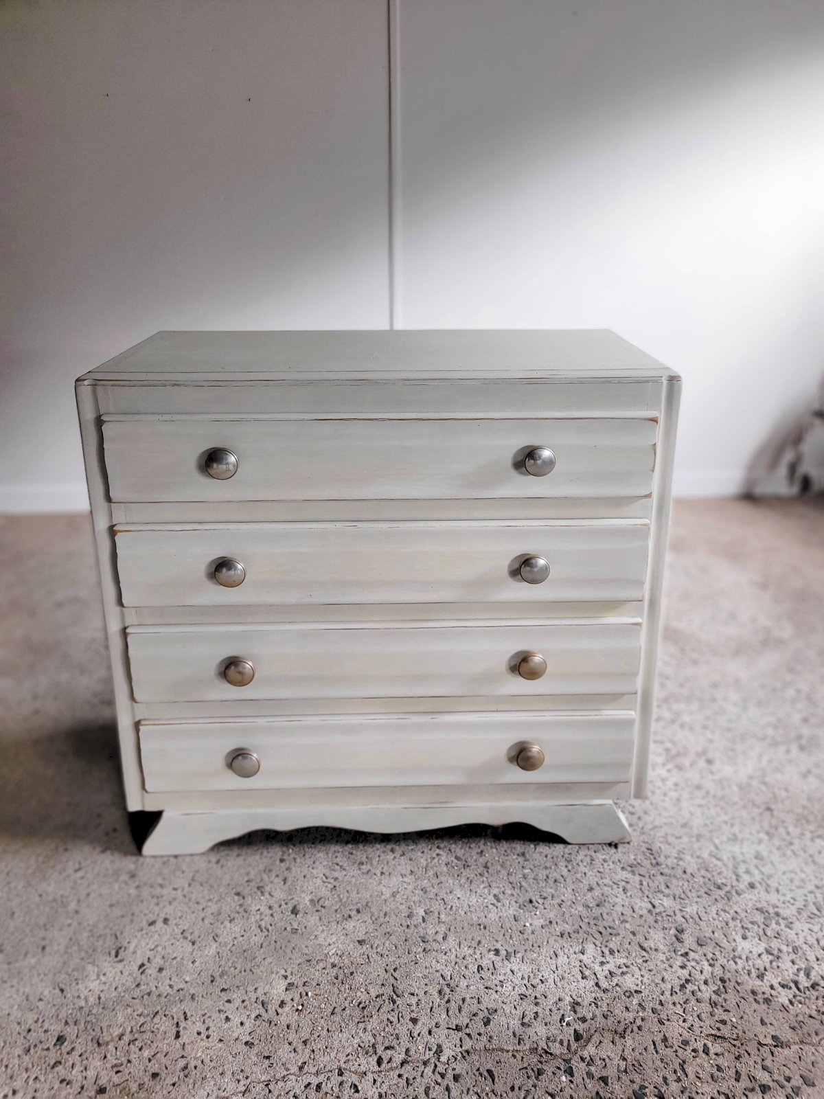 Commode art déco patinée blanche.Jolie commode style Art Déco.