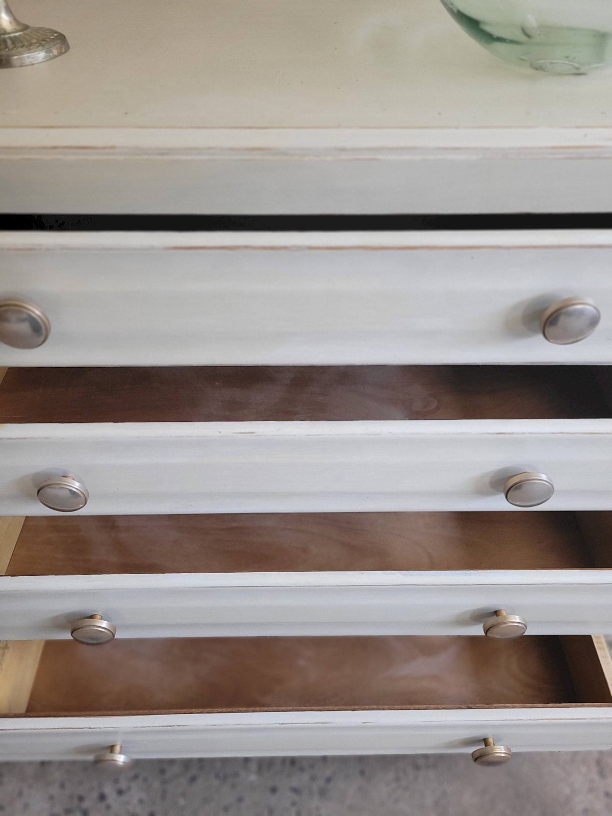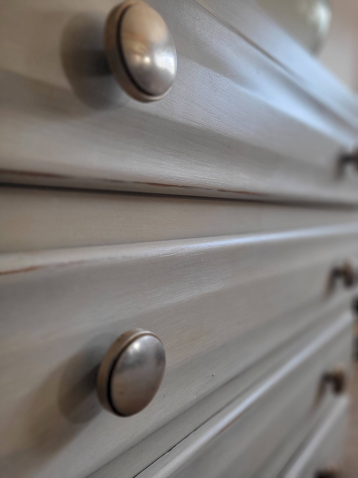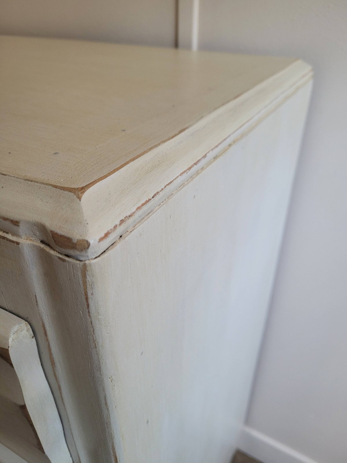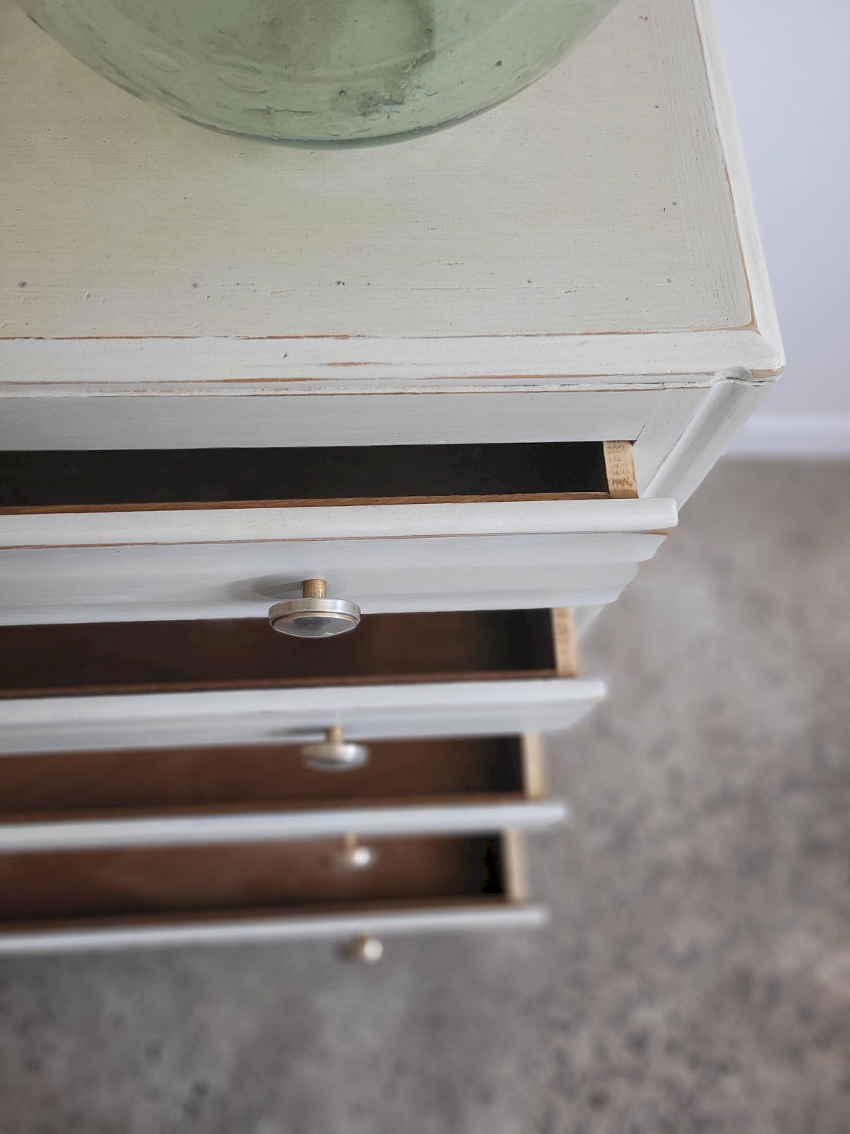 Commode art déco patinée blanche.Jolie commode style Art Déco.