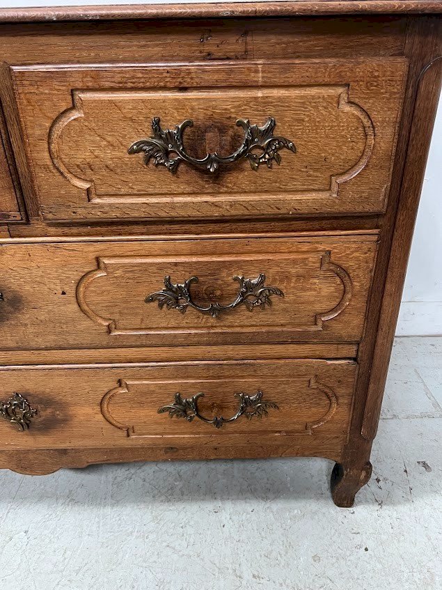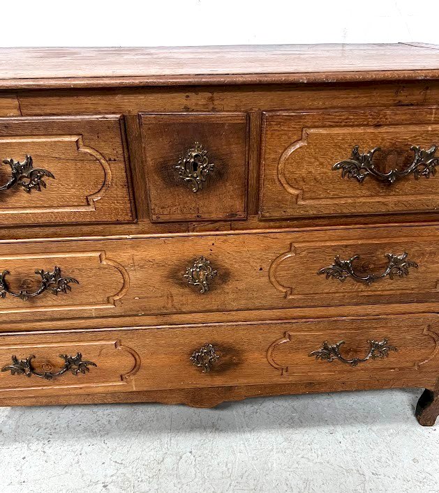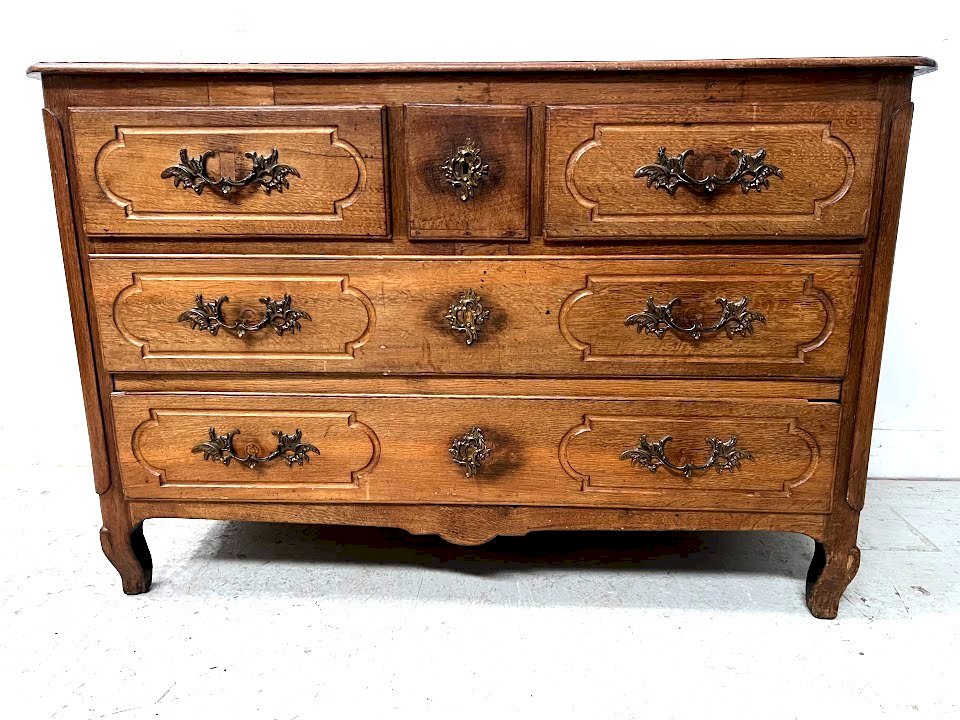 Commode Louis XV en chêne massif du XVIII siècle Montants de façade en arrondis a pieds cambrés Cinq tiroirs en façade dont trois au premier rang Poignées et entrées de serrures en bronze ciselé Bon état général Restauration d'usage Dimension H 85 x L 128 x 63 cm Epoque XVIII siècle Couleur:Marron Type:Commode, Chiffonnier Période:XIXème et avant Pays d'origine:Italie Sous-type:Plus de 3 tiroirs Hauteur:85 Matière:Chêne Style:Louis XV, Néoclassique Longueur:128 Largeur:63