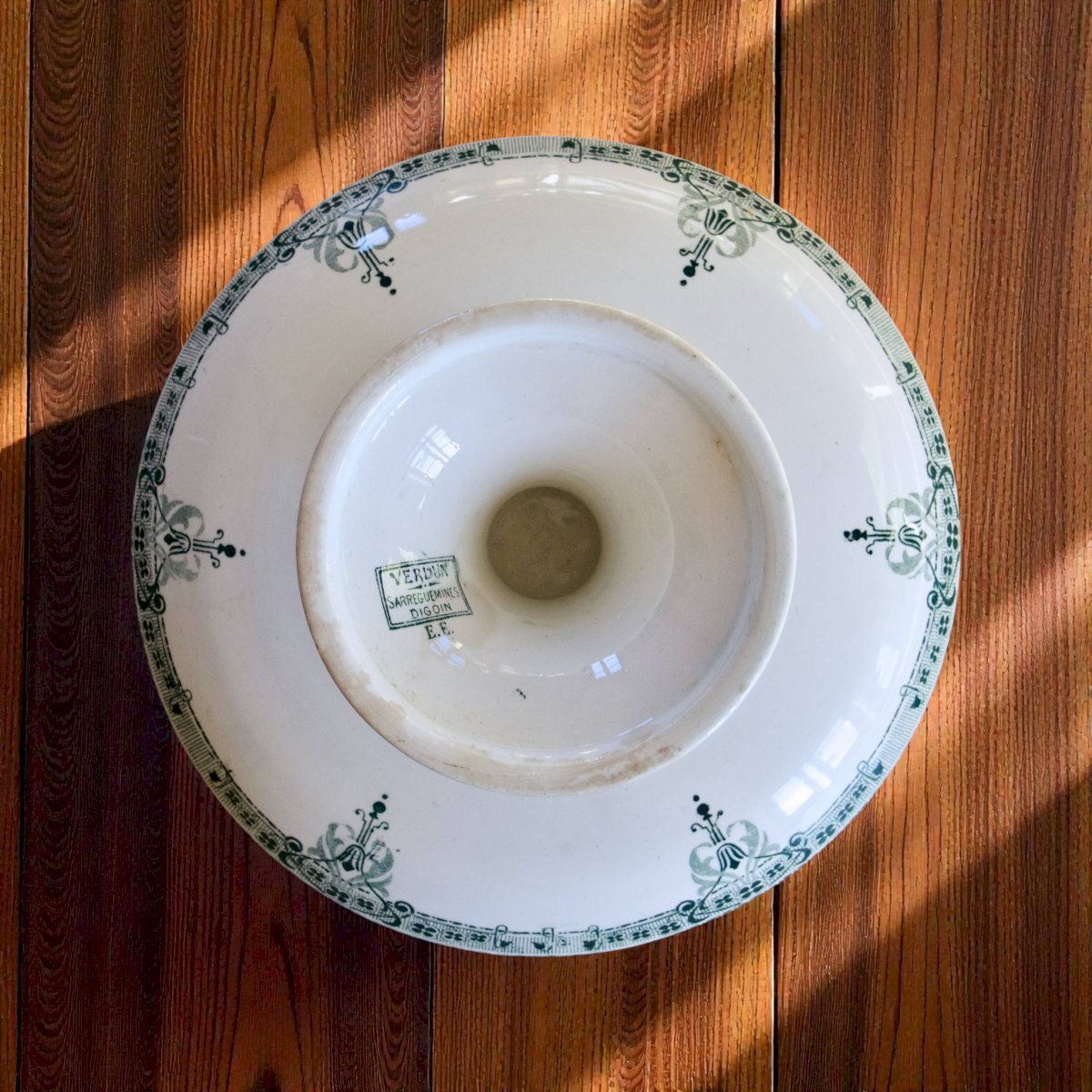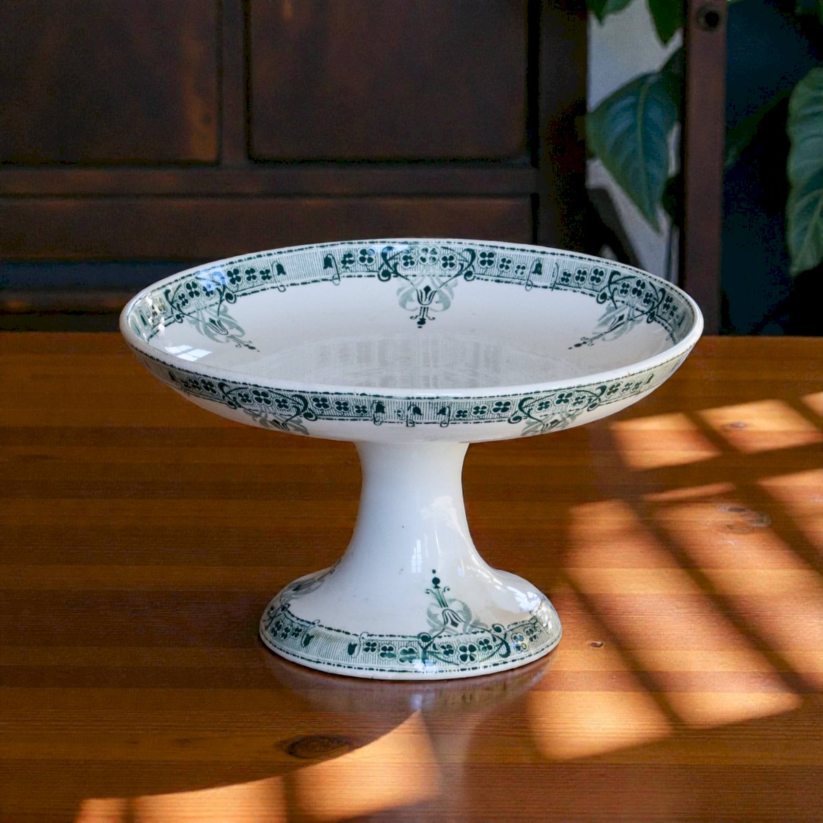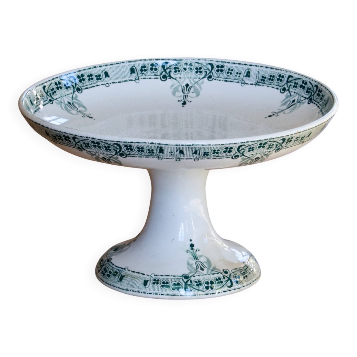 Joli compotier ancien, terre de fer, signé Sarreguemines Digoin, collection “Verdun”, circa 1895 - 1905.Doux décor Art Nouveau composé d’une frise de trèfles à quatre feuilles et autres ornements.