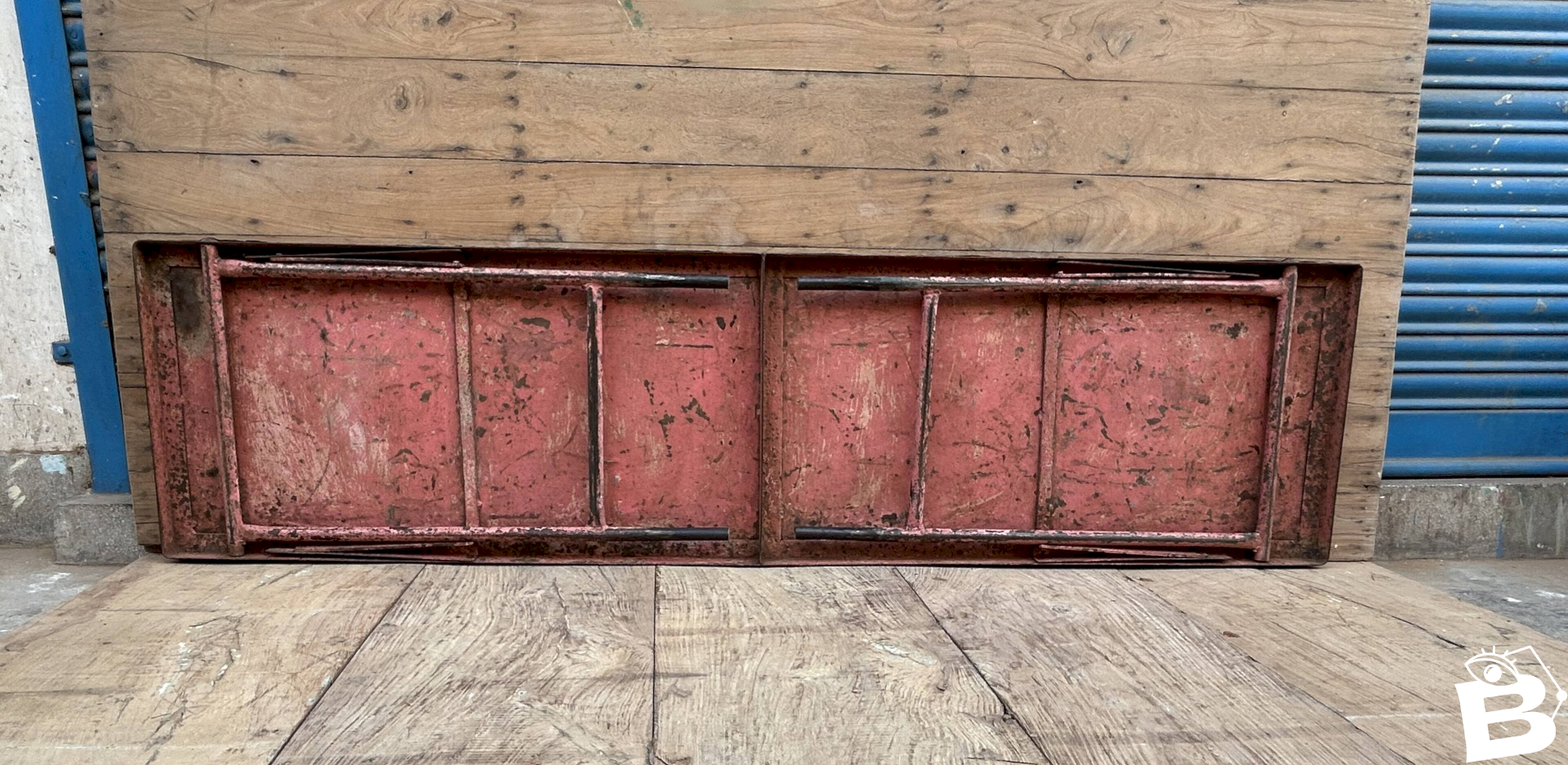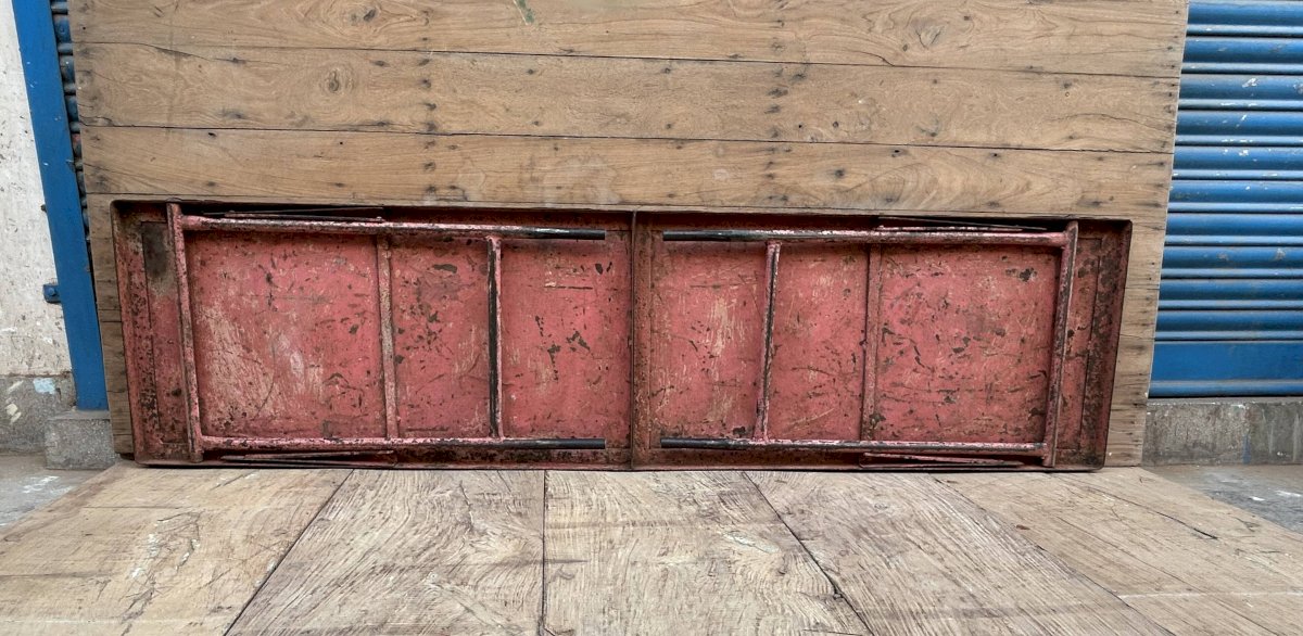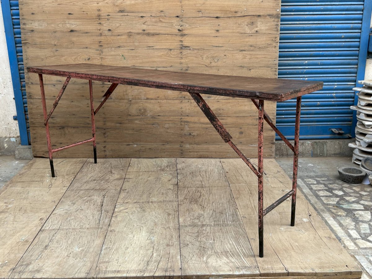 Console d'atelier pliante en métal avec patine d'origine / 178 x 47 x 16 cm - taille pliée 178 x 47 x 6 cm - 25 kg