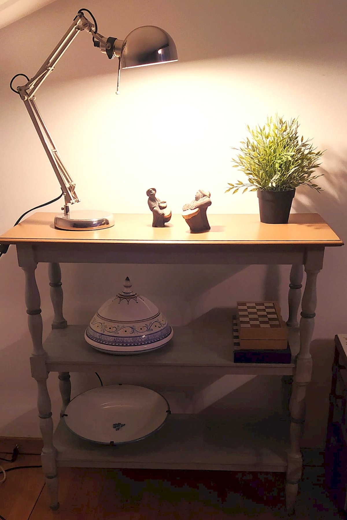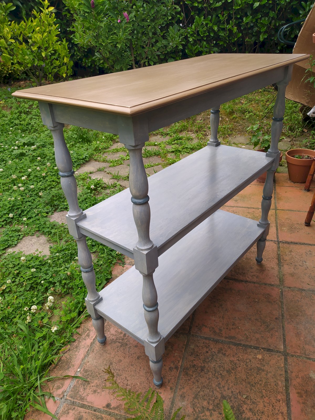 En bois peint en deux tons, gris clair nuancé et bleu gris. Plateau couleur bois.