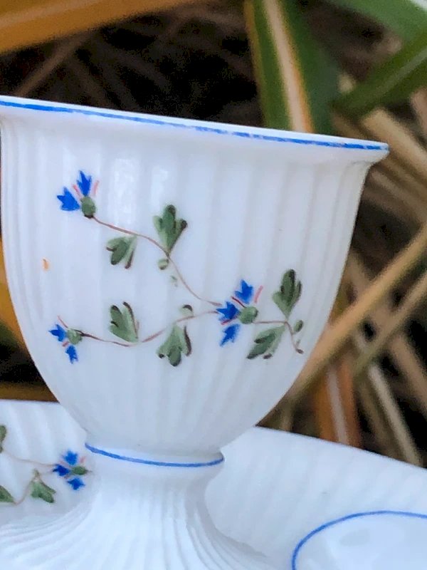 Coquetier porcelaine de MEHUN, frise plissée avec bleuets rouges et bleus
