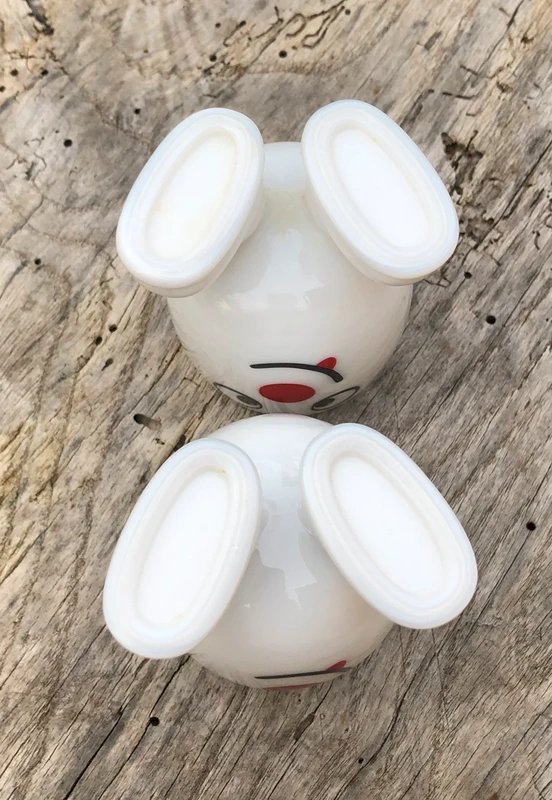 Joli coquetier vintage en verre couleur prune: 2 Lapins supportant le coquetier