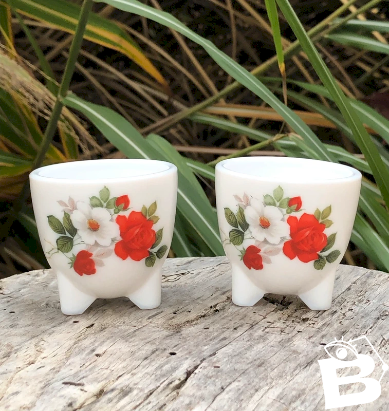 2 Coquetiers vintage Arcopal motifs fleurs rouges en excellent état