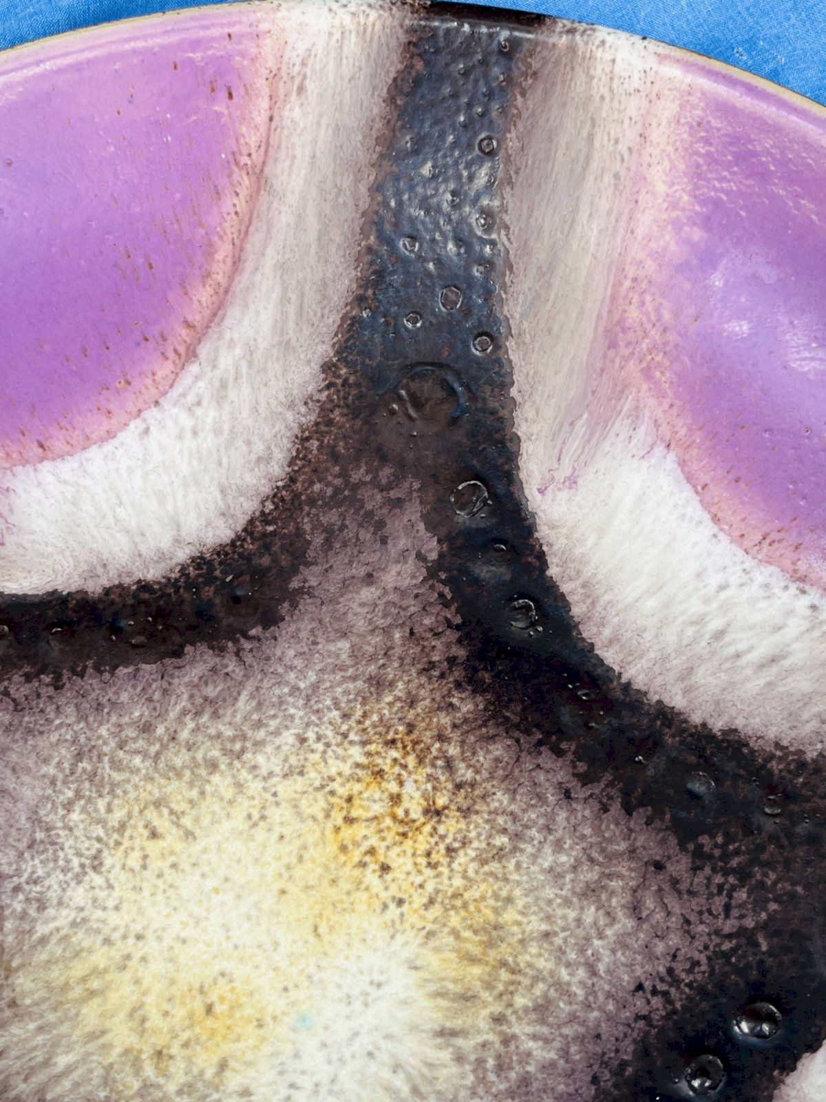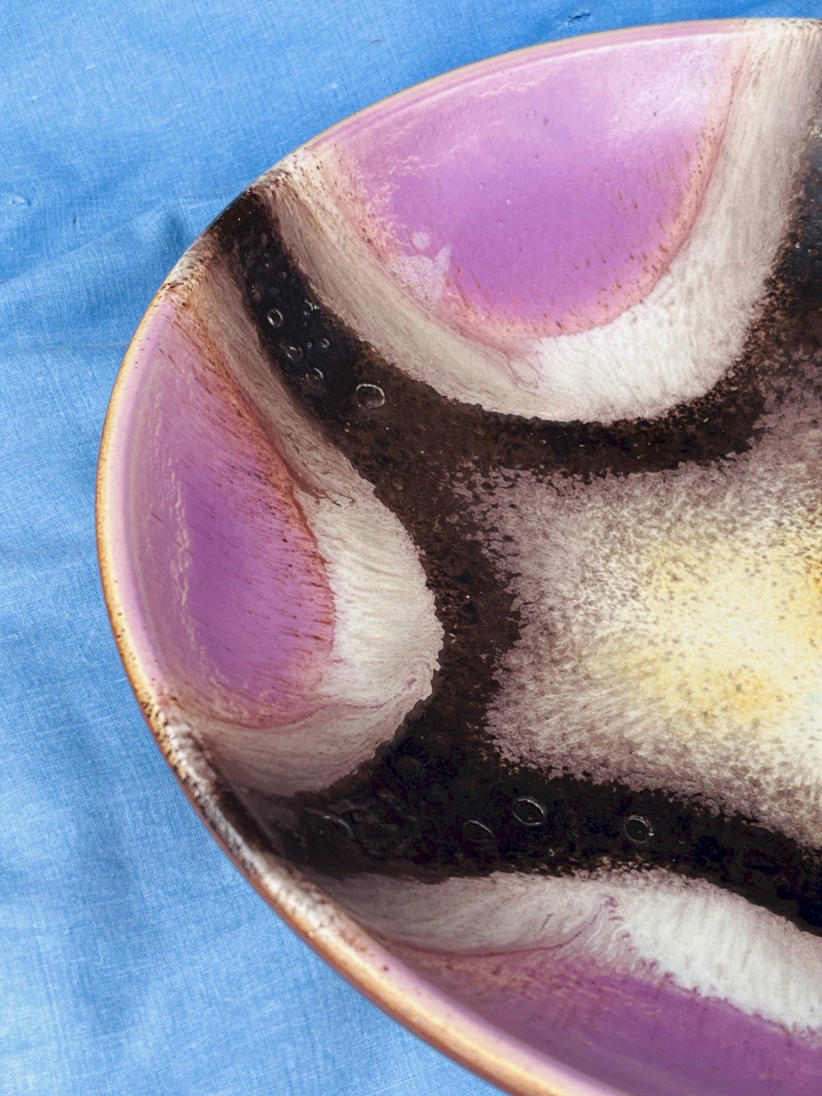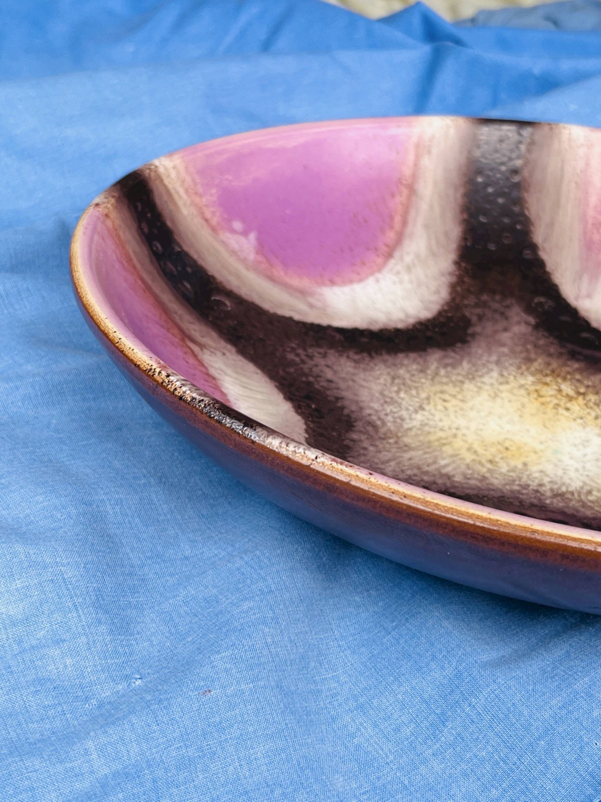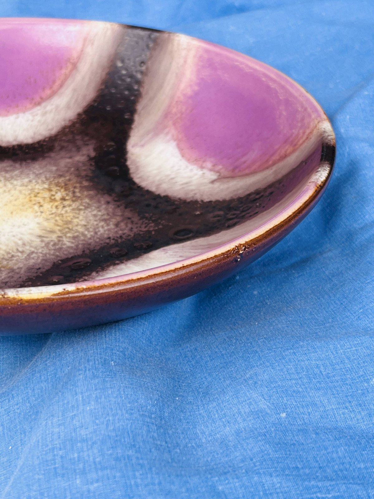 Ses teintes violettes et brunes vibrantes créent un motif captivant qui attire le regard, ce qui en fait une pièce maîtresse parfaite pour votre table à manger ou votre comptoir de cuisine.Fabriquée en céramique de haute qualité, cette coupe est aussi résistante qu'élégante.Son design unique témoigne du savoir-faire de la poterie ouest-allemande, réputée pour ses couleurs vives et ses motifs complexes.Idéale pour présenter des fruits, des objets décoratifs ou simplement comme œuvre d'art à part entière.Ne manquez pas l'occasion d'acquérir un morceau d'histoire alliant style et fonctionnalité.
