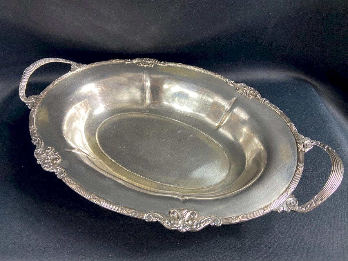 Corbeille à pain plat creux oblong à anses en métal argenté de style Louis XVI