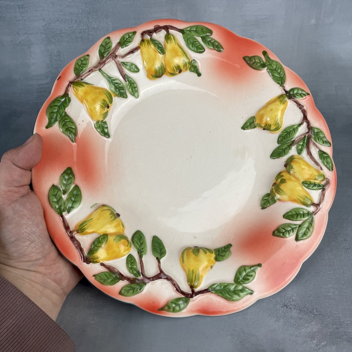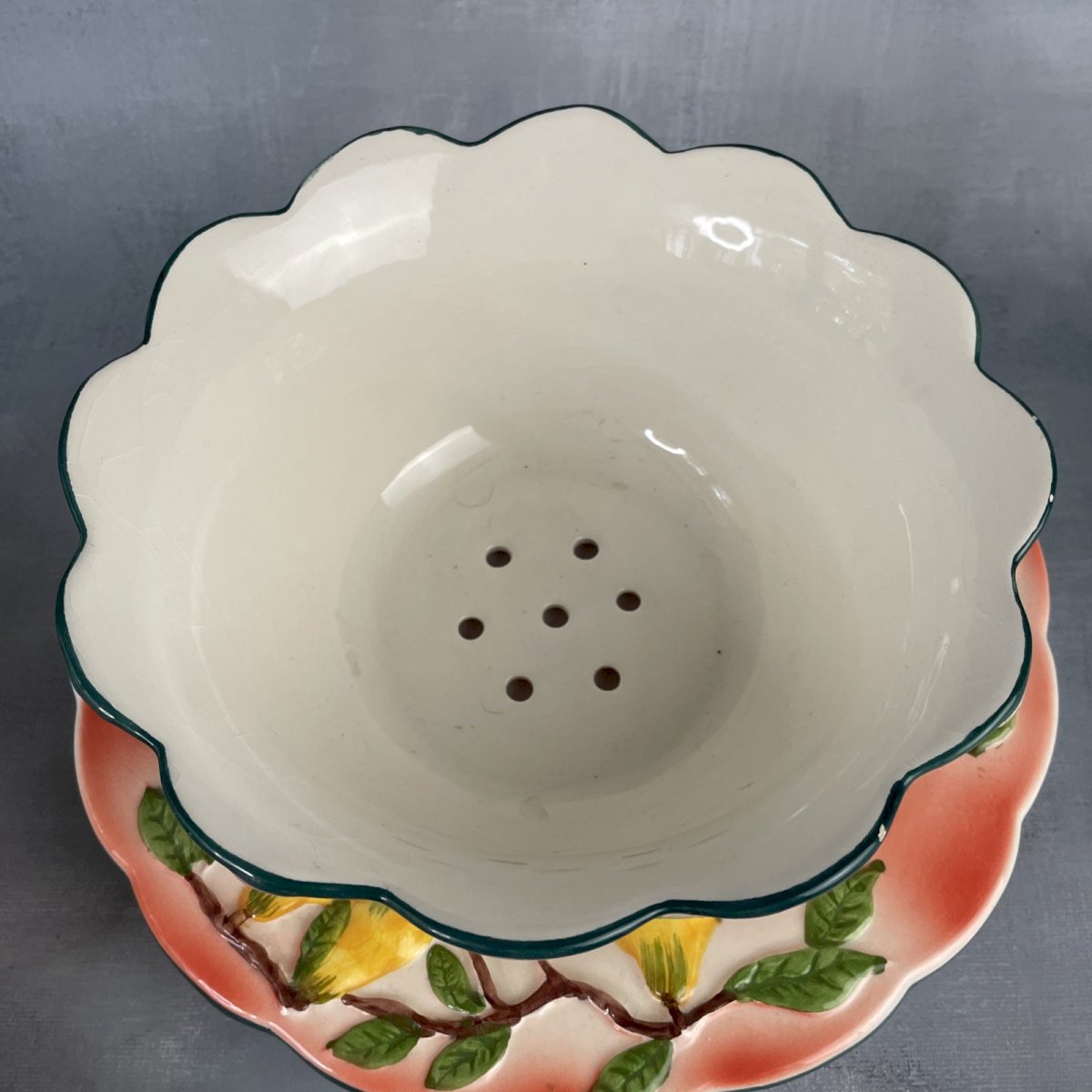 Corbeille coupe saladier égouttoir fruit avec assiette décor poire barbotine Fruit basket, salad bowl, drainer with pear barbotine decoration plate Hauteur saladier ~ 9.5 cm Diamètre saladier ~ 20.3 cm Diamètre assiette ~ 26 cm Poids total ~ 1.5 kg Excellent état, 3 minuscule égrenures sur le bord du saladier, voir photos Pensez à grouper vos achats pour réduire les frais de port ! Autres tarifs sur demande