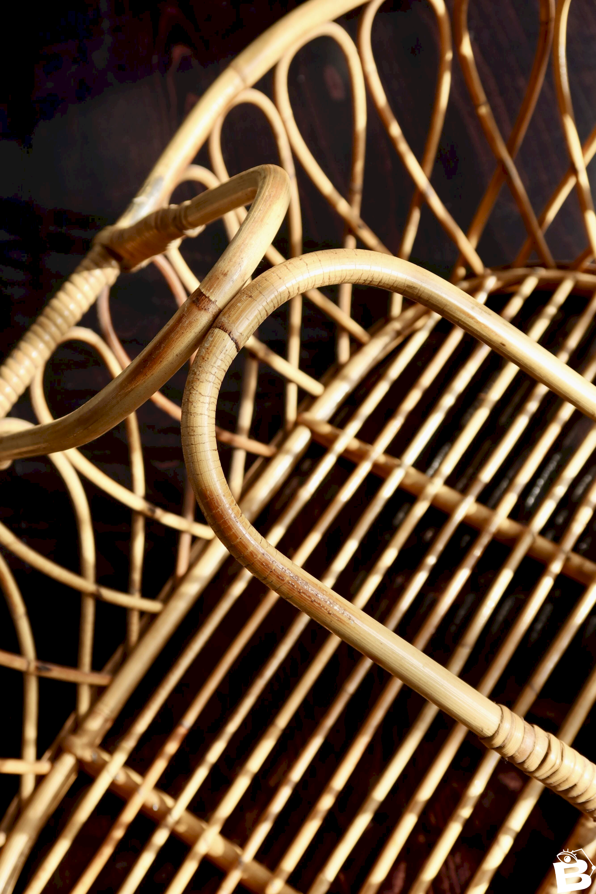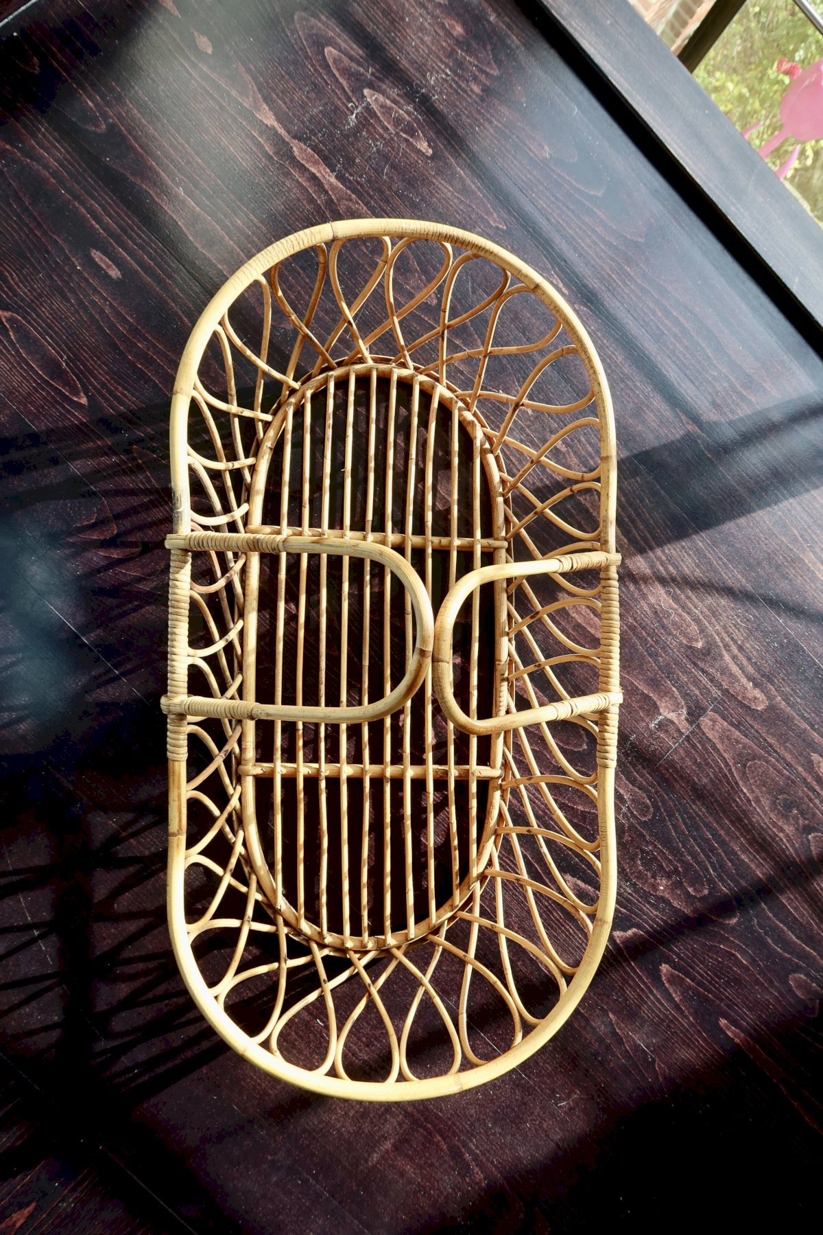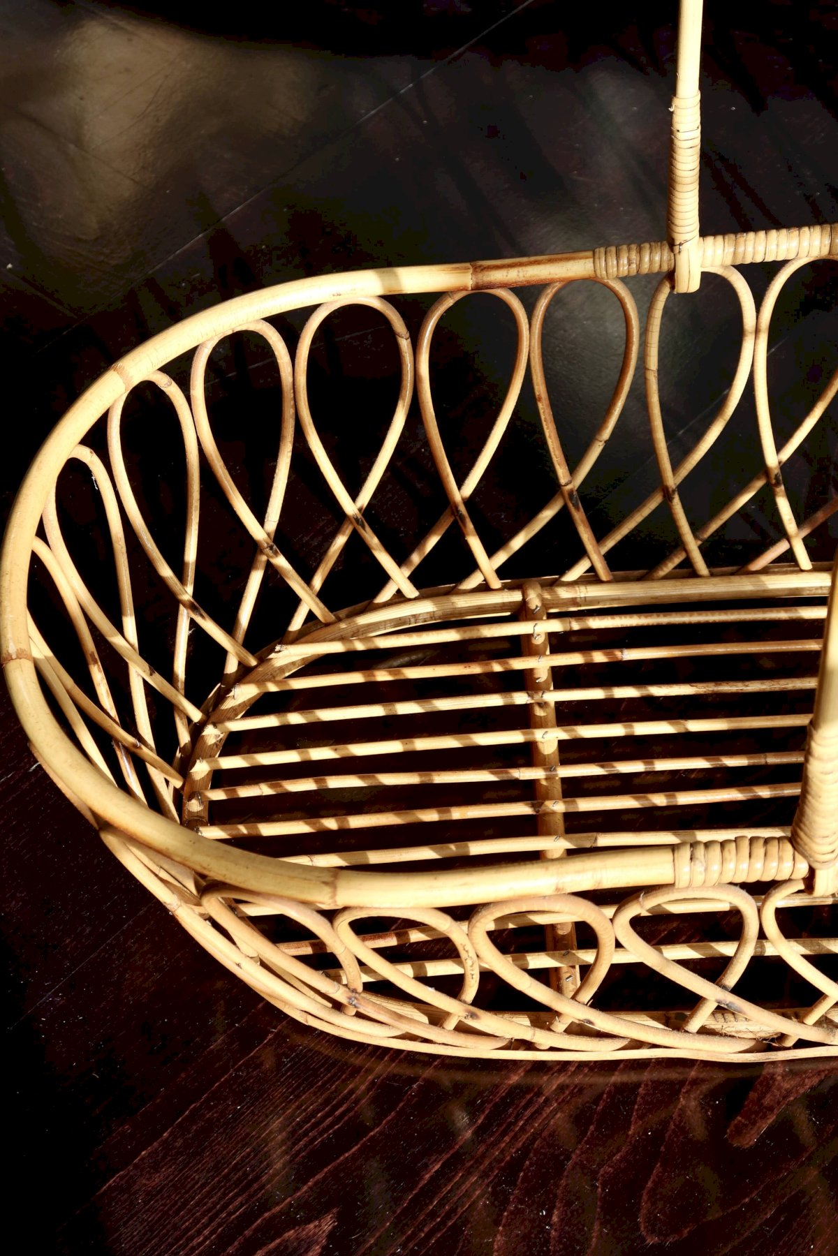 Grand couffin ovale en rotin couleur miel au joli tressage en boucles, anses centrales gainées et belle patine homogène; structure solide, petites marques d’usage compatibles avec l’âge.Parfait en déco dans une chambre d’enfant pour ranger plaids, doudous ou couches, ou encore comme panier de présentation lors d’une séance photo.Sécurité: pièce décorative non homologuée pour le couchage d’un bébé.Dimensions approximatives: Longueur 50cm X Hauteur 25cm X Profondeur 40cm.