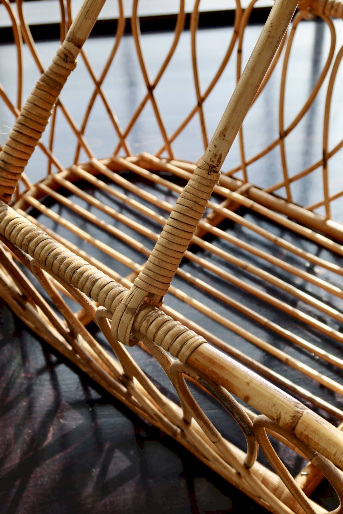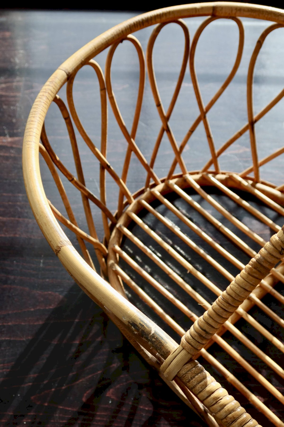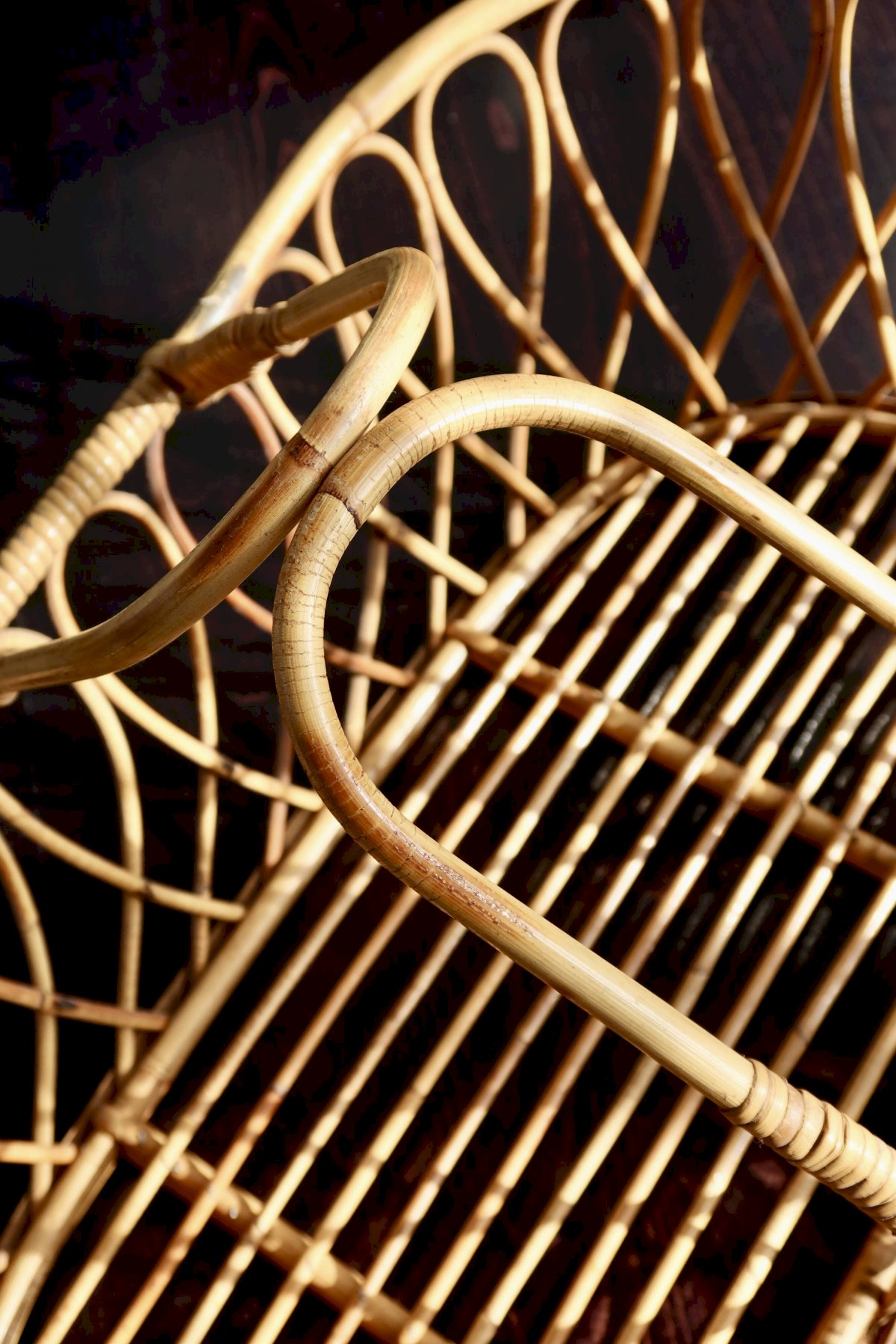 Grand couffin ovale en rotin couleur miel au joli tressage en boucles, anses centrales gainées et belle patine homogène; structure solide, petites marques d’usage compatibles avec l’âge.Parfait en déco dans une chambre d’enfant pour ranger plaids, doudous ou couches, ou encore comme panier de présentation lors d’une séance photo.Sécurité: pièce décorative non homologuée pour le couchage d’un bébé.Dimensions approximatives: Longueur 50cm X Hauteur 25cm X Profondeur 40cm.