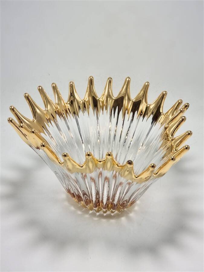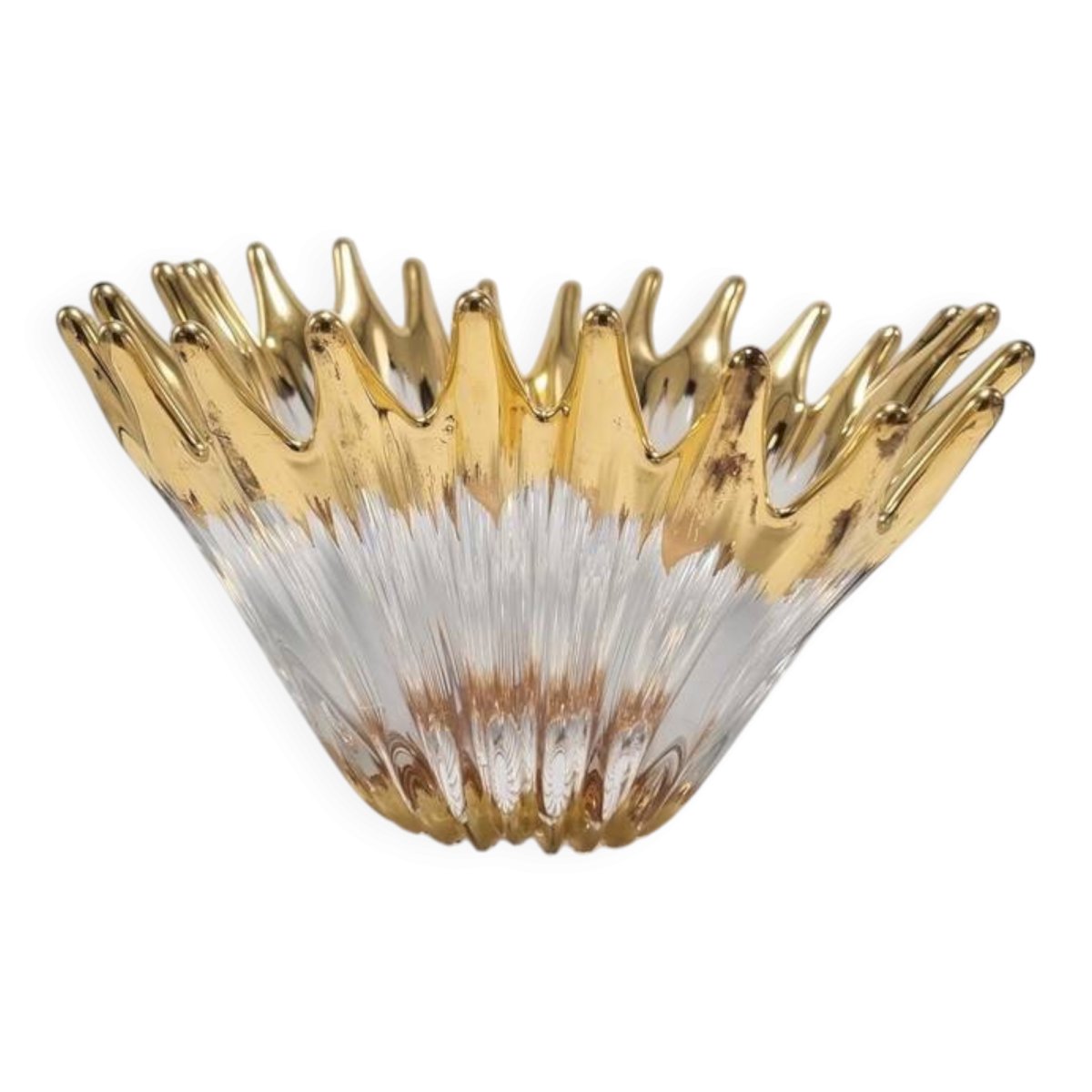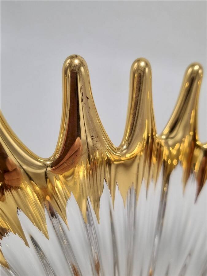 Coupe Cristallerie De Bayel, des années 50, forme en pointes aux bouts arrondis de couleur dorée rappelant des flammes.La dorure présente quelques traces d’usure ici et là, toutefois rien d’important n’est à signaler, la coupe est en très bon état général.Dimensions moyennes: 30 X 28 X H 17.5 cm.Poids: 2.4 kg.