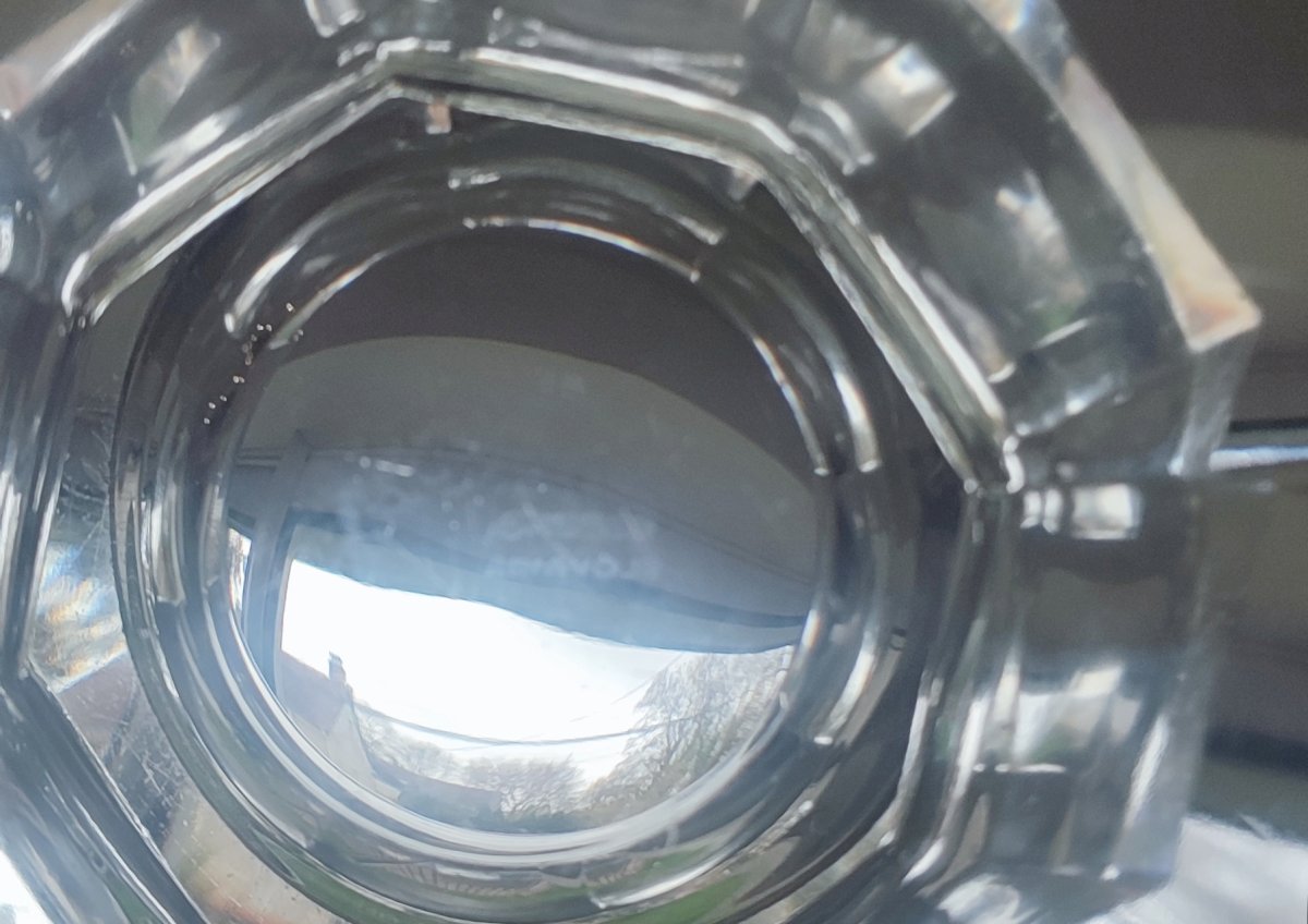 Esthétique géométrique et architecturée, avec ses pans coupés, ses lignes et anses tendues et son pied facetté, illustre parfaitement le style Art Déco ainsi que les formes caractéristiques de la verrerie d’Europe centrale, connue pour son travail du verre moulé précis et très sculptural qui en fait une pièce décorative de caractère