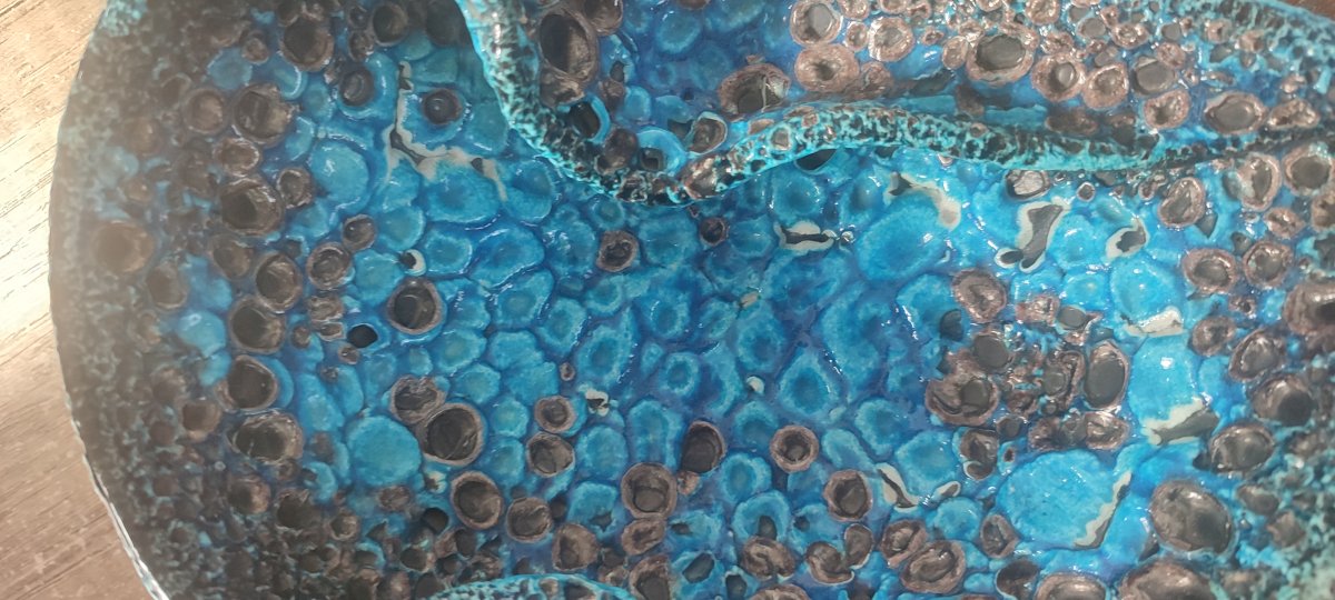 Émail épais bleu turquoise à effets bullés et cratérisés, typique des émaux Cyclope.