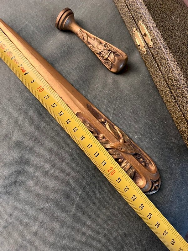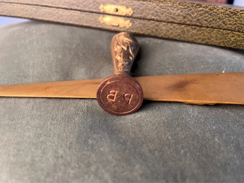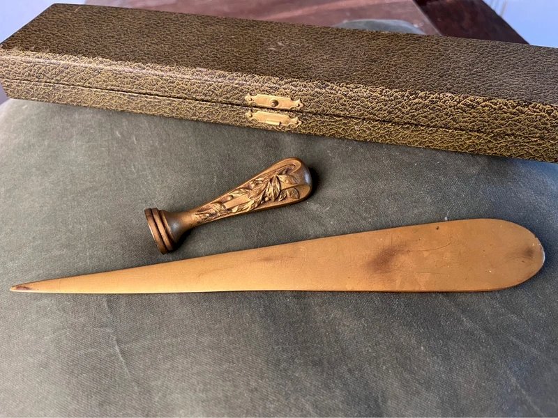 Très bon état, le coupe papier présente quelques rayures au dos (bien regarder les photos et zoomer) Poids total 335gr.
