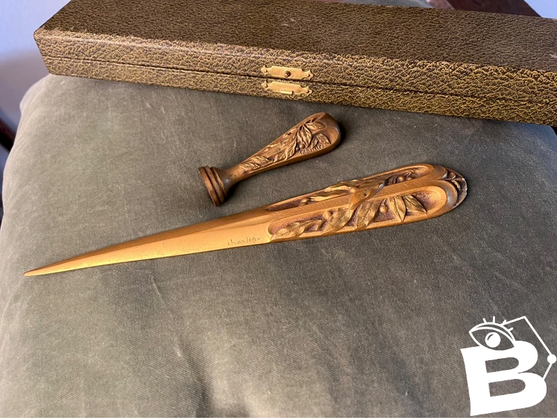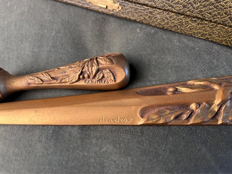 Coupe papier et cachet en bronze (1970/1975) signés Charles (Christiane Charles) à décor de style Art Nouveau de feuillages et de fruits.