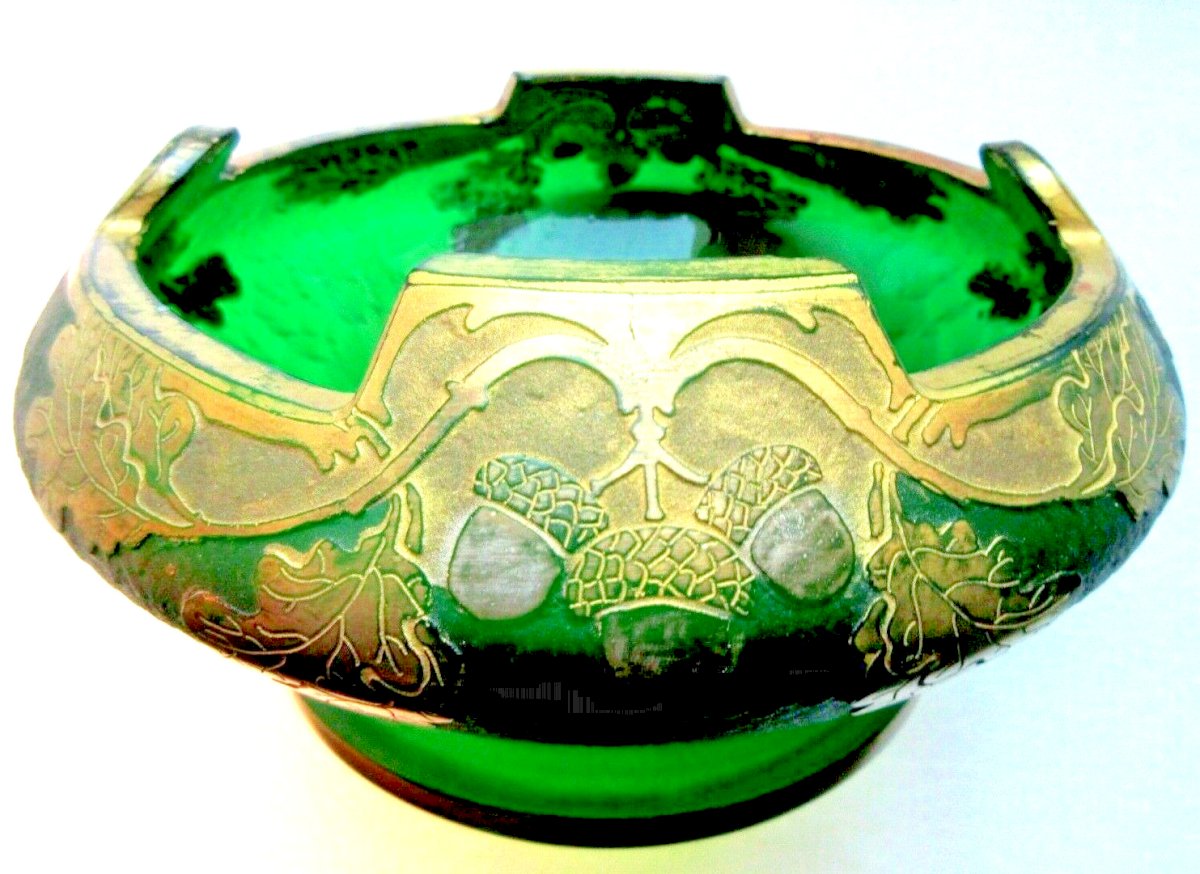 Coupe signée Legras, Montjoye, Verre vert Dégagé à l'Acide, chêne et glands Or