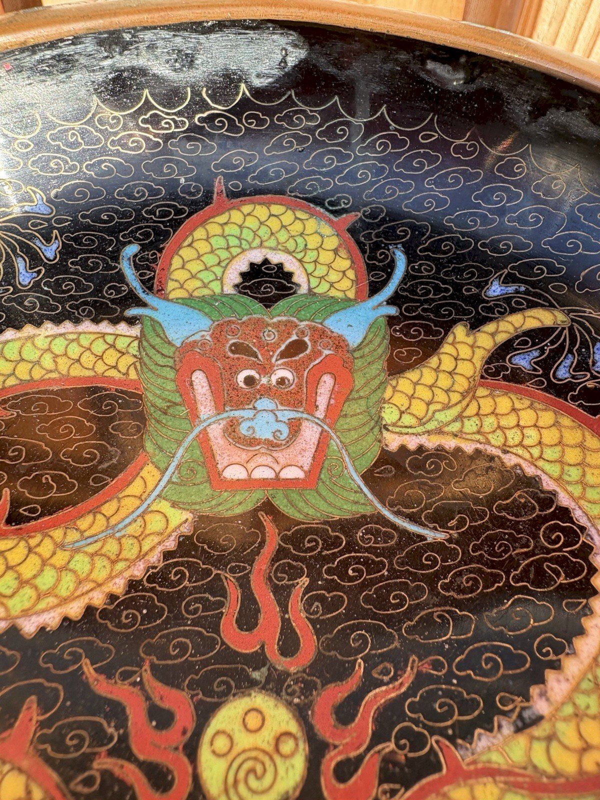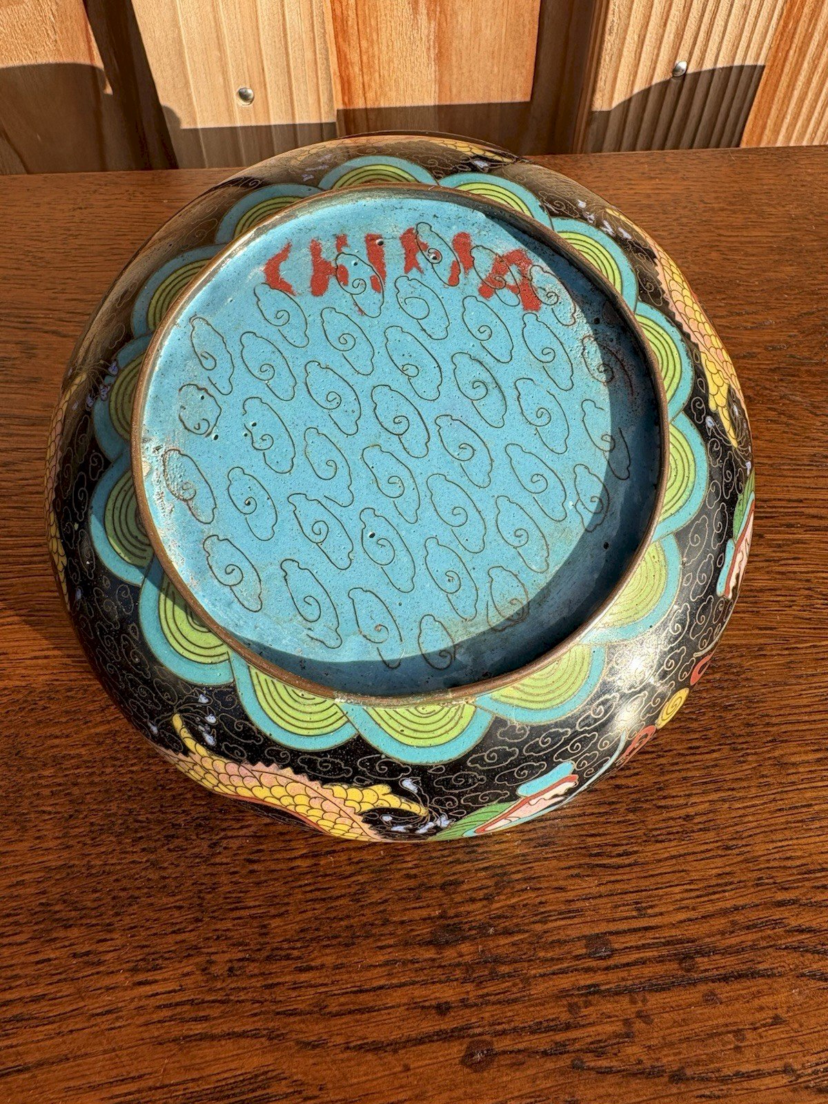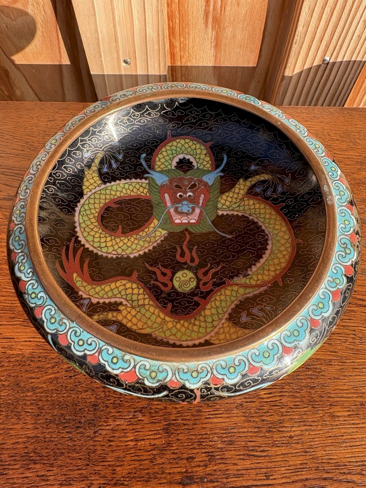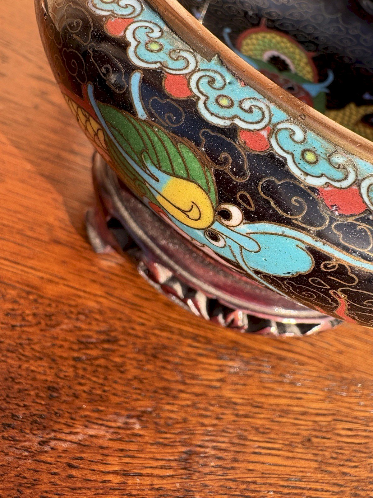 Superbe petite coupelle en cloisonné chinois, décorée d’un dragon impérial à cinq griffes sur fond de nuages stylisés. Émail polychrome sur cuivre, fond intérieur noir et extérieur turquoise orné de nuages dorés. Marquage rouge CHINA au revers, indiquant une fabrication pour l’exportation (vers 1930–1950). Vendue avec son socle en bois sculpté d’origine. ? État : Très bon état général pour son âge. Légères traces d’usure sur le cuivre et micro-irregularités de l’émail, sans fêlure ni restauration. Belle patine du cuivre et du bois. ⸻ ? Expédition : Envoi très soigné et protégé, avec double emballage. ➡️ Les envois vers les États-Unis et le Royaume-Uni peuvent engendrer des frais de port supplémentaires. Merci de me contacter avant achat pour un devis précis. Matière:Cuivre Authenticité:Original Type:Objet de vitrine, Décoratif Poids:271 gr Période:Design du XXème Origine:Chine Pays d'origine:Chine Hauteur:4,5 cm Style:1940-1960 Largeur:14 cm