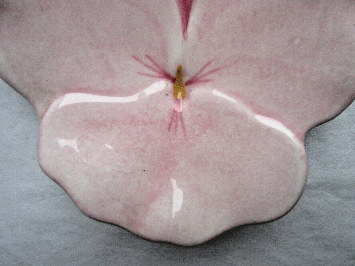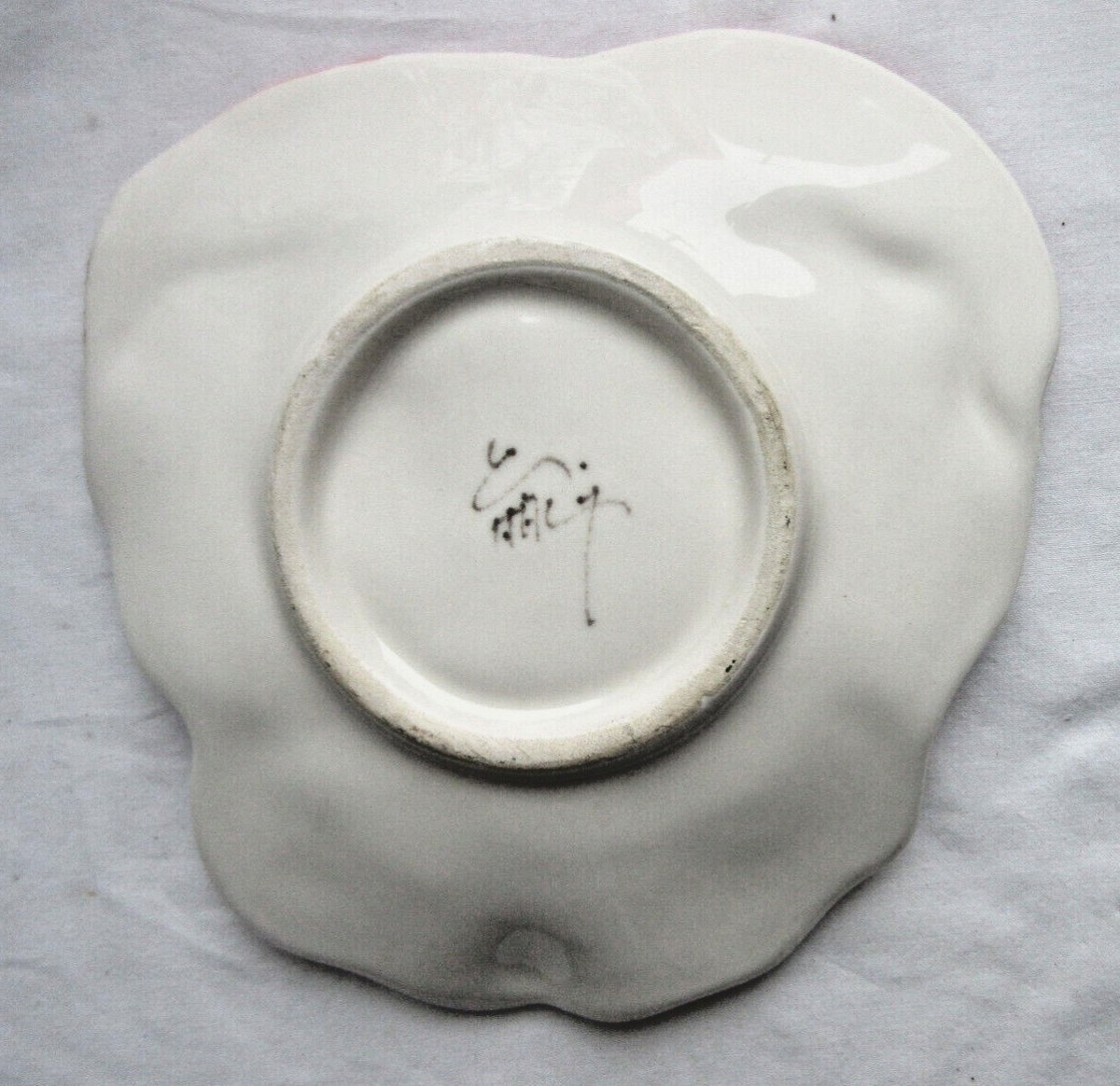 Vente dans le monde entier. Coupelle: Une Pensée. Superbe coupelle en forme de pensée. 2 pétales rouges et 3 pétales roses avec le coeur jaune. Elle repose sur un talon. Dessous, voir signature. Dimensions: 17 cm X 16 cm. Bon état. Les photos complètent la description.
