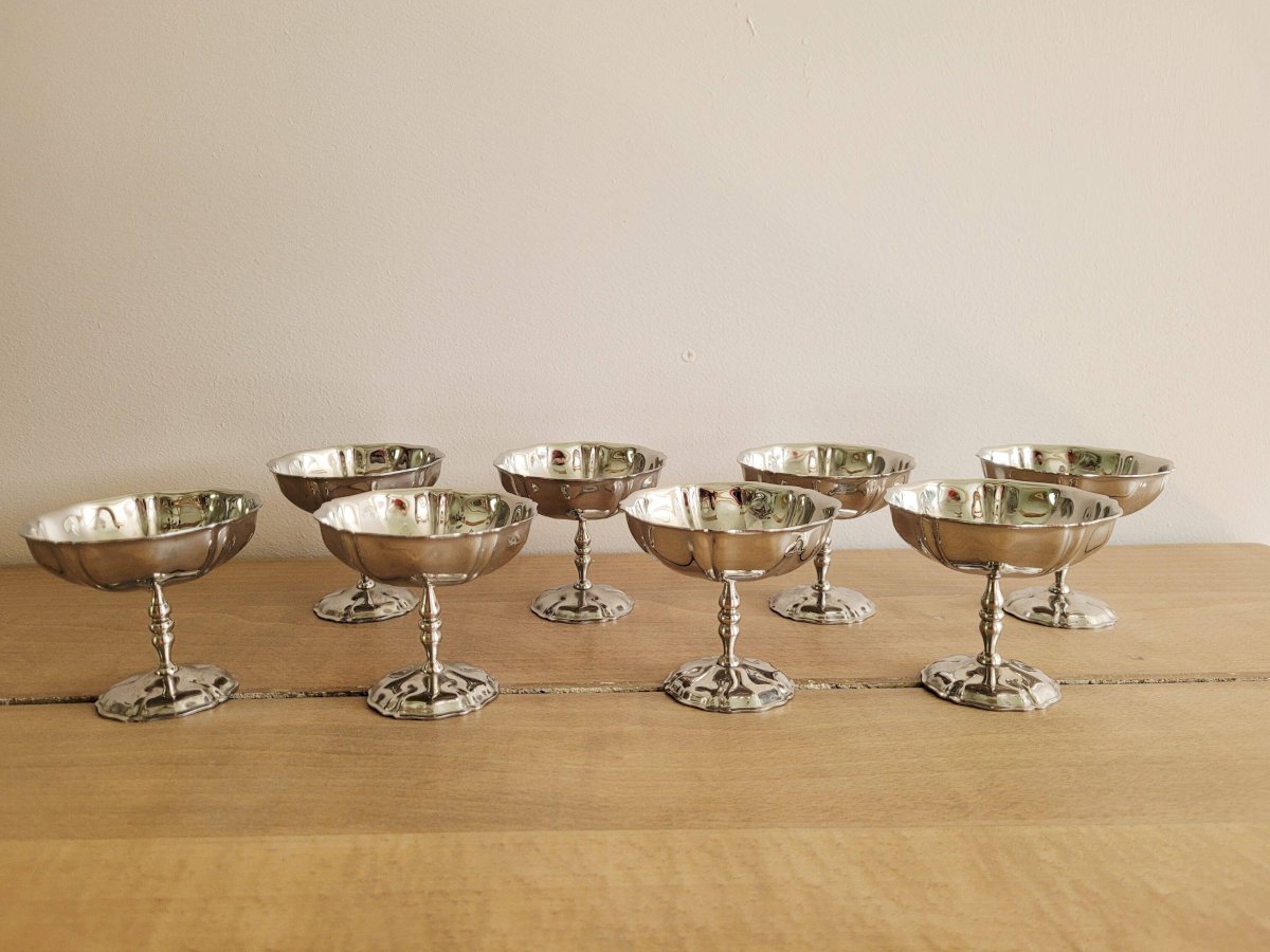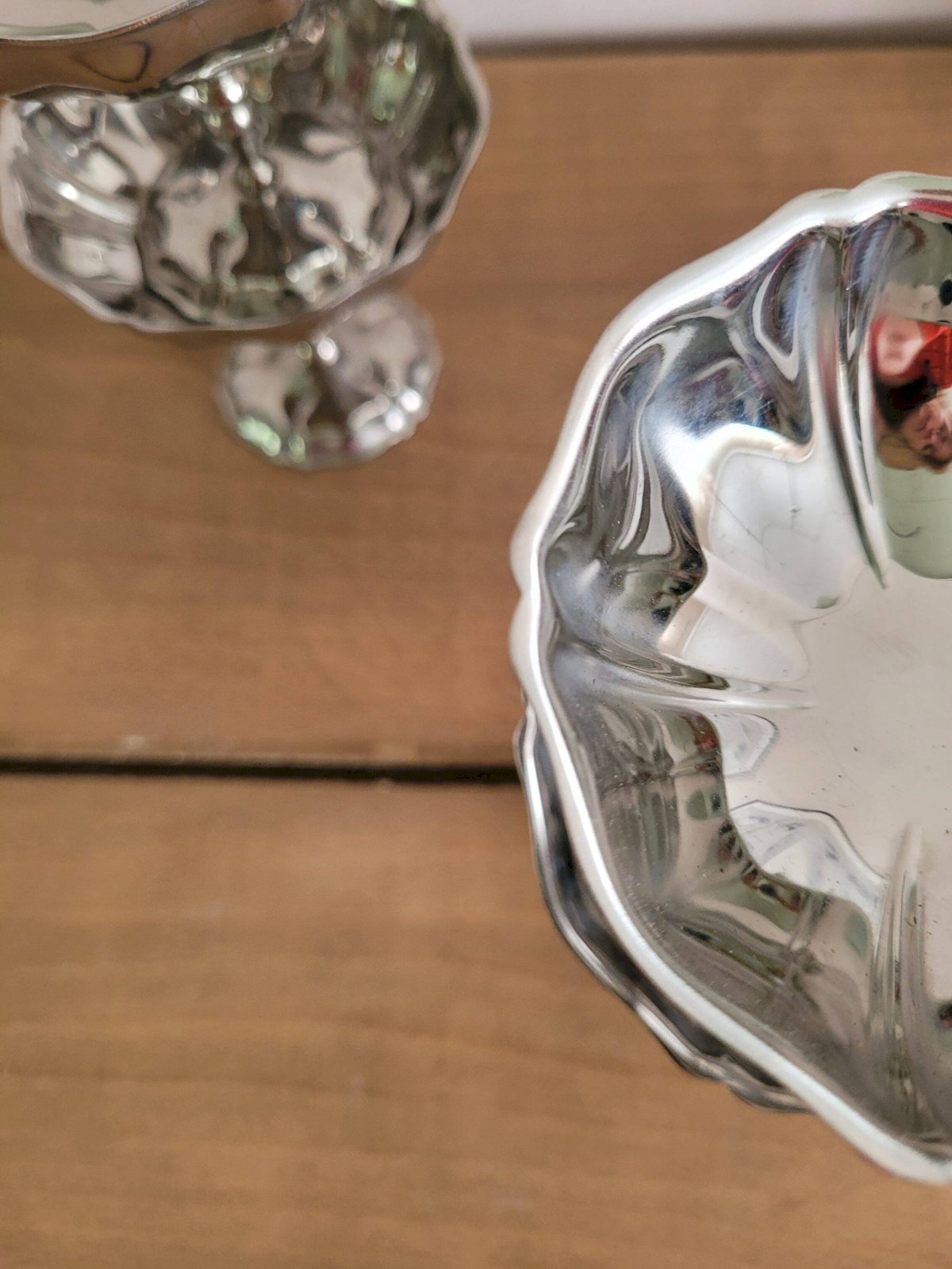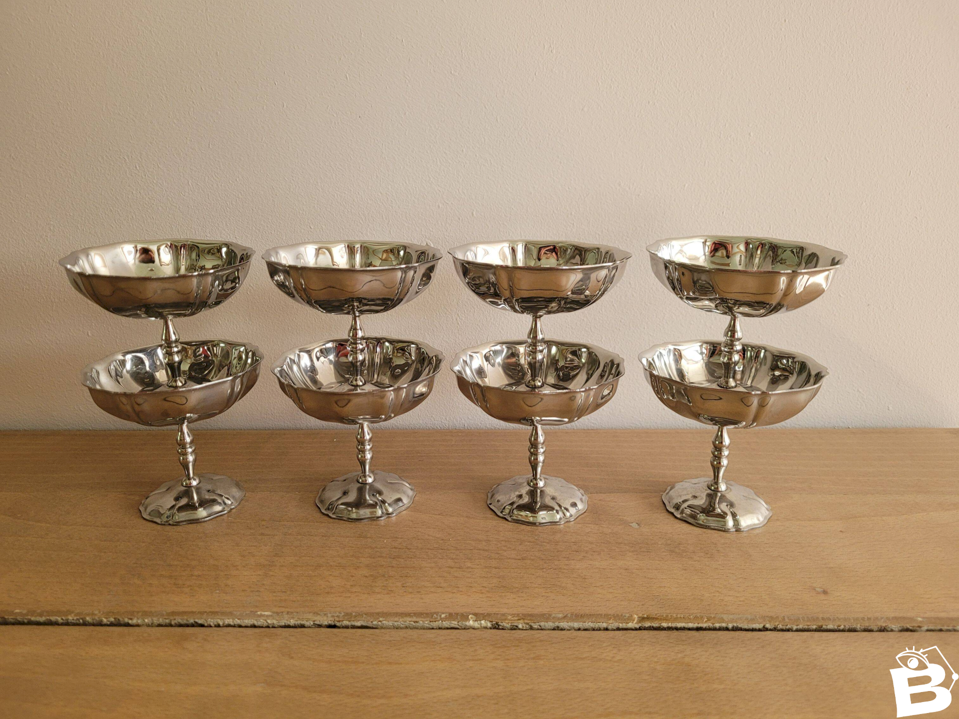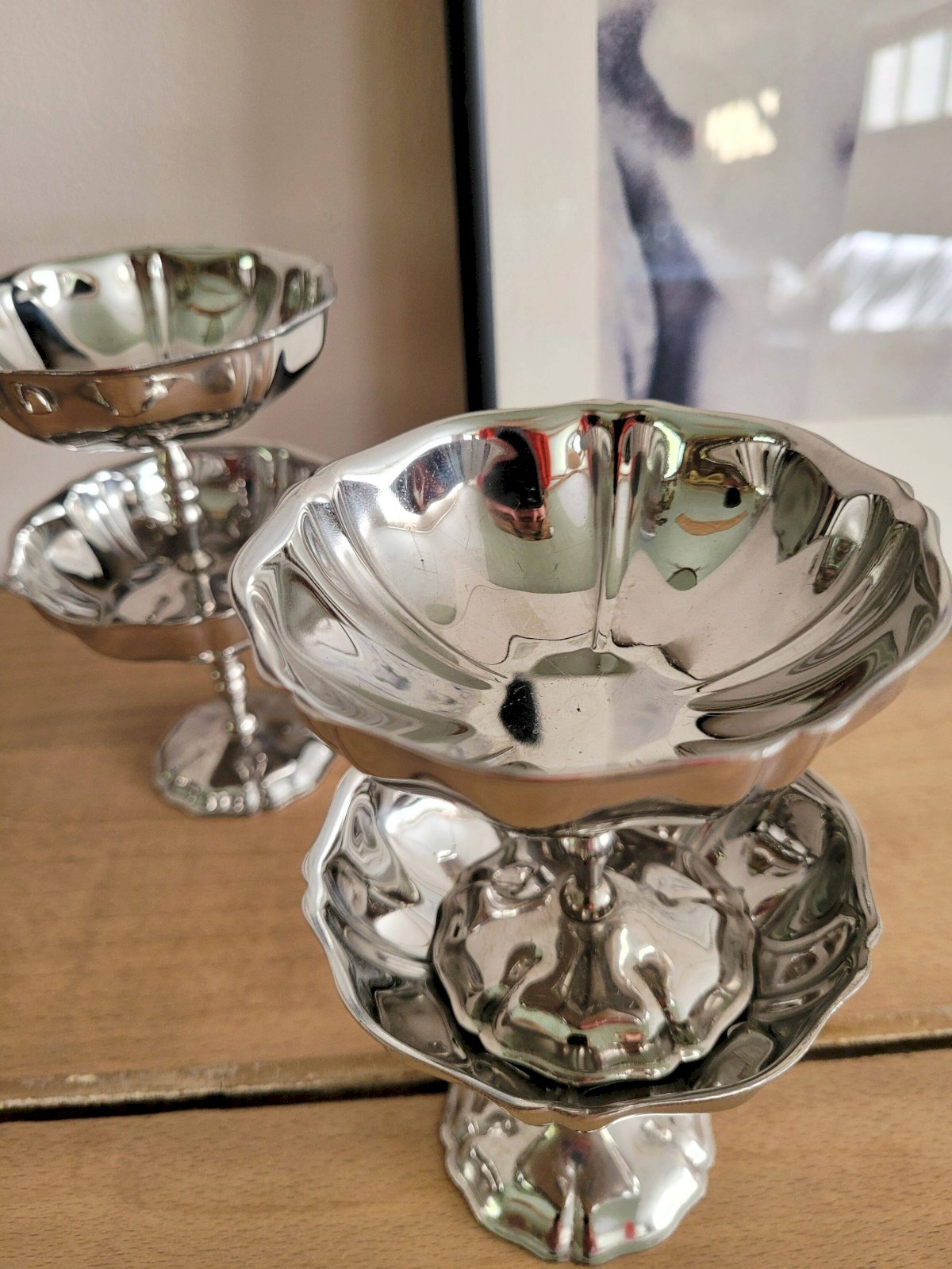 En forme de fleur, joliment travaillées, ce lot en inox est très chic ! Le retour d’une pièce des années 70 à avoir chez soi.En bon état général.Dimensions:Diamètre: 9 cm.Hauteur: 8 cm.Envoi possible par la Poste!.